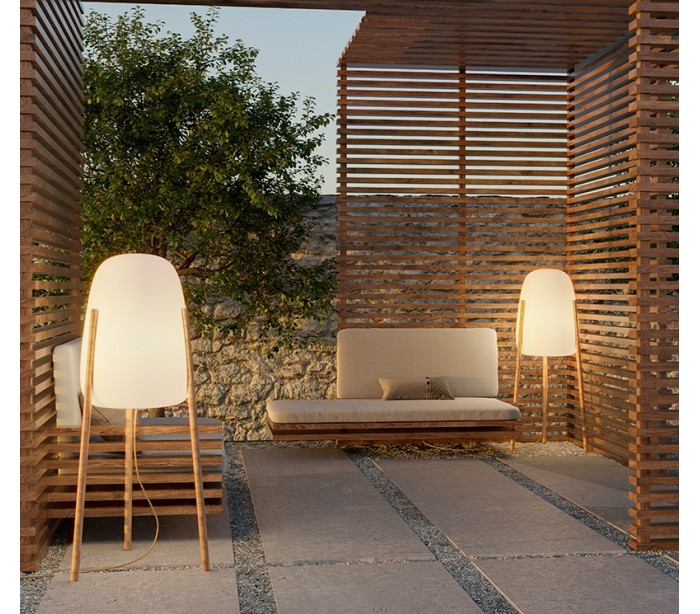 Dekorativ trådløs udendørs gulvlampe fremstillet i hvid polyethylene og naturfarvet træ. Lampen oplades via AC/DC adapter, der går direkte i stikkontakten og er med 1,5 meter ledning. Lampen måler 144,3 cm i højden og 50,3 cm i skærmdiameter.
