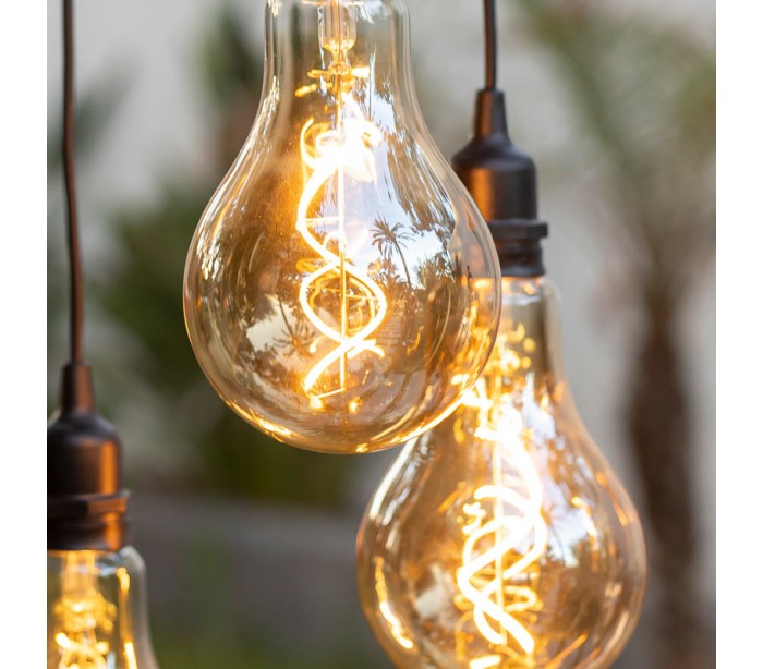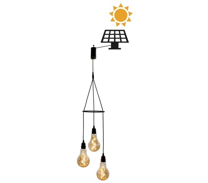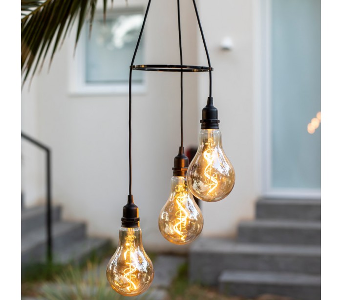 Dekorativ udendørs loftlampe fremstillet i sort kunststof/ledning og med vintage lyskilder. Lampen kommer med trådløs opladelig lyskilde, der oplades via USB stik. Lampen måler op til 65 cm i højden. Der medfølger ekstra lyskilder samt solcelle oplader.