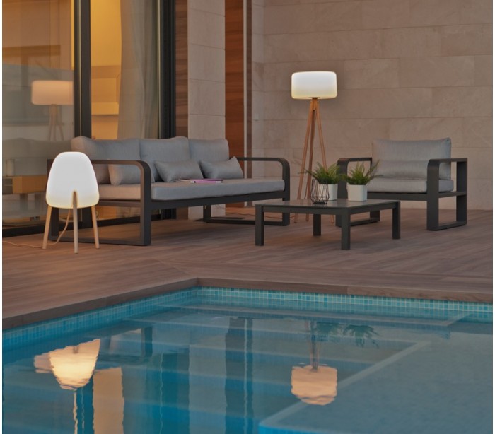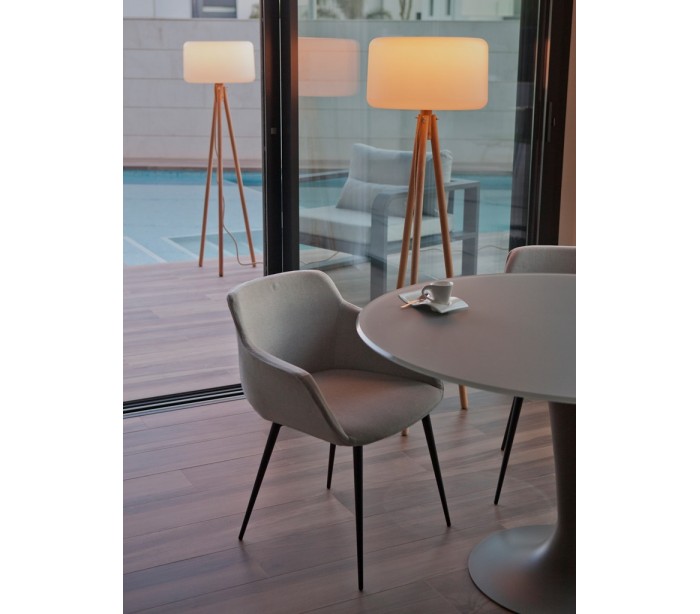 Dekorativ trådløs udendørs gulvlampe fremstillet i hvid polyethylene og naturfarvet træ. Lampen oplades via AC/DC adapter, der går direkte i stikkontakten og er med 1,5 meter ledning. Lampen måler 140 cm i højden og 45 cm i skærmdiameter.
