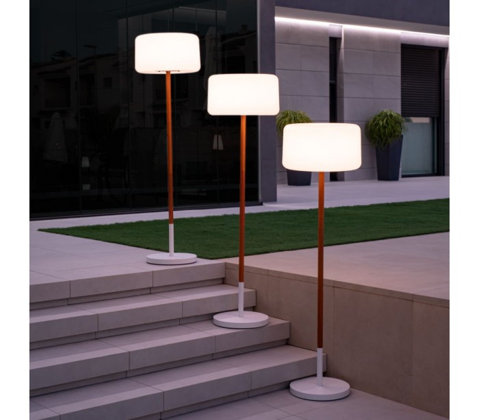 Dekorativ trådløs udendørs 5-i-1 lampe fremstillet i hvid polyethylene og naturfarve træ. Lampen oplades via AC/DC adapter, der går direkte i stikkontakten og er med 1,5 meter ledning. Lampen måler 50 - 155 cm i højden og 45 cm i skærmdiameter.