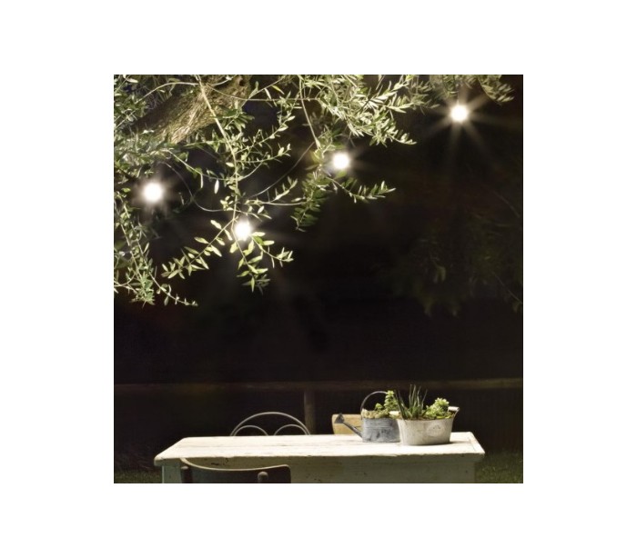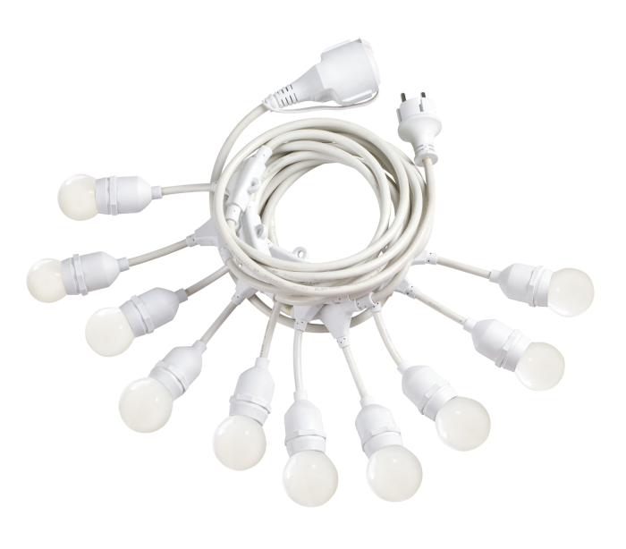 Fiesta udendørs lyskæde i et dekorativt design, fremstillet i hvid kunststof. Lyskæden måler 605 cm i længden og anvender 10 x E27 lyskilder (Inkl.).