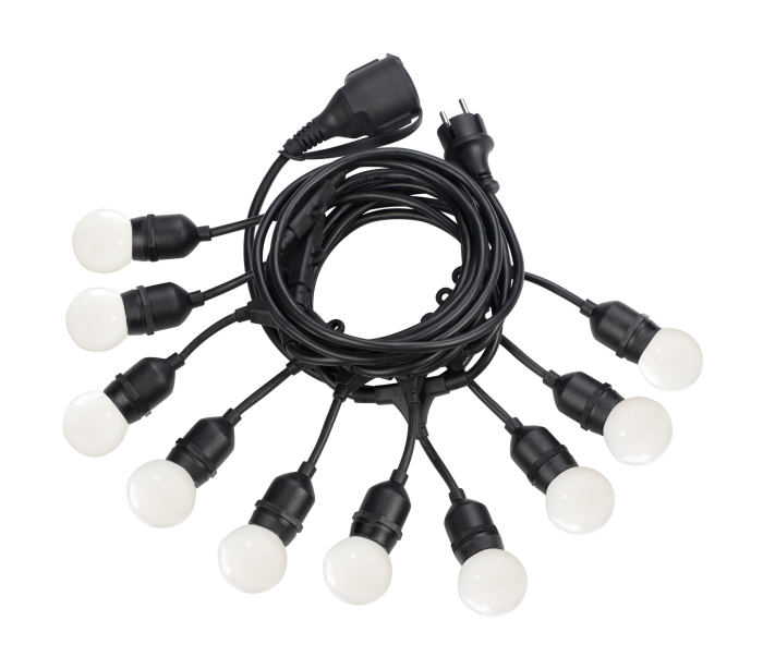 Fiesta udendørs lyskæde i et dekorativt design, fremstillet i sort kunststof. Lyskæden måler 605 cm i længden og anvender 10 x E27 lyskilder (Inkl.).