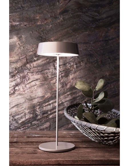 Indendørs eller udendørs trådløs opladelig bordlampe udført i et moderne design af grålakeret aluminium. Lampen måler 30 cm i højden og oplades via usb-c stik (inkl.). Lampen anvender 1 x 2,2W lyskilde, der giver et hyggeligt lys når mørket falder på. Lampen er dæmpbar via knap. Lampen holder strøm i op til 10 timer, afhængig af opladning og temperatur. Lampefoden har magnet til at holde skærmen fast.