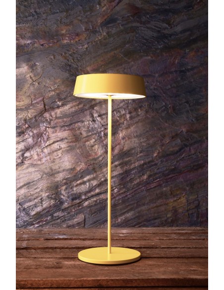Indendørs eller udendørs trådløs opladelig bordlampe udført i et moderne design af gul lakeret aluminium. Lampen måler 30 cm i højden og oplades via usb-c (inkl.). Lampen anvender 1 x 2,2W lyskilde, der giver et hyggeligt lys når mørket falder på. Lampen er dæmpbar via knap. Lampen holder strøm i op til 10 timer, afhængig af opladning og temperatur. Lampefoden har magnet til at holde skærmen fast.