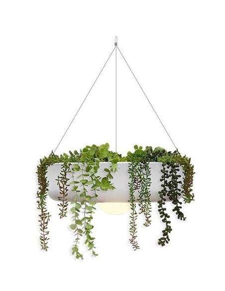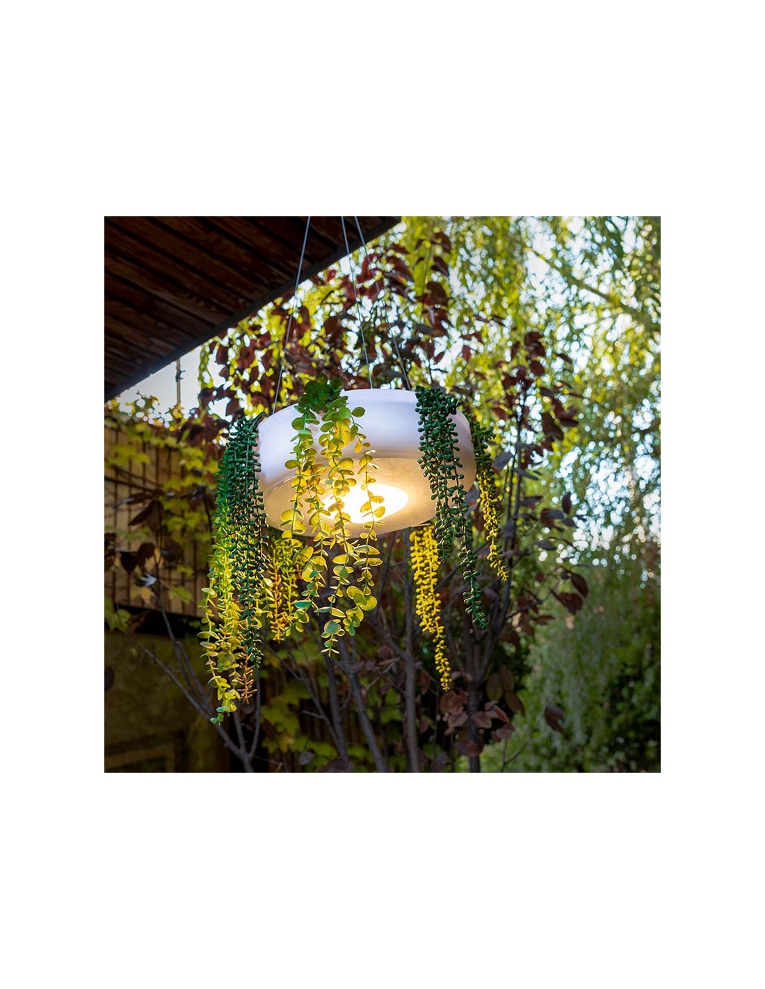 Dekorativ udendørs loftlampe fremstillet i hvid polyethylene og grønne kunstplanter. Lampen kommer med trådløs opladelig lyskilde, der oplades via USB stik. Lampen måler 39 cm i diameter.
