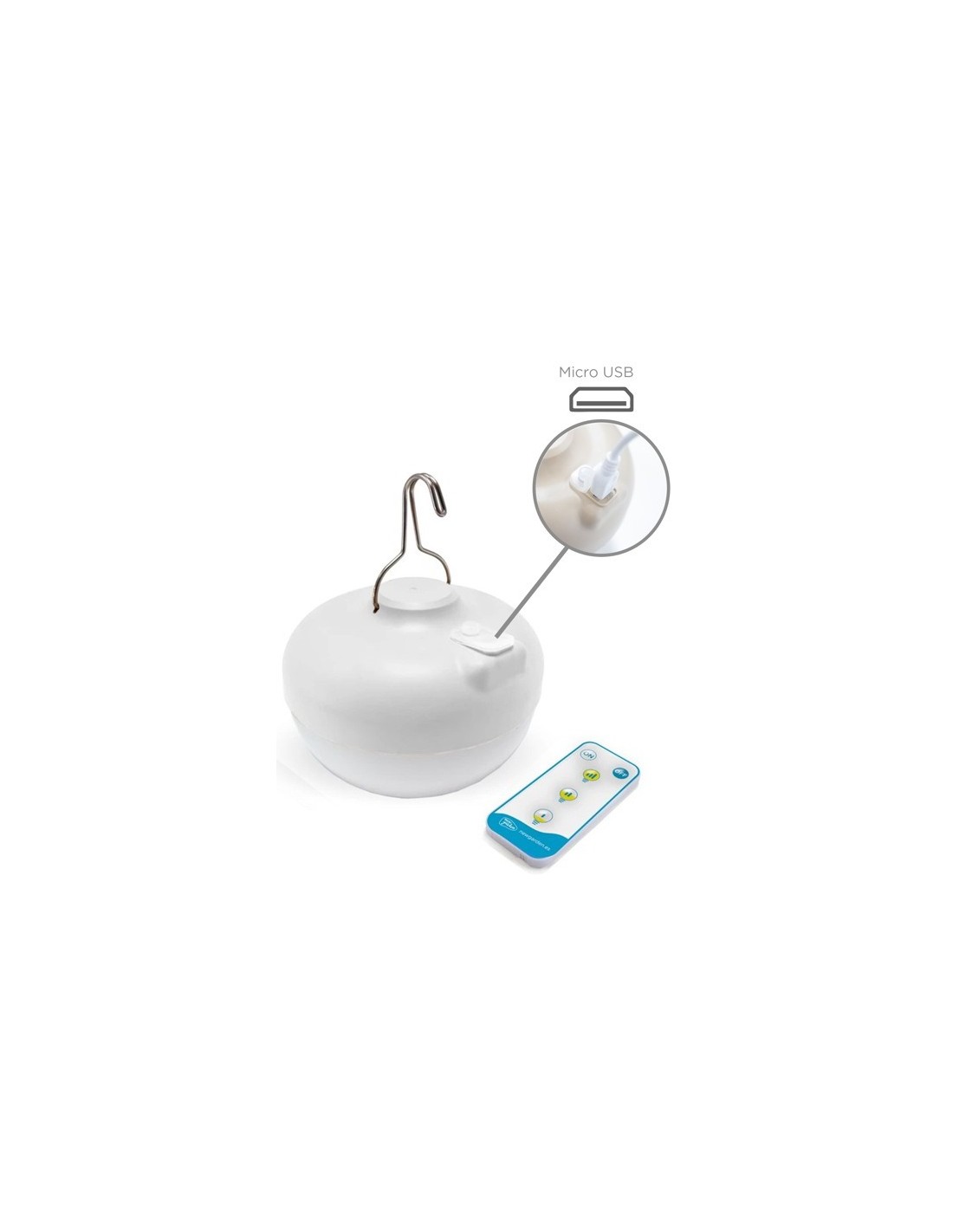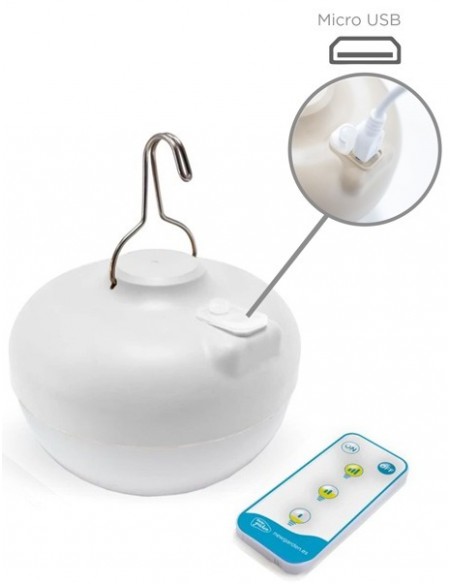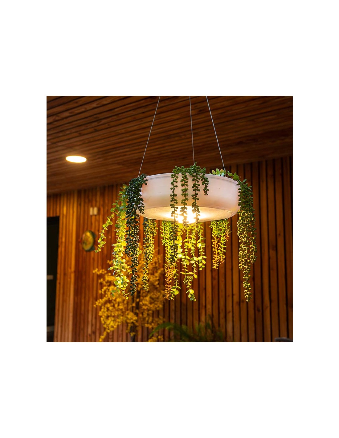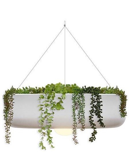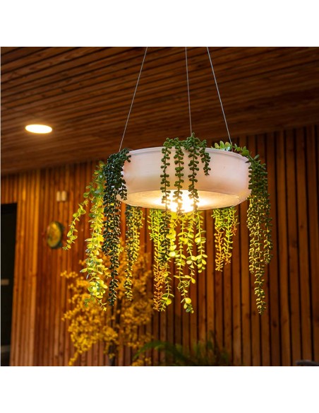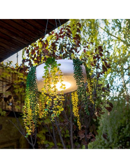 Dekorativ udendørs loftlampe fremstillet i hvid polyethylene og grønne kunstplanter. Lampen kommer med trådløs opladelig lyskilde, der oplades via USB stik. Lampen måler 59 cm i diameter.