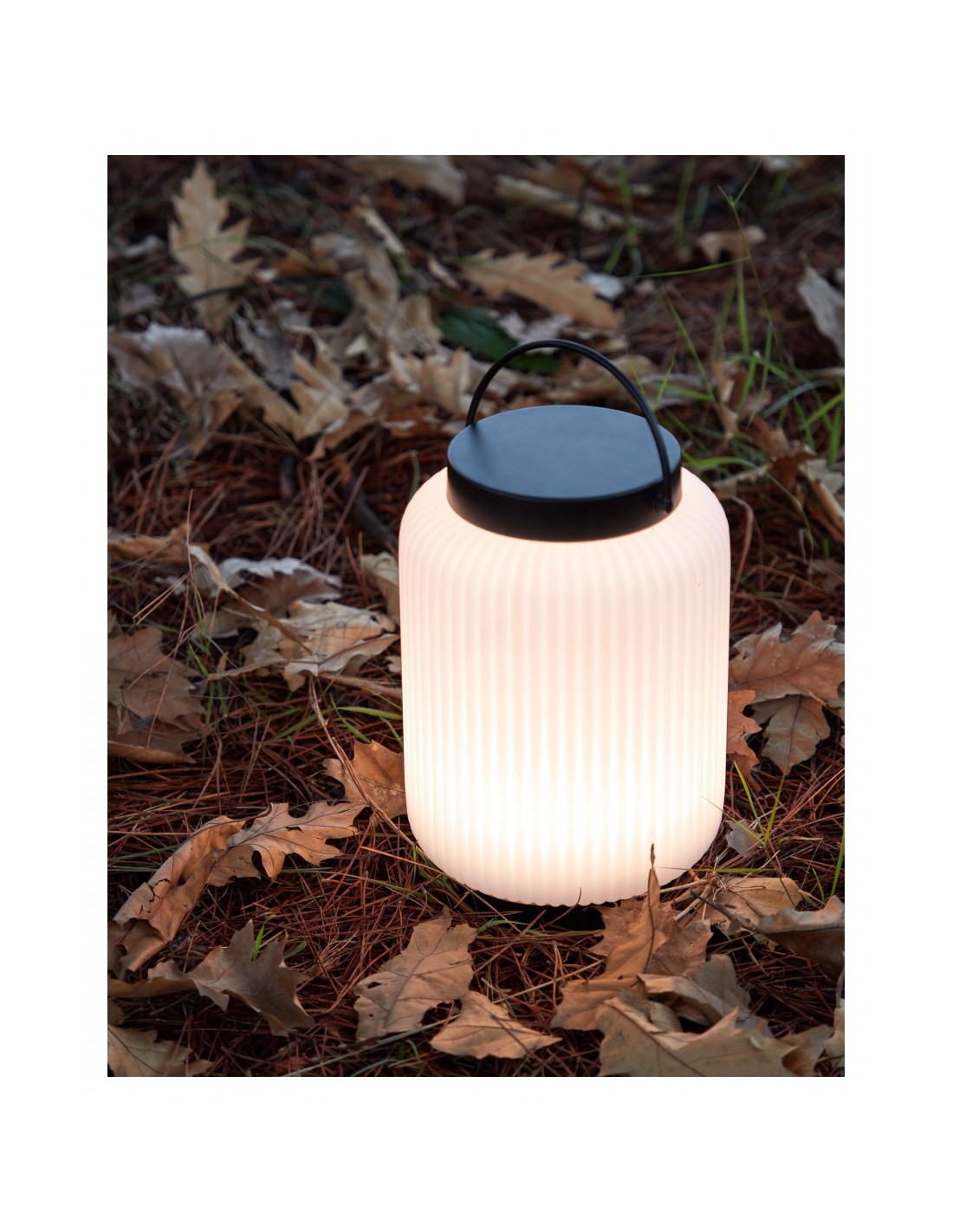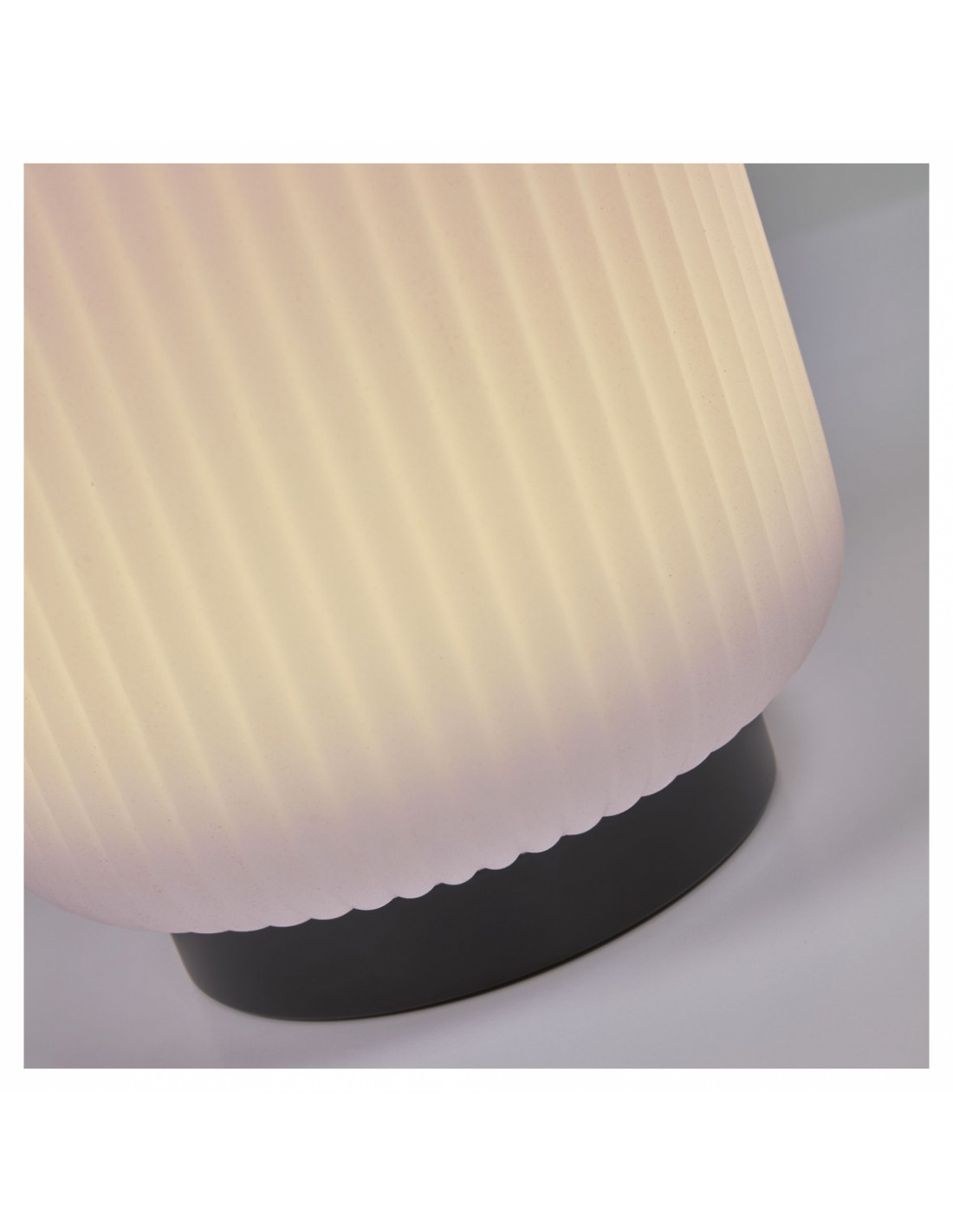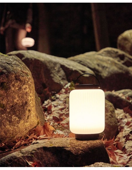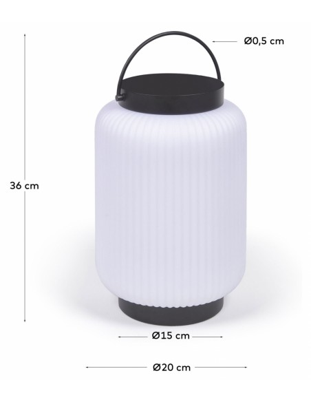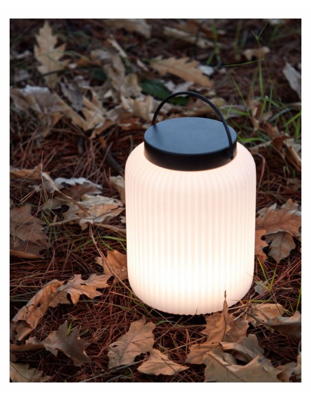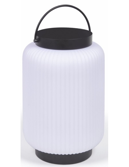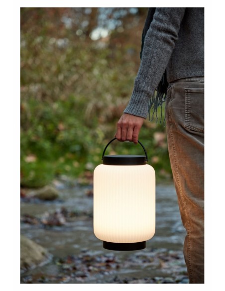 Dekorativ udendørslampe fremstillet i sort kunststof og hvid polyethylene. Lampen kommer med trådløs opladelig lyskilde, der oplades via USB stik. Lampen måler 36 cm i højden og 20 cm i skærmdiameter.