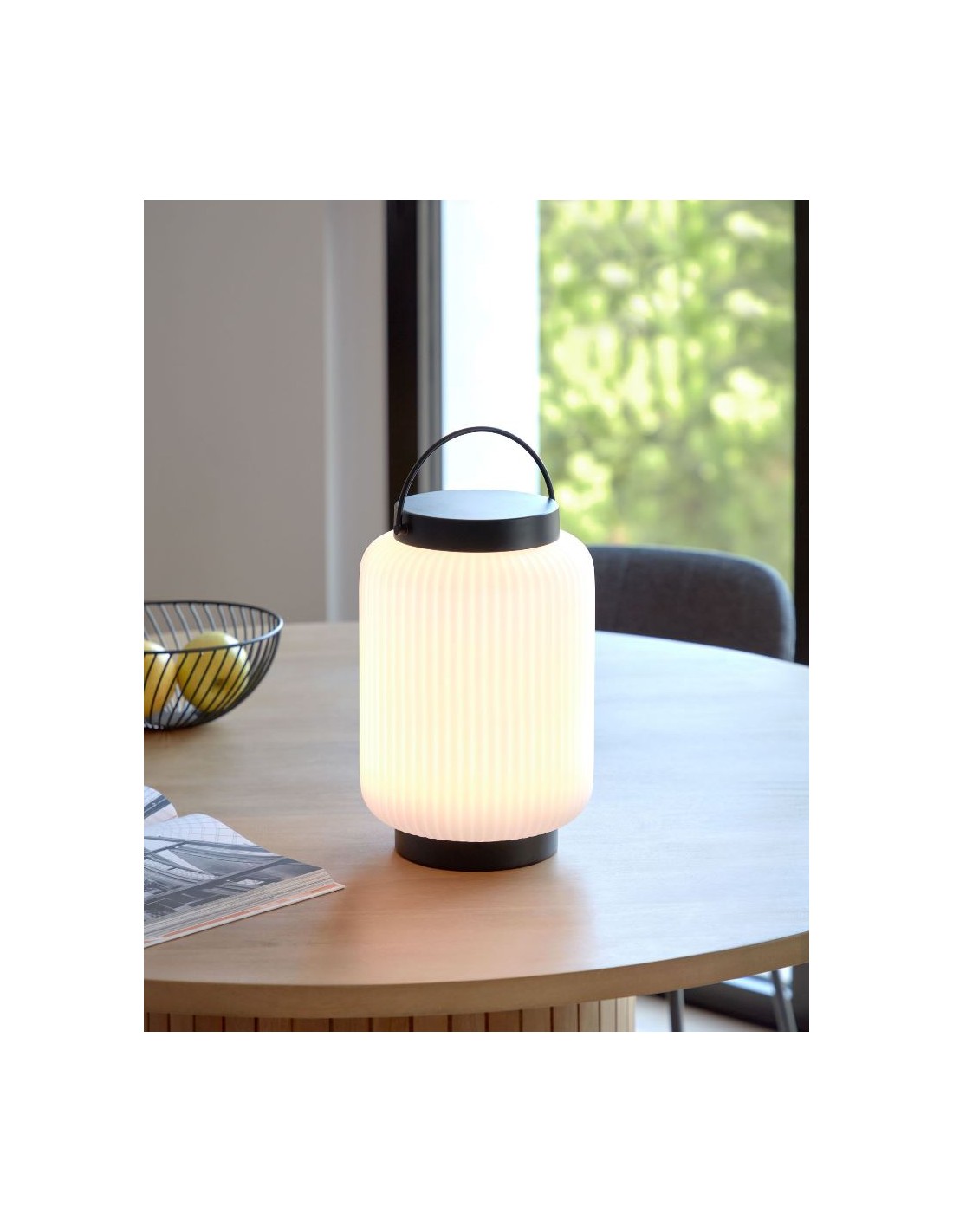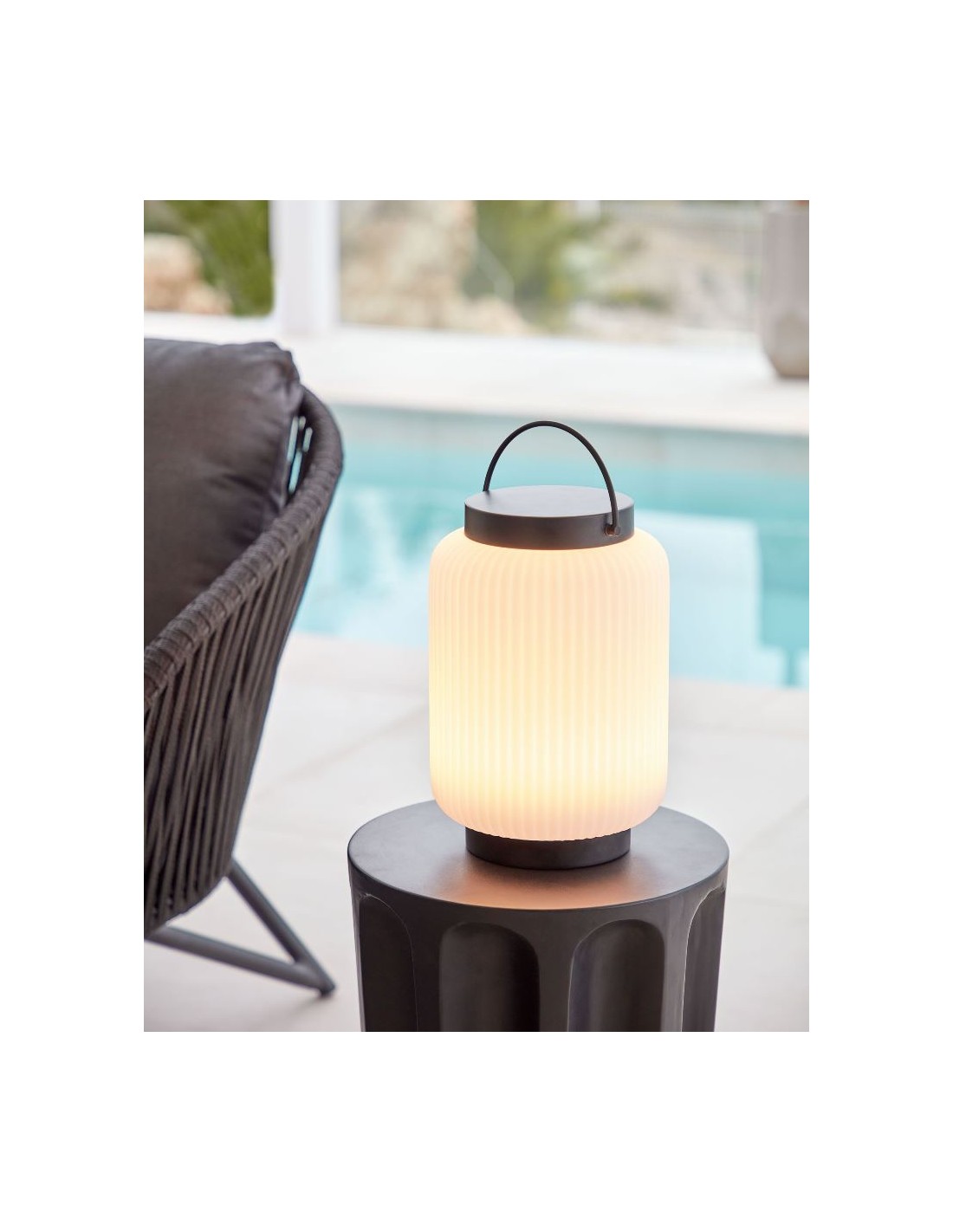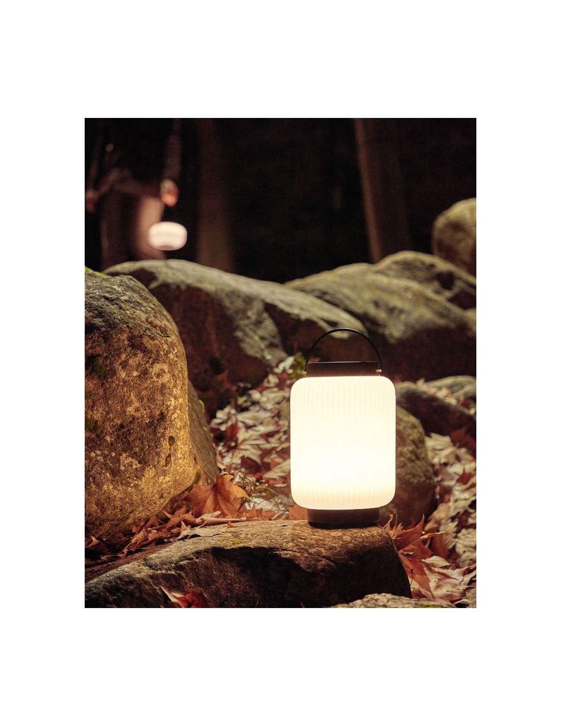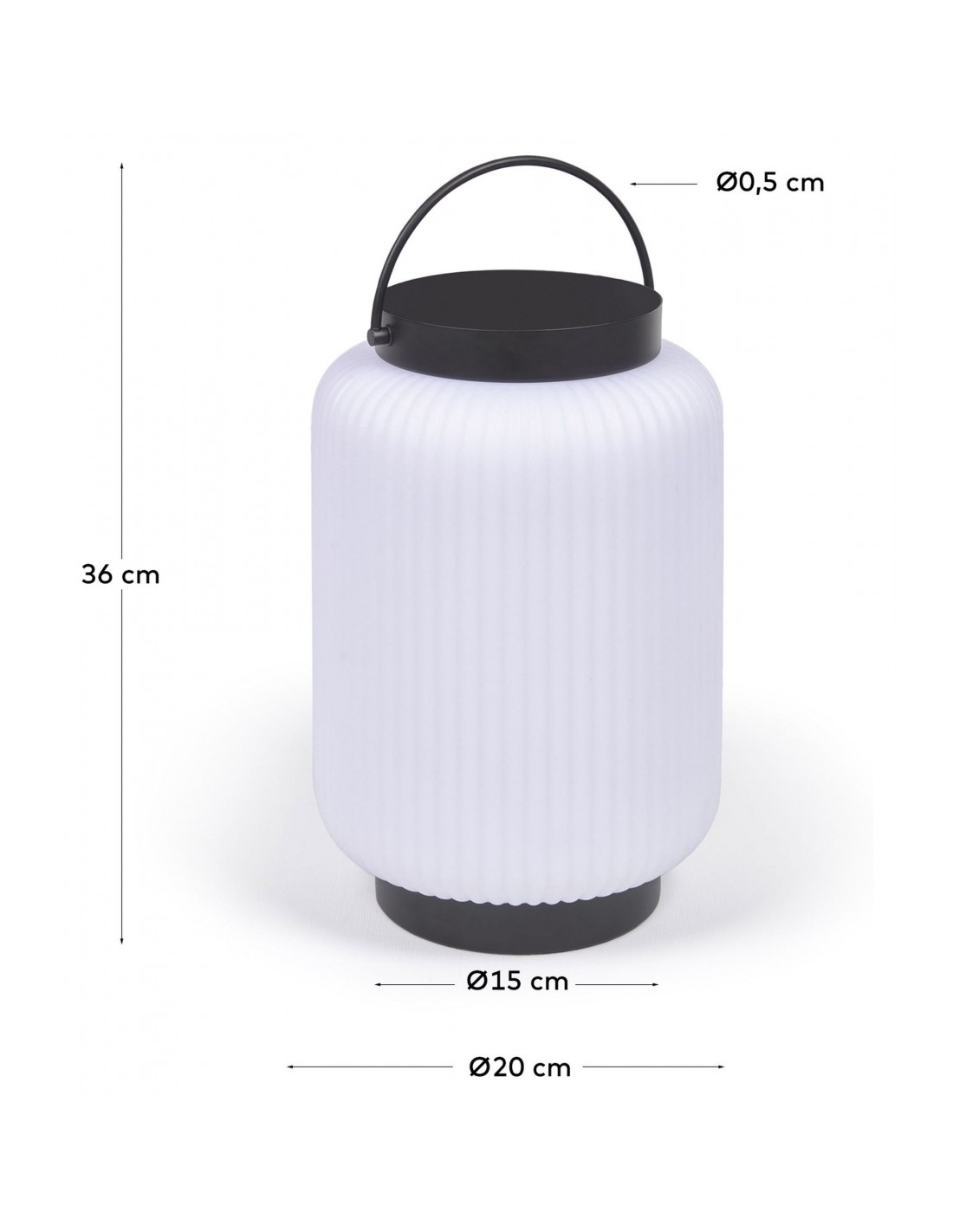 Dekorativ udendørslampe fremstillet i sort kunststof og hvid polyethylene. Lampen kommer med trådløs opladelig lyskilde, der oplades via USB stik. Lampen måler 36 cm i højden og 20 cm i skærmdiameter.