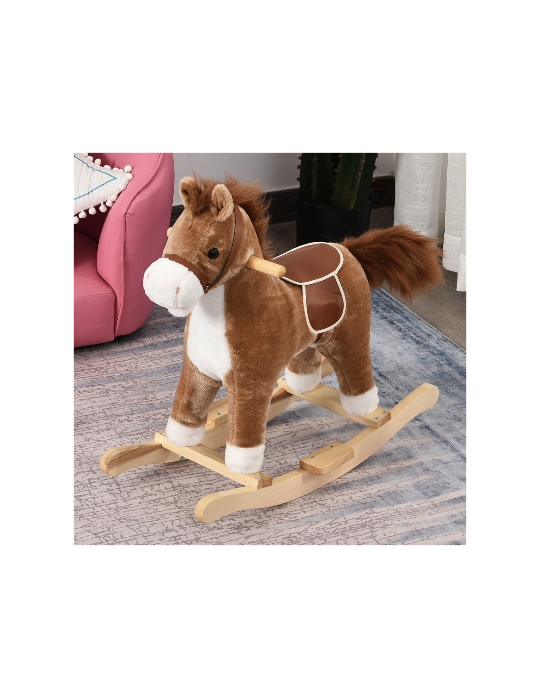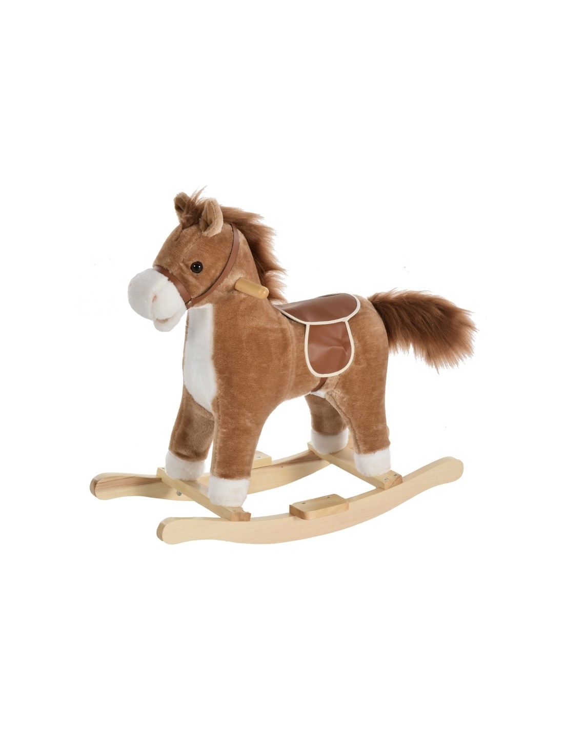 Gyngehest til børn, udført i et design af naturfarvet træ og brunt tekstil med plys. Gyngehesten måler 61 cm i højden og med siddehøjde på 40 cm. Hesten passer til aldersgruppen 3 - 5 år.