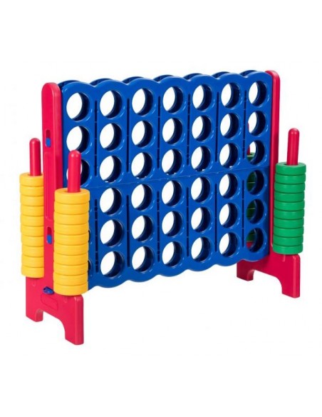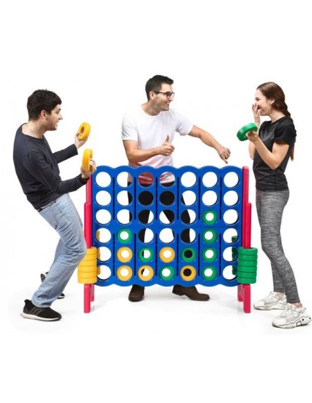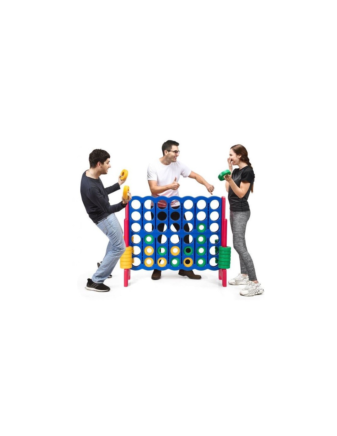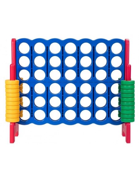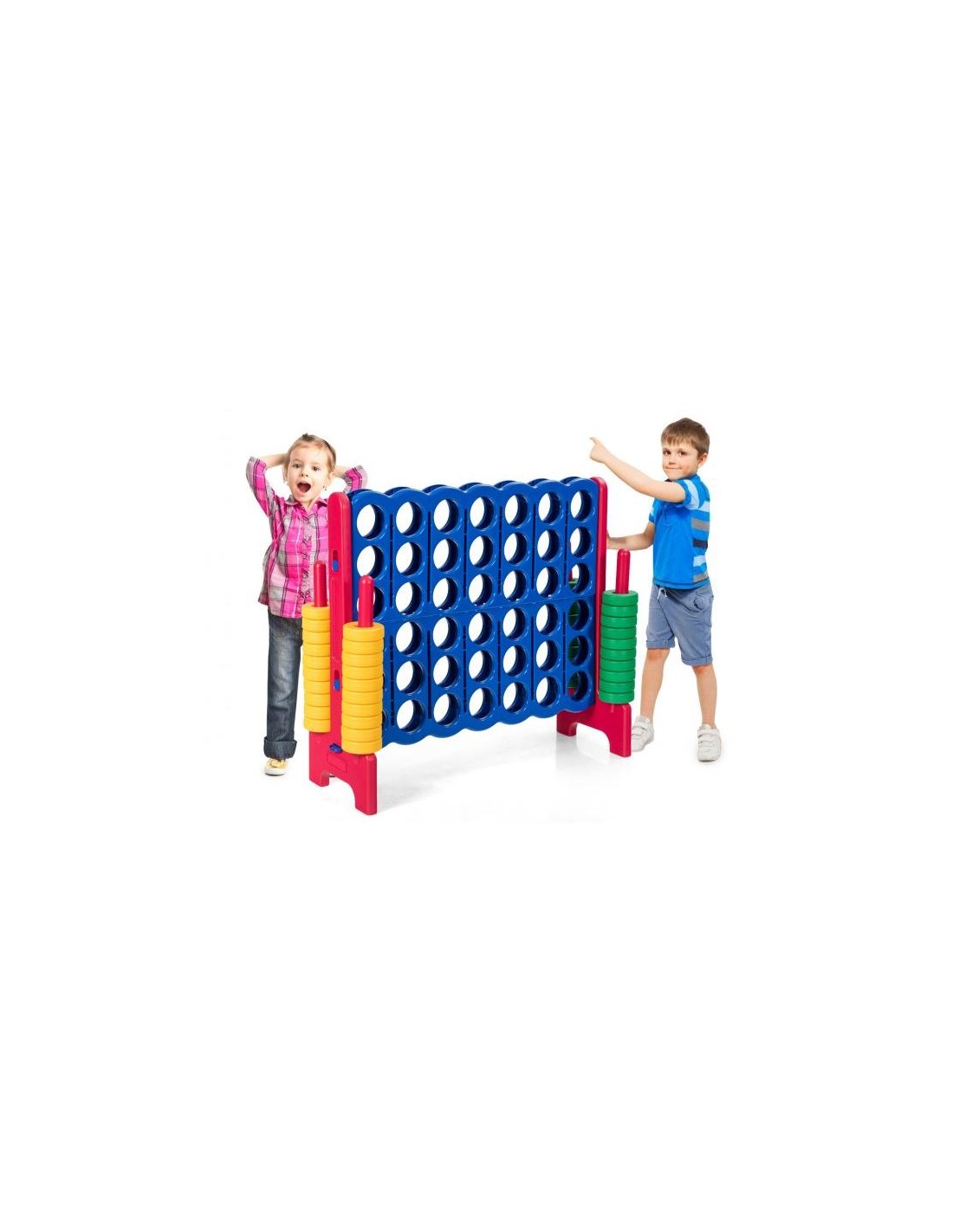 Jumbo 4 på stribe spil, udført i et design af rød og blå kunststof. Spillet måler 104 cm i højden og 120 cm i bredden og passer til både voksne og børn. 21 gule og 21 grønne brikker.