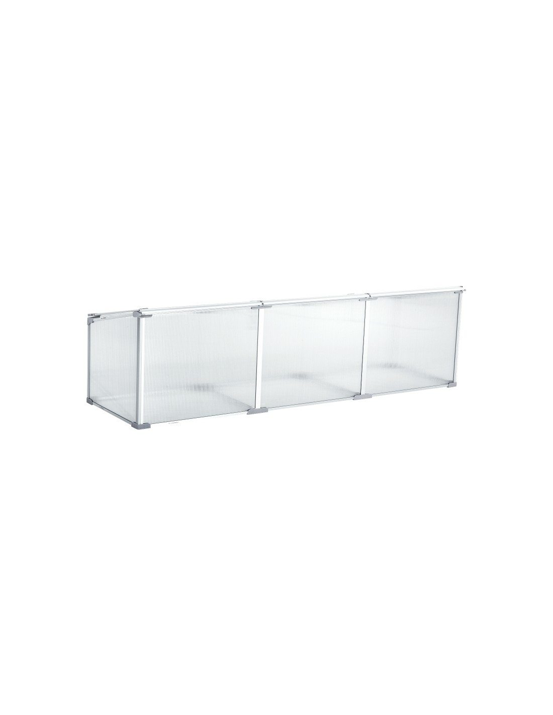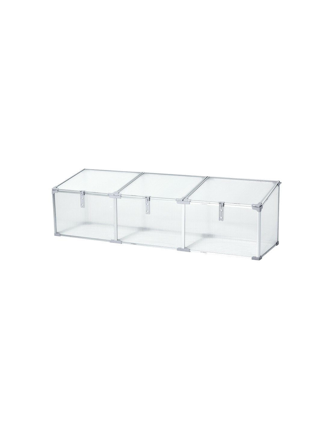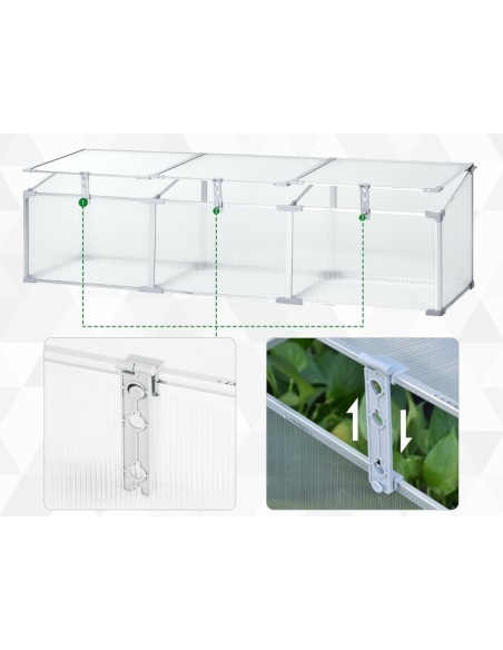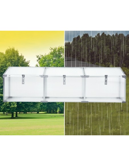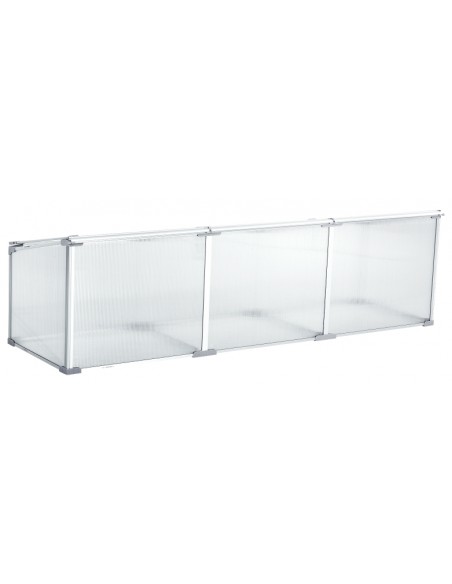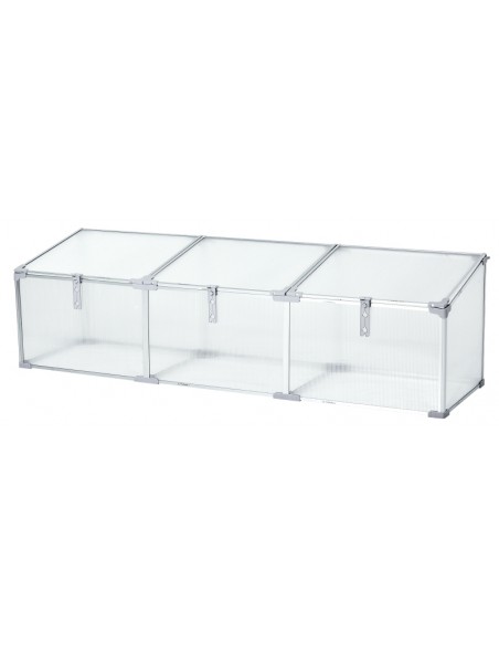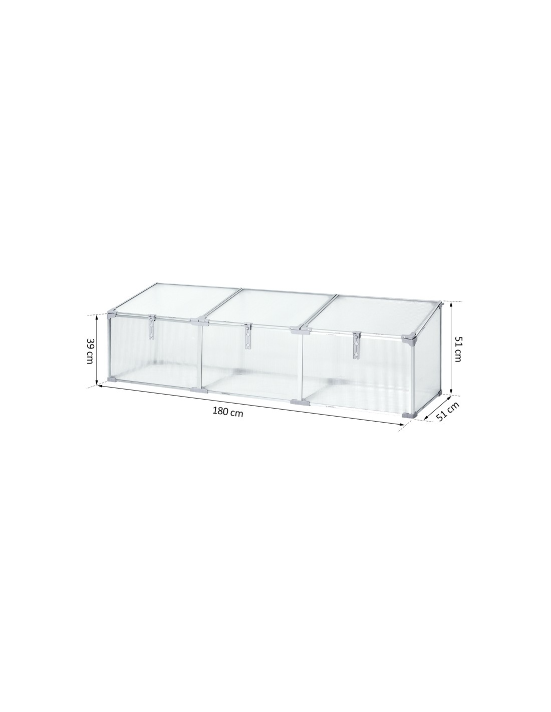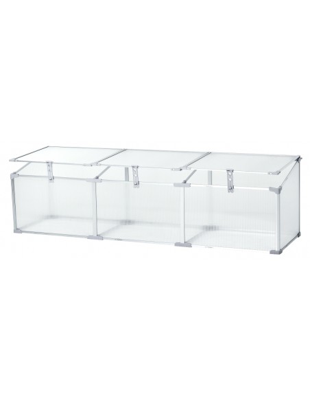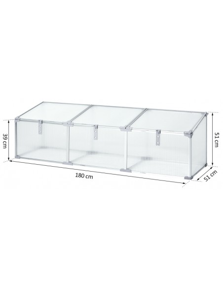 Væksthus udført i et design af aluminium og polycarbonat. Væksthuset måler 180 x 51 cm i bredde og dybde og 39 - 51 cm i højden. Lågene kan justeres i hvor åbne de skal være.