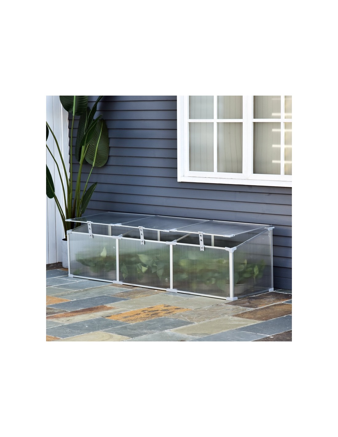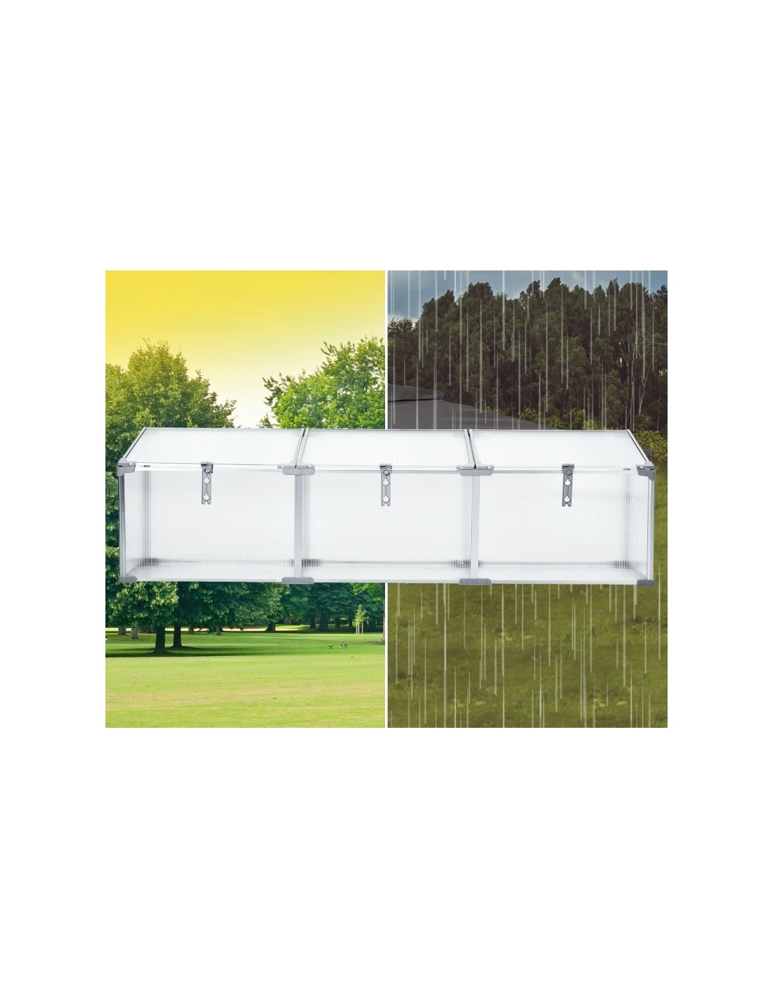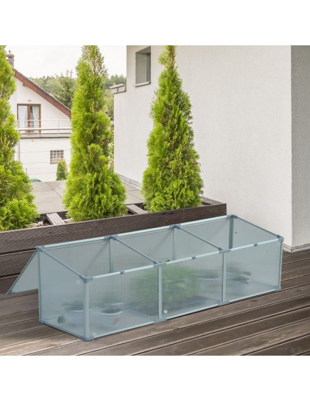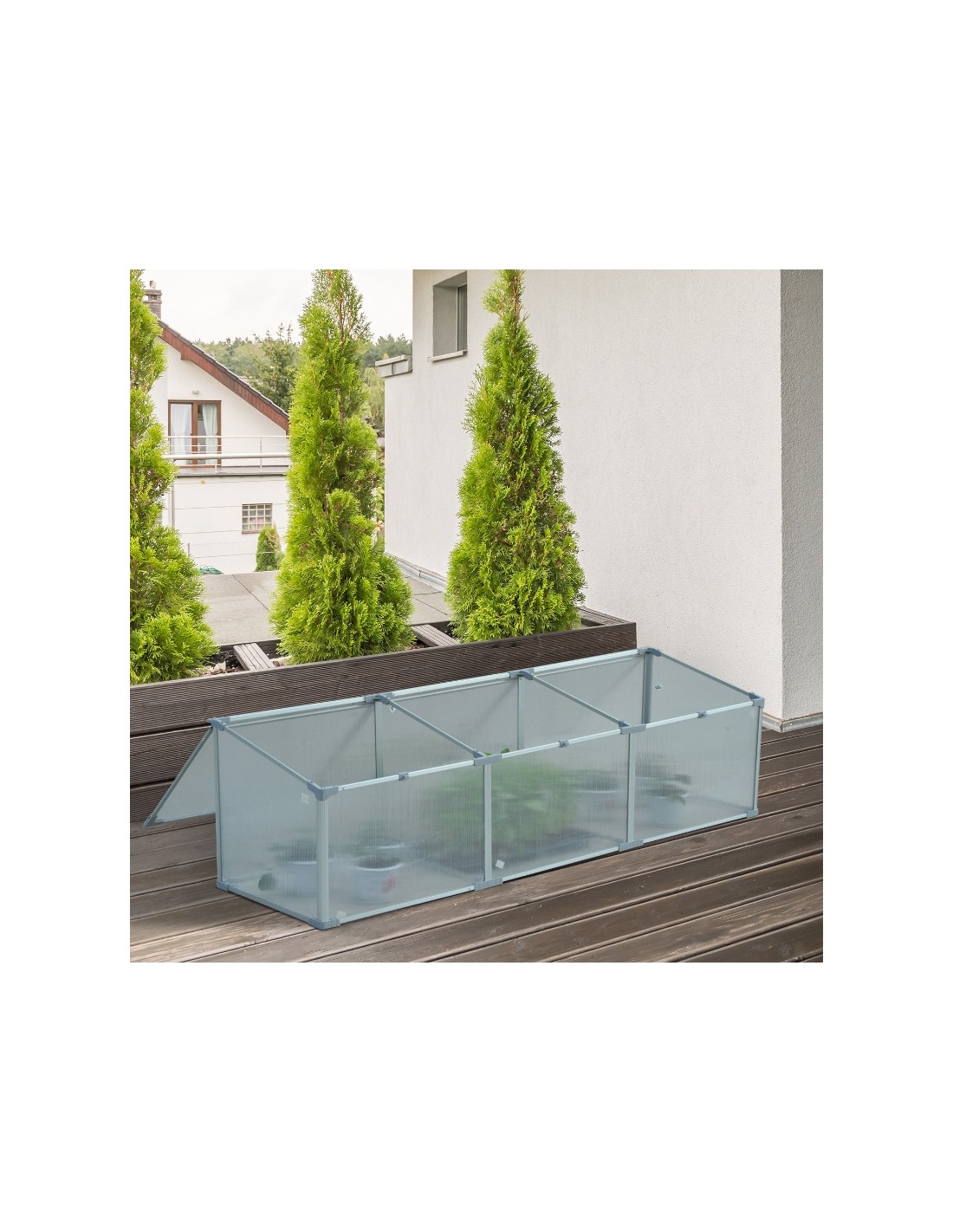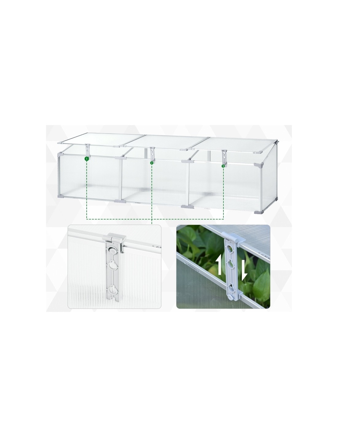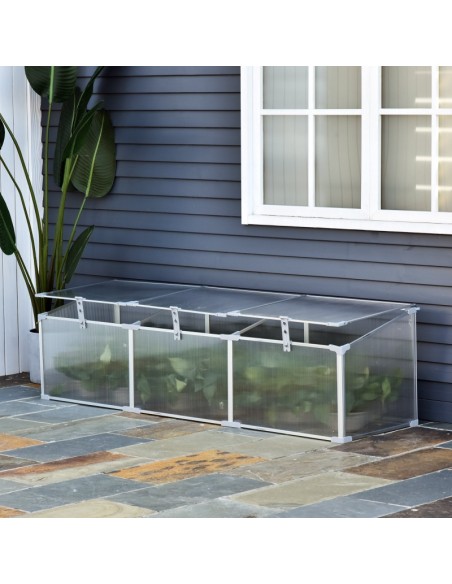 Væksthus udført i et design af aluminium og polycarbonat. Væksthuset måler 180 x 51 cm i bredde og dybde og 39 - 51 cm i højden. Lågene kan justeres i hvor åbne de skal være.