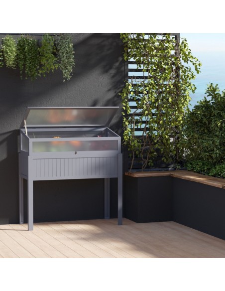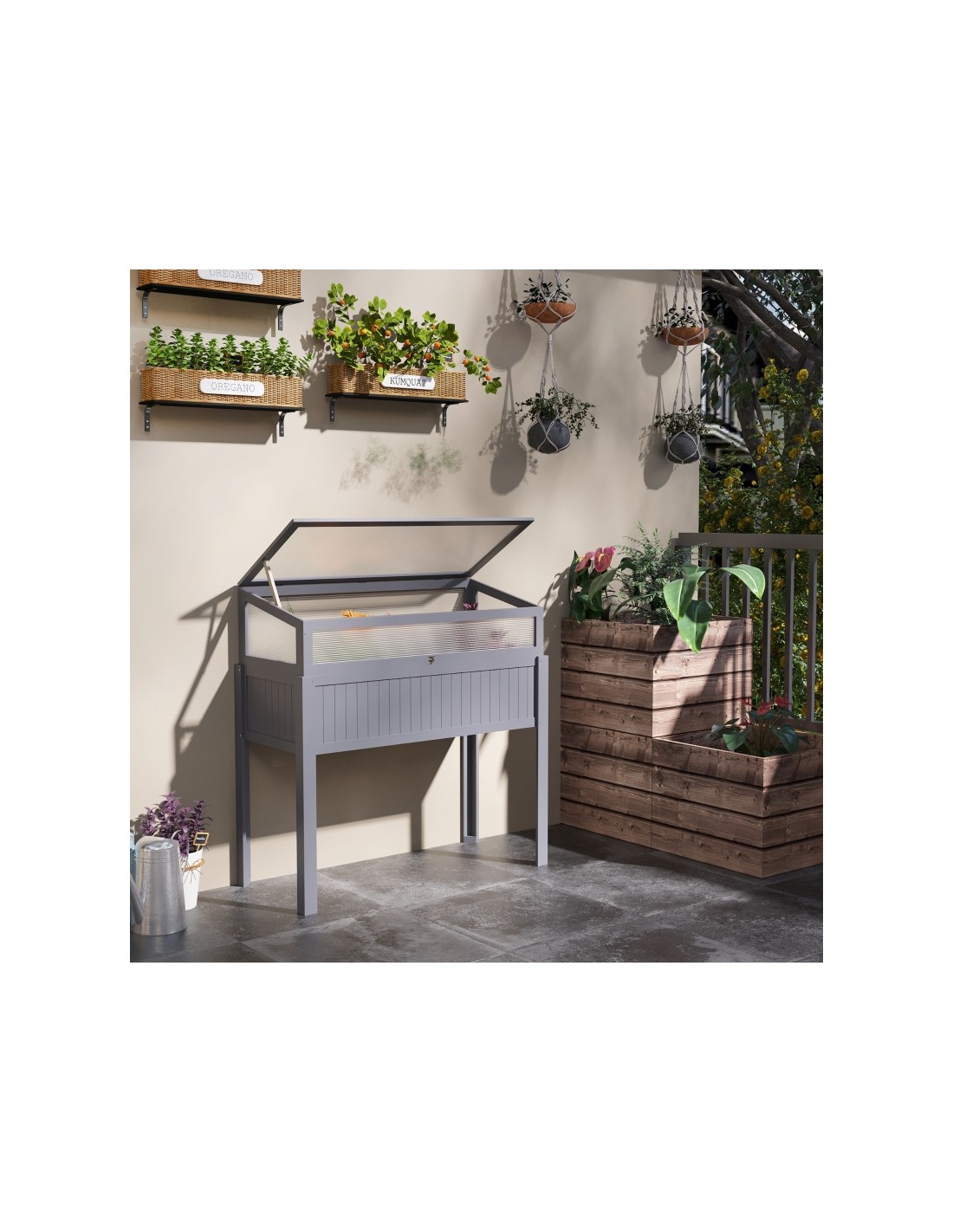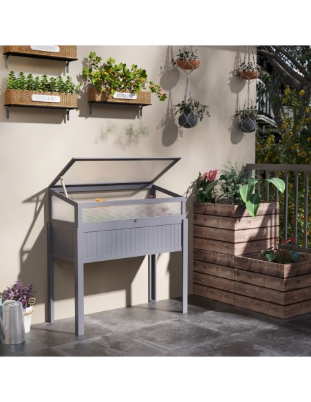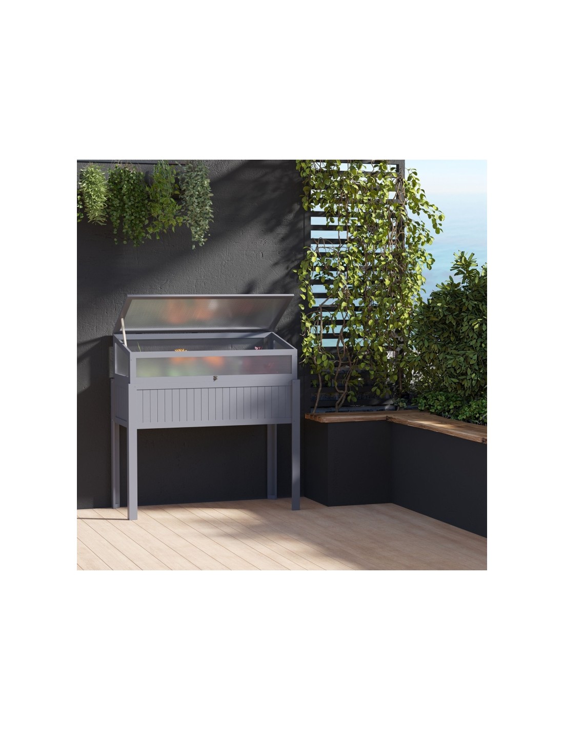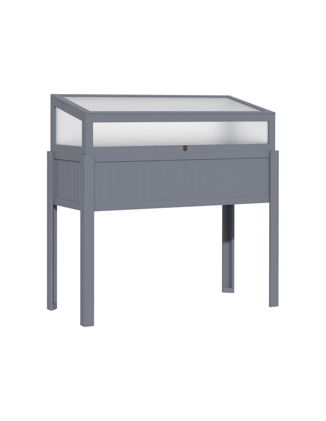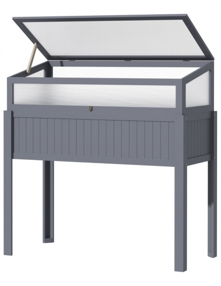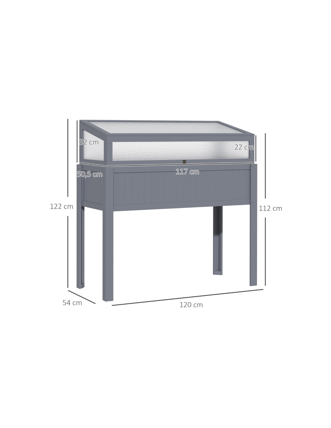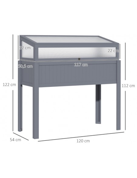 Væksthus udført i et design af grå fyrretræ og polycarbonat. Væksthuset måler 120 x 54 cm i bredde og dybde og 112 - 122 cm i højden.