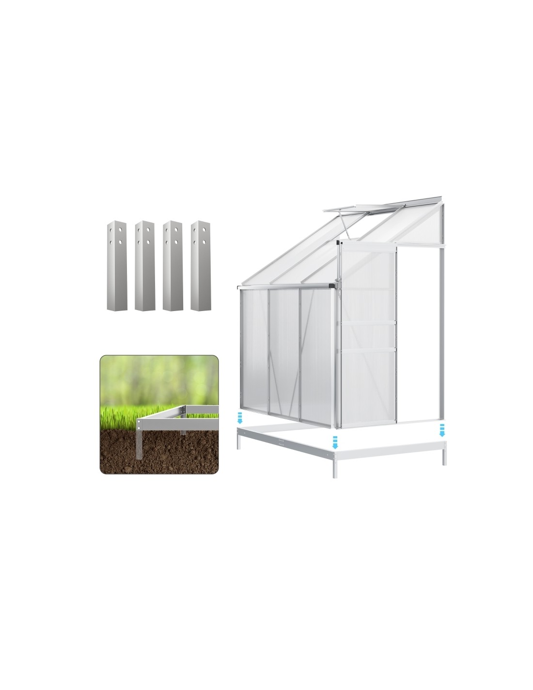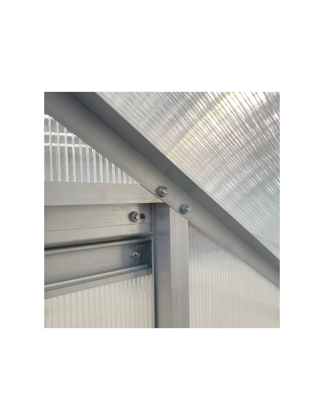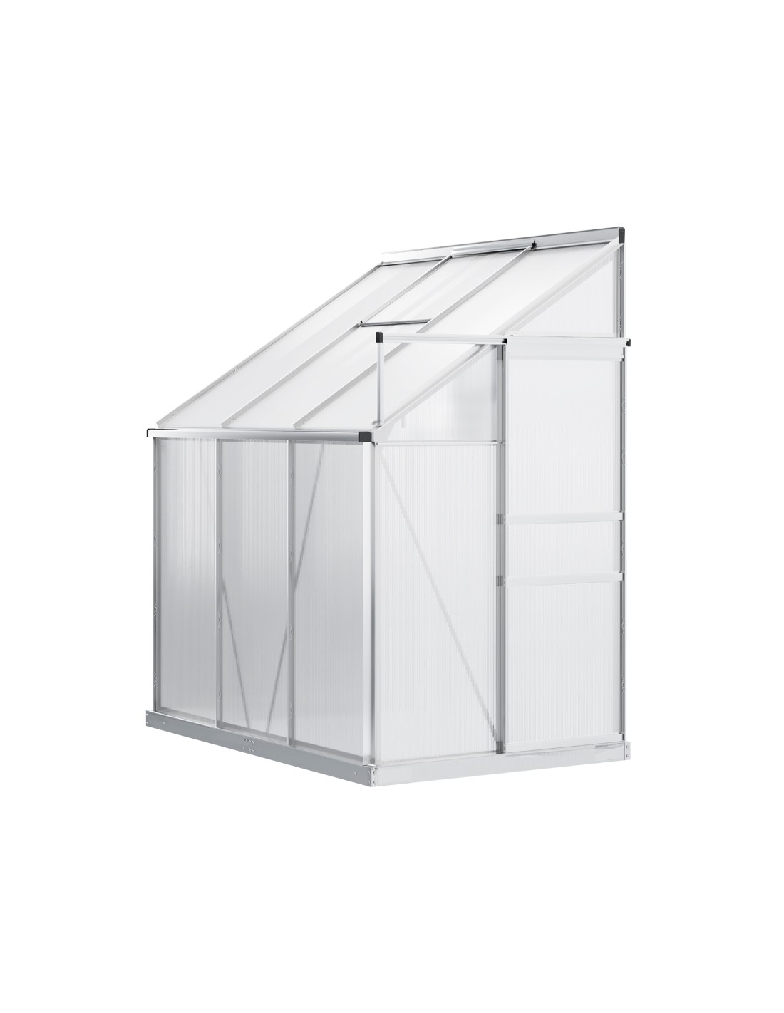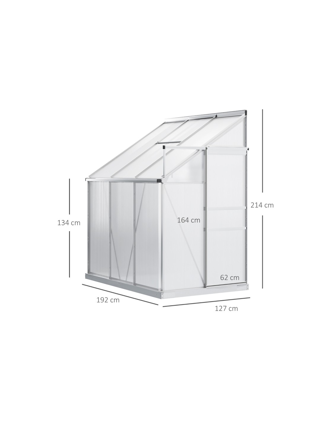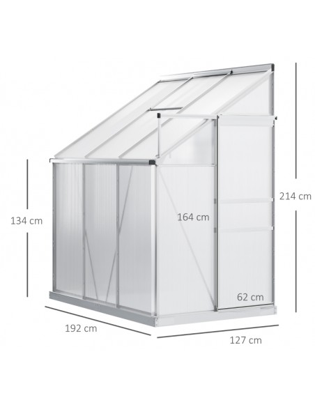 Drivhus til væg eller mur med sokkel, udført i et design af aluminium og polycarbonat. Drivhuset måler 127 x 192 cm i bredde og dybde og 214 cm i højden. Drivhuset er med skydedør og vindue der kan åbnes samt regnvandsafløb. Indgangsdøren måler B62 x H164 cm og tykkelsen på vinduespladerne er 4 mm. Drivhuset tåler vindstød op til 12 m/s.