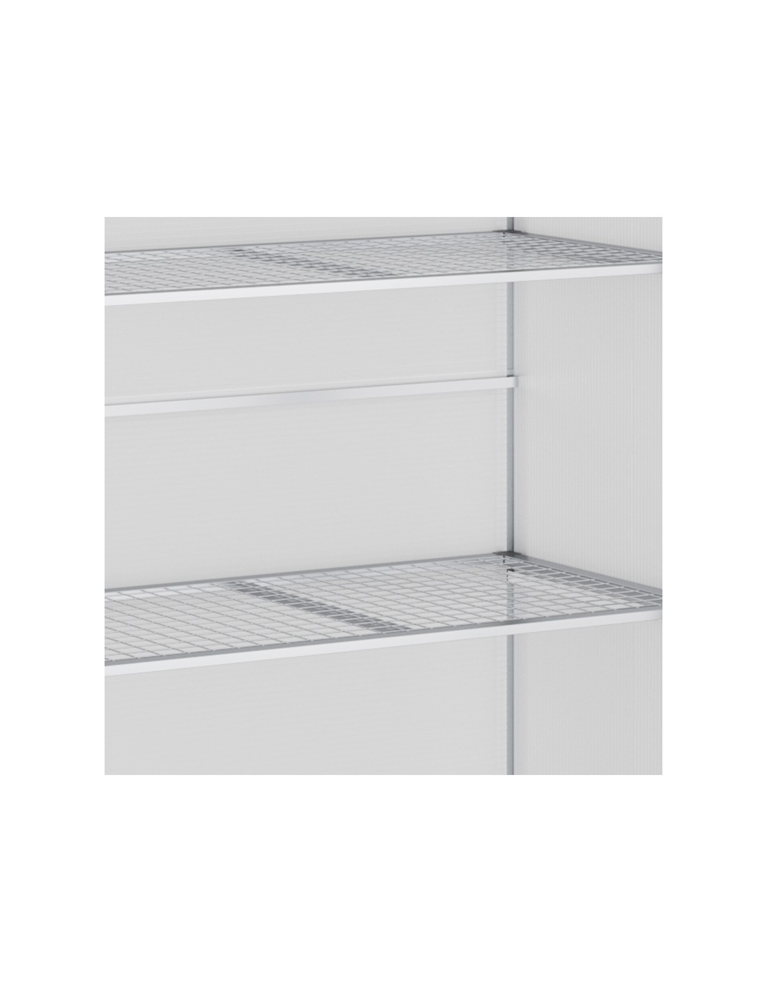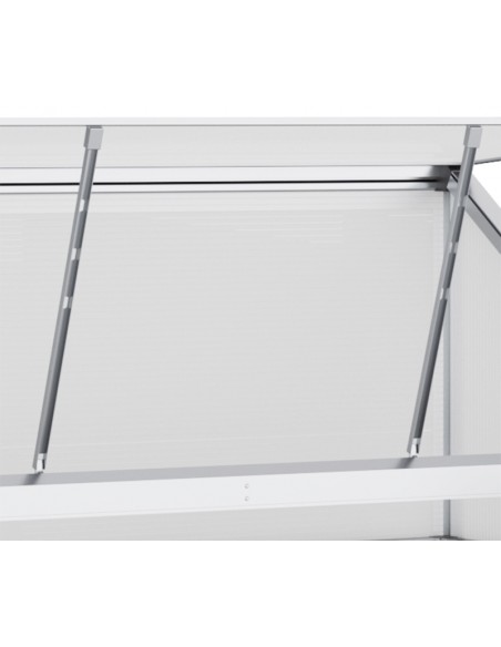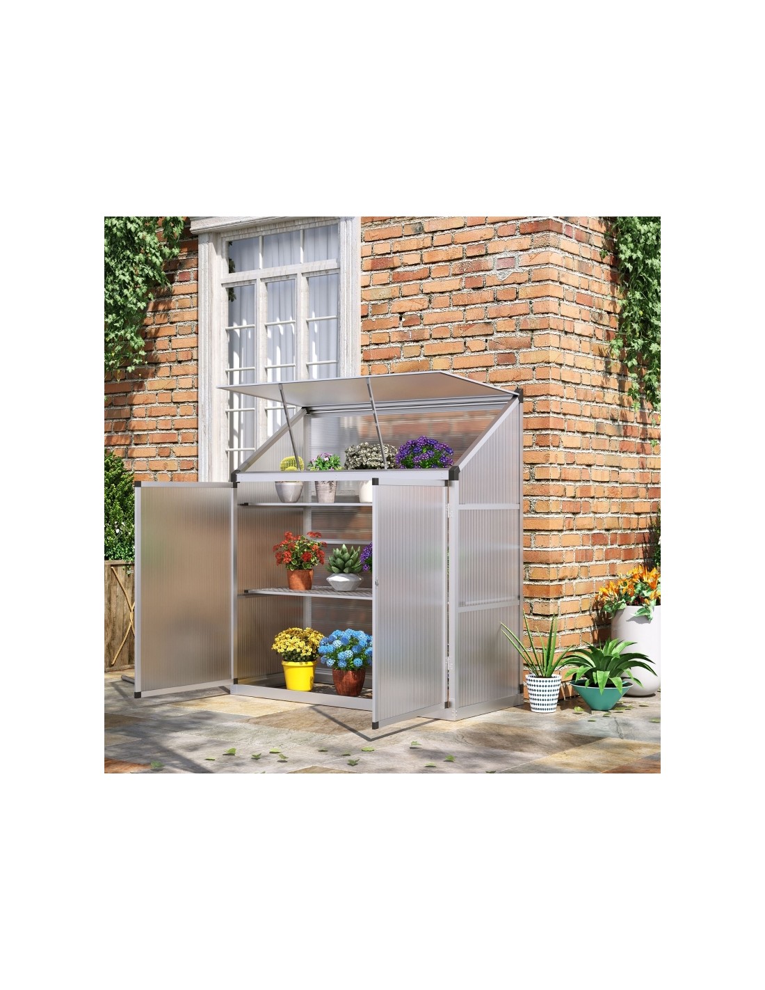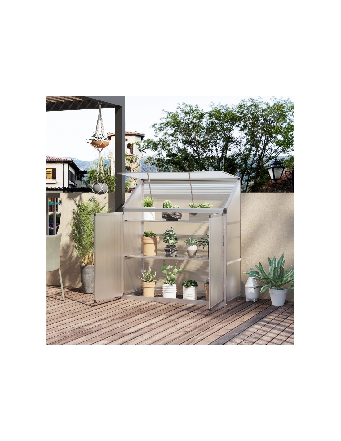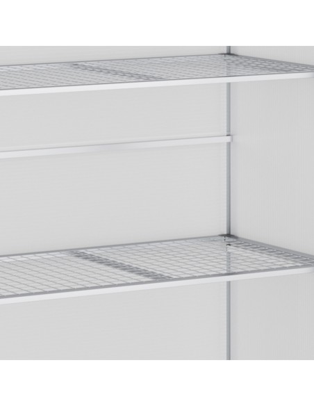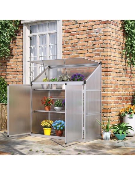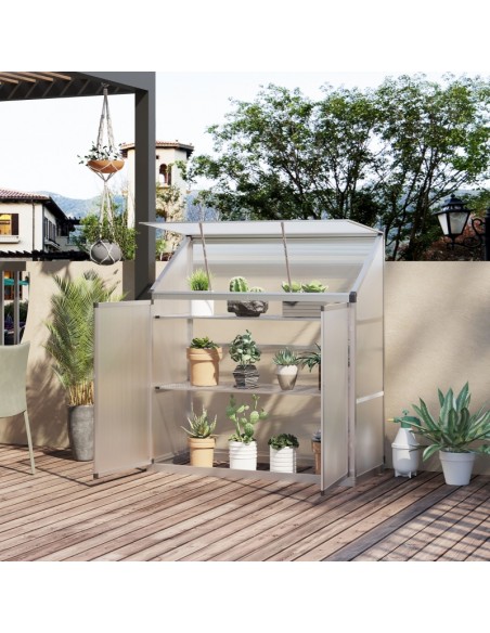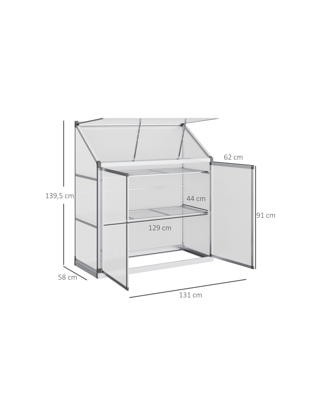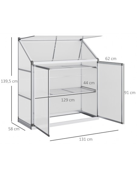 Væksthus til væg eller mur udført i et design af aluminium og polycarbonat. Væksthuset måler 131 x 58 cm i bredde og dybde og 139,5 cm i højden. I væksthuset forefindes 2 hylder.