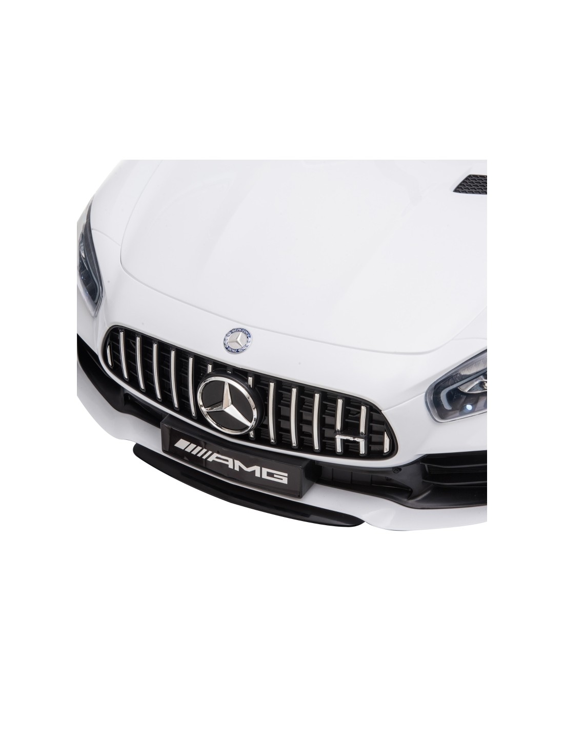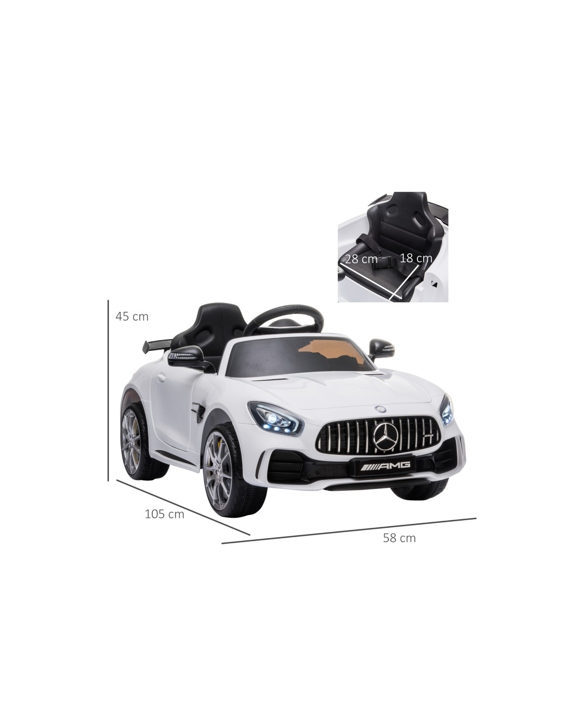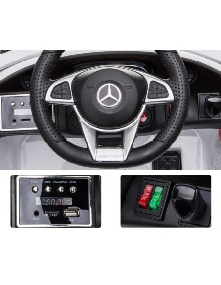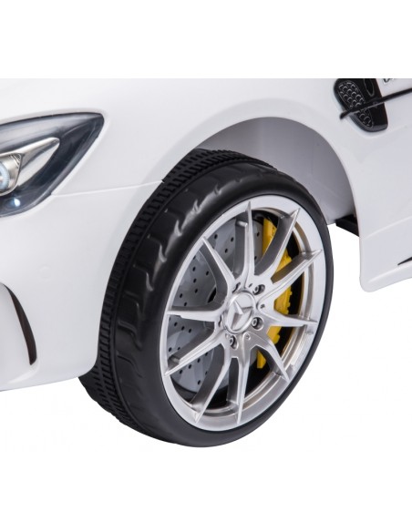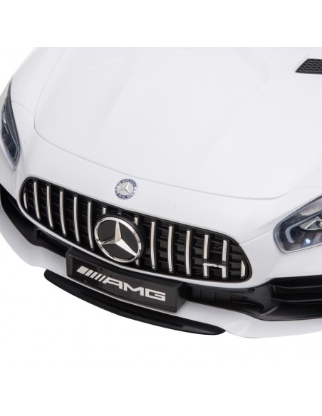 Mercedes AMG elbil til børn, udført i et design af hvid kunststof. Elbilen måler 105 cm i længden og 58 cm i bredden og har plads til et barn i alderen 3 - 5 år. Bilen kommer med forældre fjernbetjening og kører på 12V batteri med en ladetid på cirka 8 - 12 timer for fuld opladning. Bilens hastighed er 3 - 5 km/t og kan holde batteritid i op til 45 min.