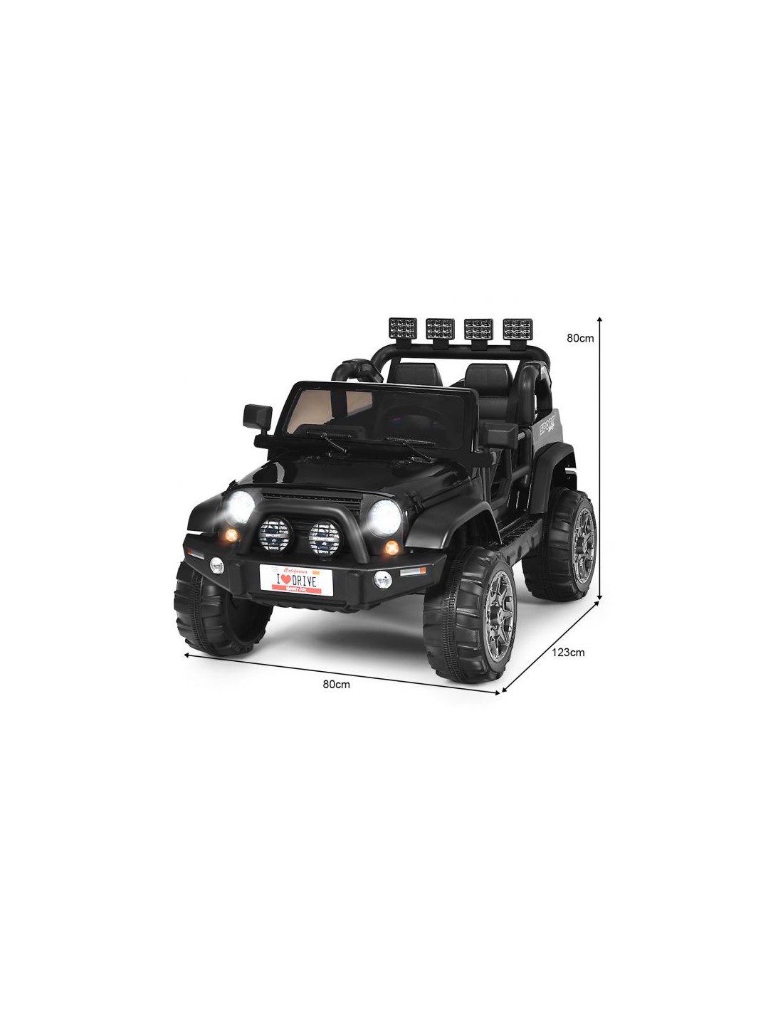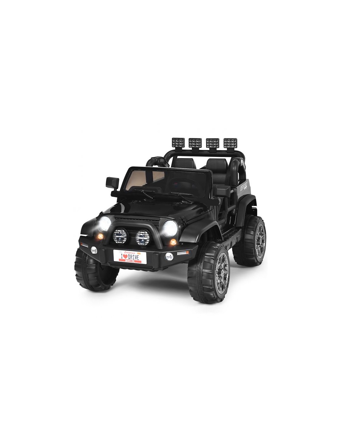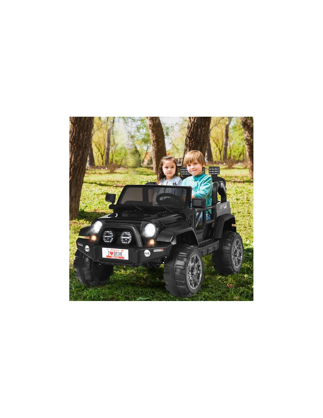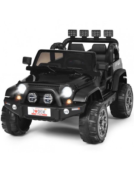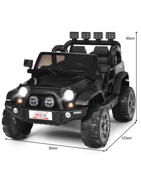 Jeep elbil til 2 børn, udført i et design af sort kunststof. Elbilen måler 123 cm i længden og 80 cm i bredden og har plads til børn i alderen 3 - 6 år. Bilen kommer med forældre fjernbetjening og kører på 12V batteri med en ladetid på cirka 8 - 12 timer for fuld opladning. Bilens hastighed er 2,5 - 4 km/t og kan holde batteritid i op til 45 min.