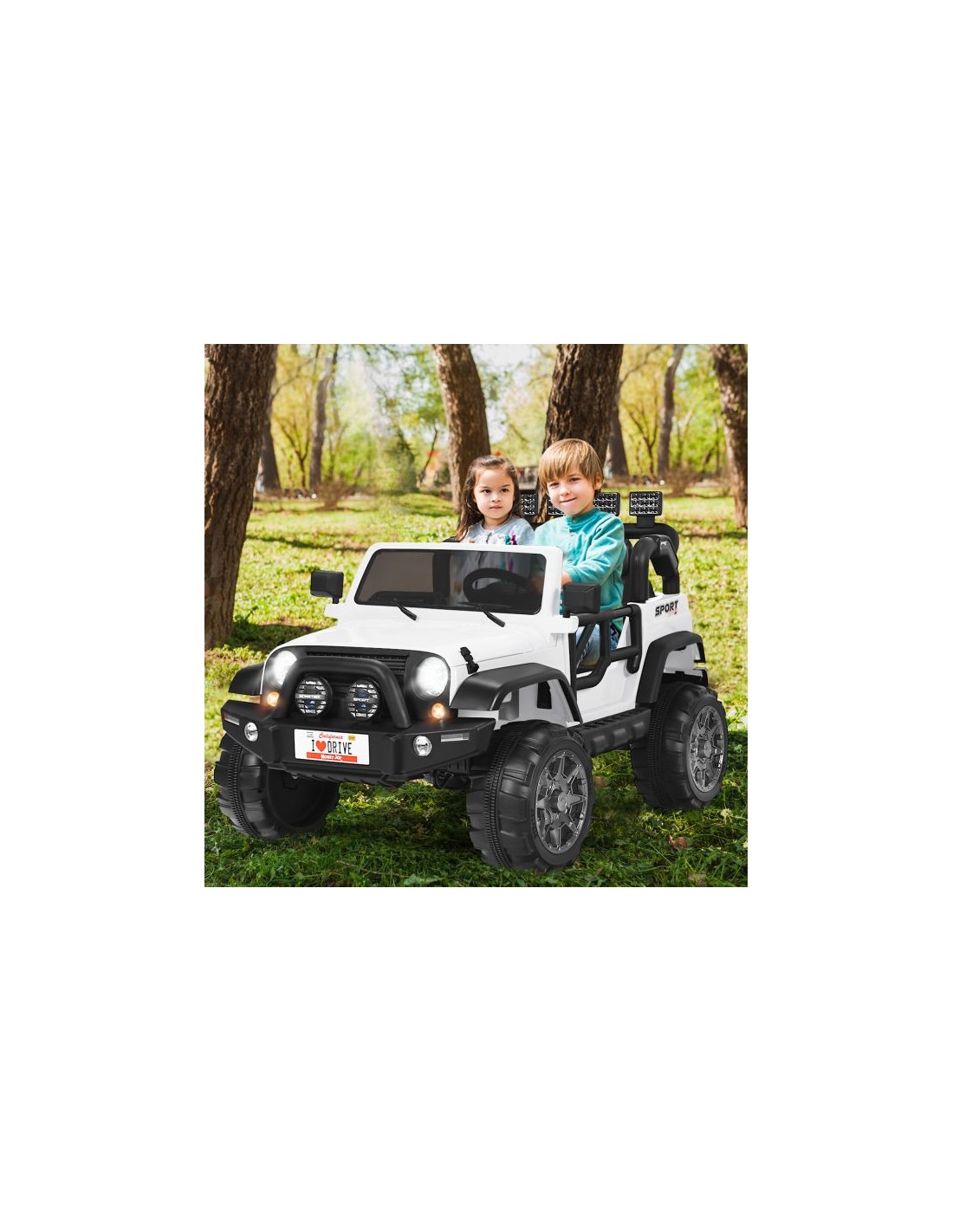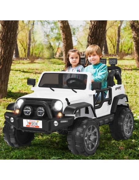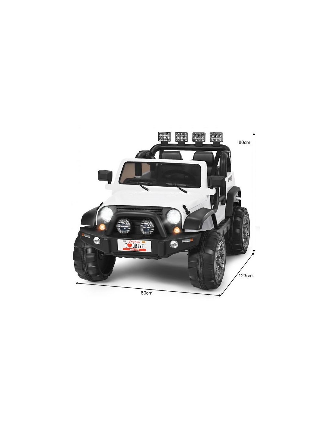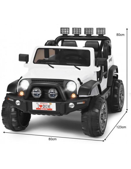 Jeep elbil til 2 børn, udført i et design af hvid kunststof. Elbilen måler 123 cm i længden og 80 cm i bredden og har plads til børn i alderen 3 - 6 år. Bilen kommer med forældre fjernbetjening og kører på 12V batteri med en ladetid på cirka 8 - 12 timer for fuld opladning. Bilens hastighed er 2,5 - 4 km/t og kan holde batteritid i op til 45 min.