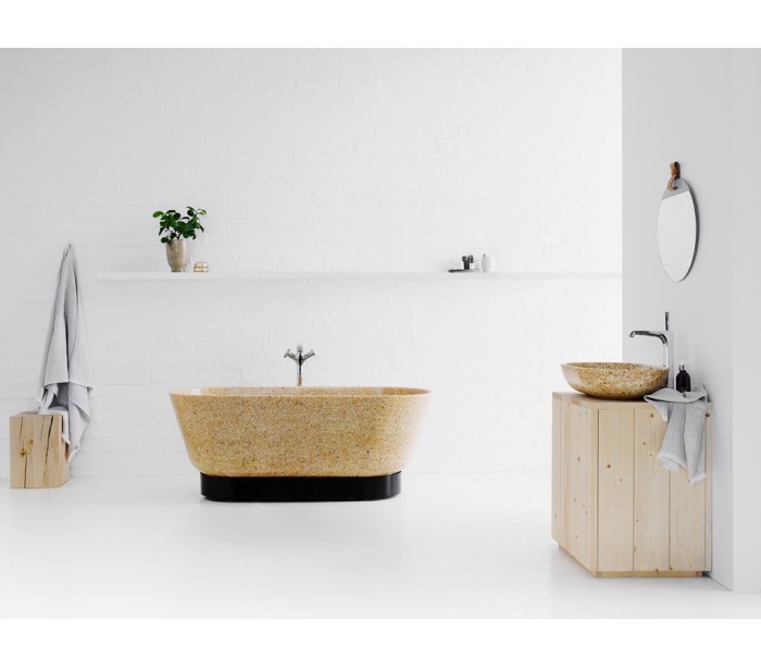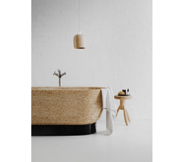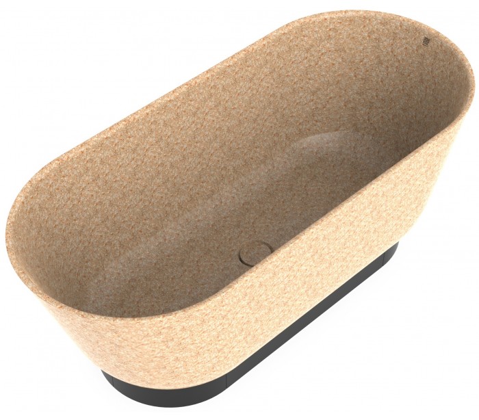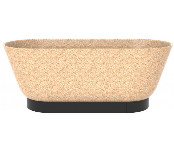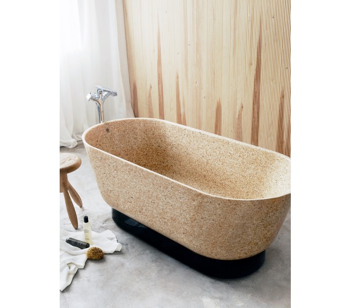 Woodio Flow badekar fremstillet i bæredygtige materialer fra de Finske skove (80% ren træ/20% resin) og udført i en blød oval form, der gør badekaret meget behageligt at sidde i. Basen er i rustfri stål med sort pulverlakering og justérbare ben. Afløbet er centreret midt i badekaret.