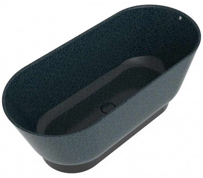 Woodio Flow badekar fremstillet i bæredygtige materialer fra de Finske skove (80% ren træ/20% resin) og udført i en blød oval form, der gør badekaret meget behageligt at sidde i. Basen er i rustfri stål med sort pulverlakering og justérbare ben. Afløbet er centreret midt i badekaret.