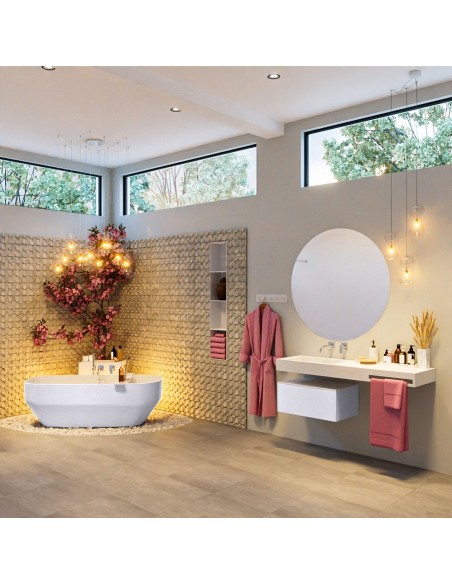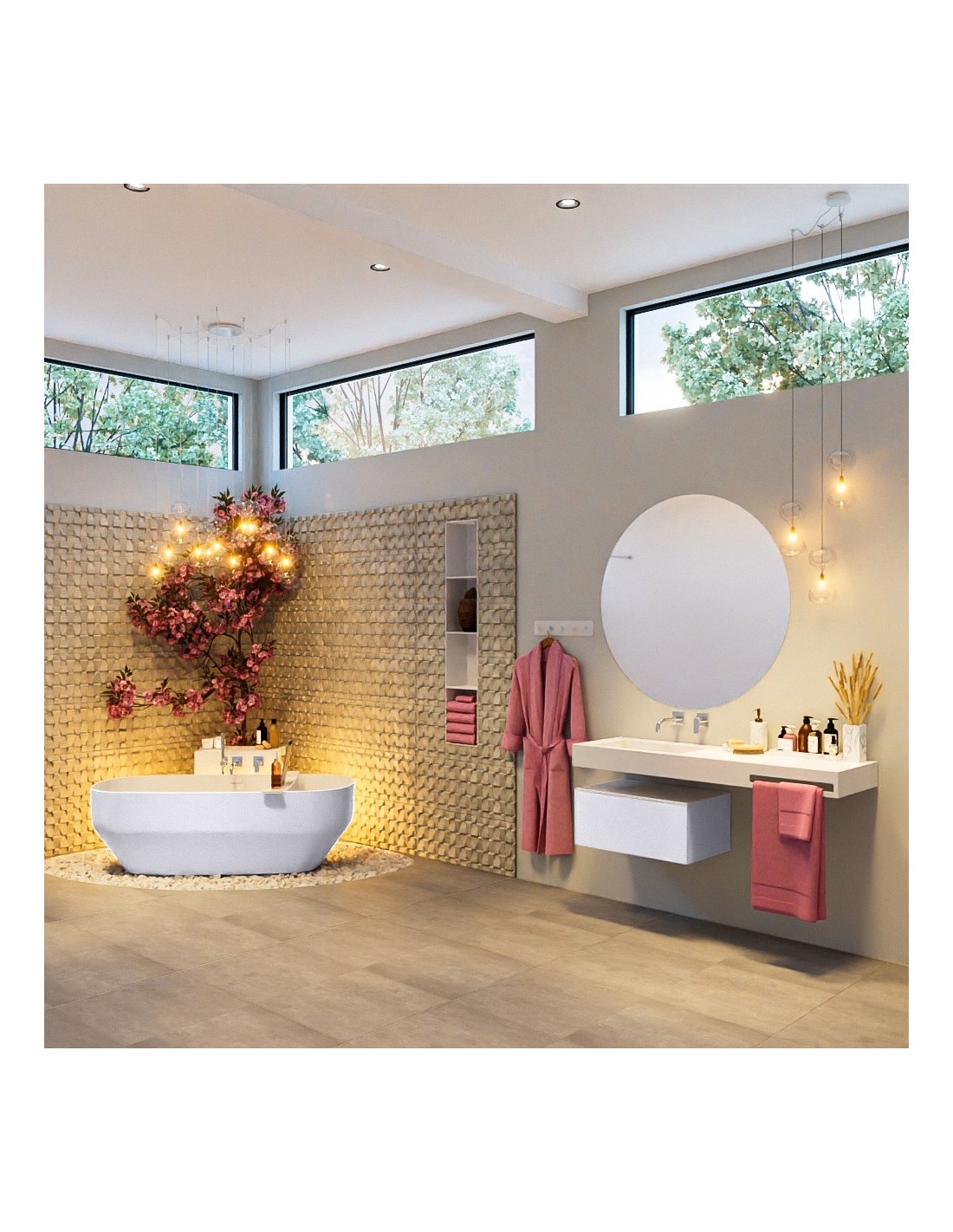 Mondiaz tilbyder et spændende og lækkert sortiment af badeværelsesindretning til attraktive priser. Mondiaz er specialister indenfor indretning af badeværelser, og tilbyder næsten et komplet sortiment, så som badeværelsesmøbler, moderne håndvaske og badekar, samt luksuriøse spejle med mere. Fra Mondiaz finder du badeværelsesmøbler i forskellige stilarter, herunder badeværelsesmøbler fremstillet i massiv træ, samt i solid surface og marmor. Indretning til badeværelset i høj kvalitet til attraktive priser er hver Mondiaz står for.