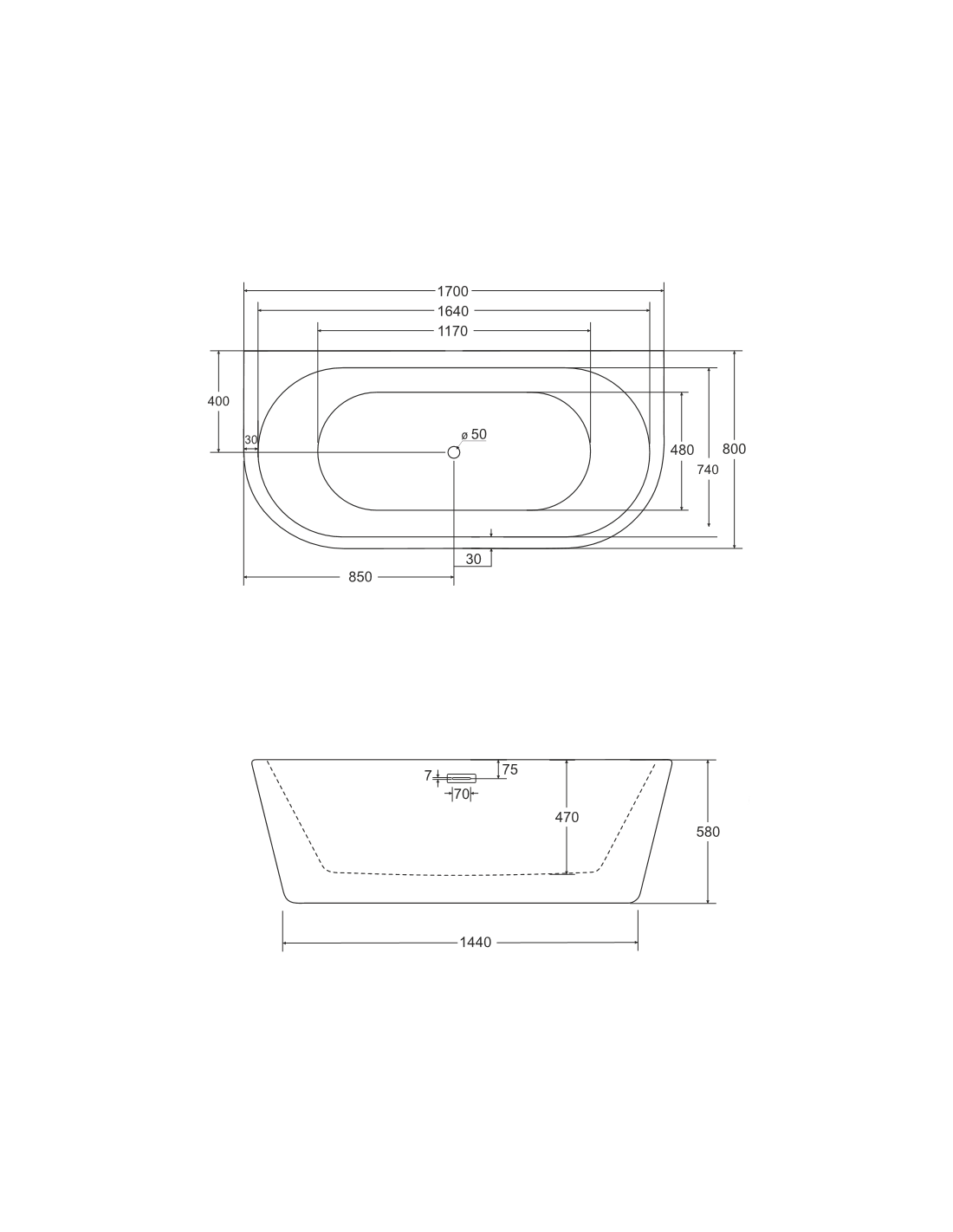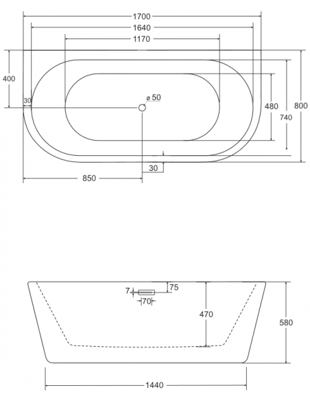 VICA vægmonteret badekar i et moderne og stilrent design, fremstillet i blank hvid premium akryl. Badekaret måler 170 cm i længden og 80 cm i bredden (ydermål). Badekaret har overløb samt pop-up bundventil i kromlakeret stål/messing.