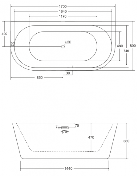 VICA vægmonteret badekar i et moderne og stilrent design, fremstillet i blank hvid premium akryl. Badekaret måler 170 cm i længden og 80 cm i bredden (ydermål). Badekaret har overløb samt pop-up bundventil i guldfarvet stål/messing.