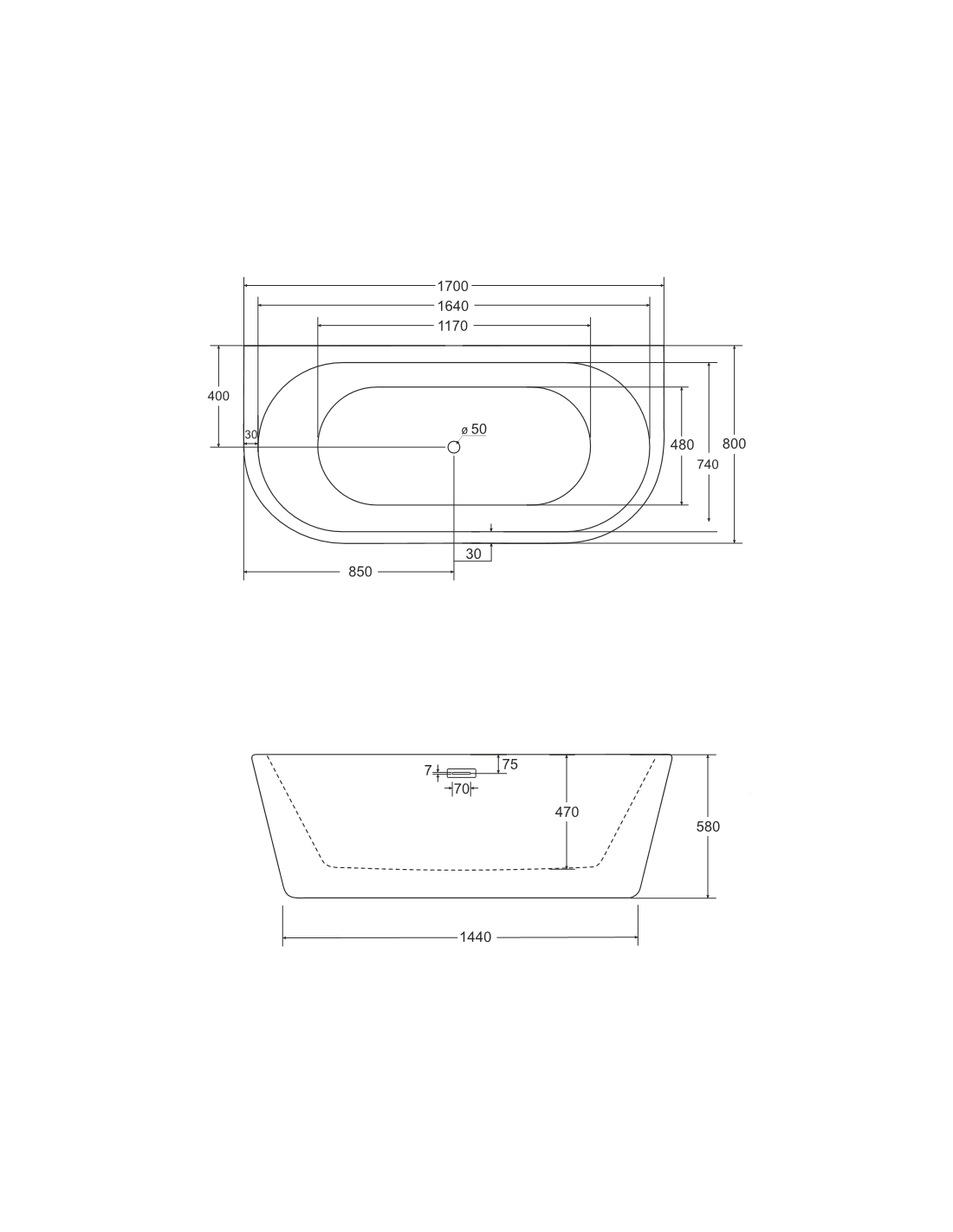 VICA Vægmonteret badekar 170 x 80 cm Akryl - Blank hvid/Mat sort