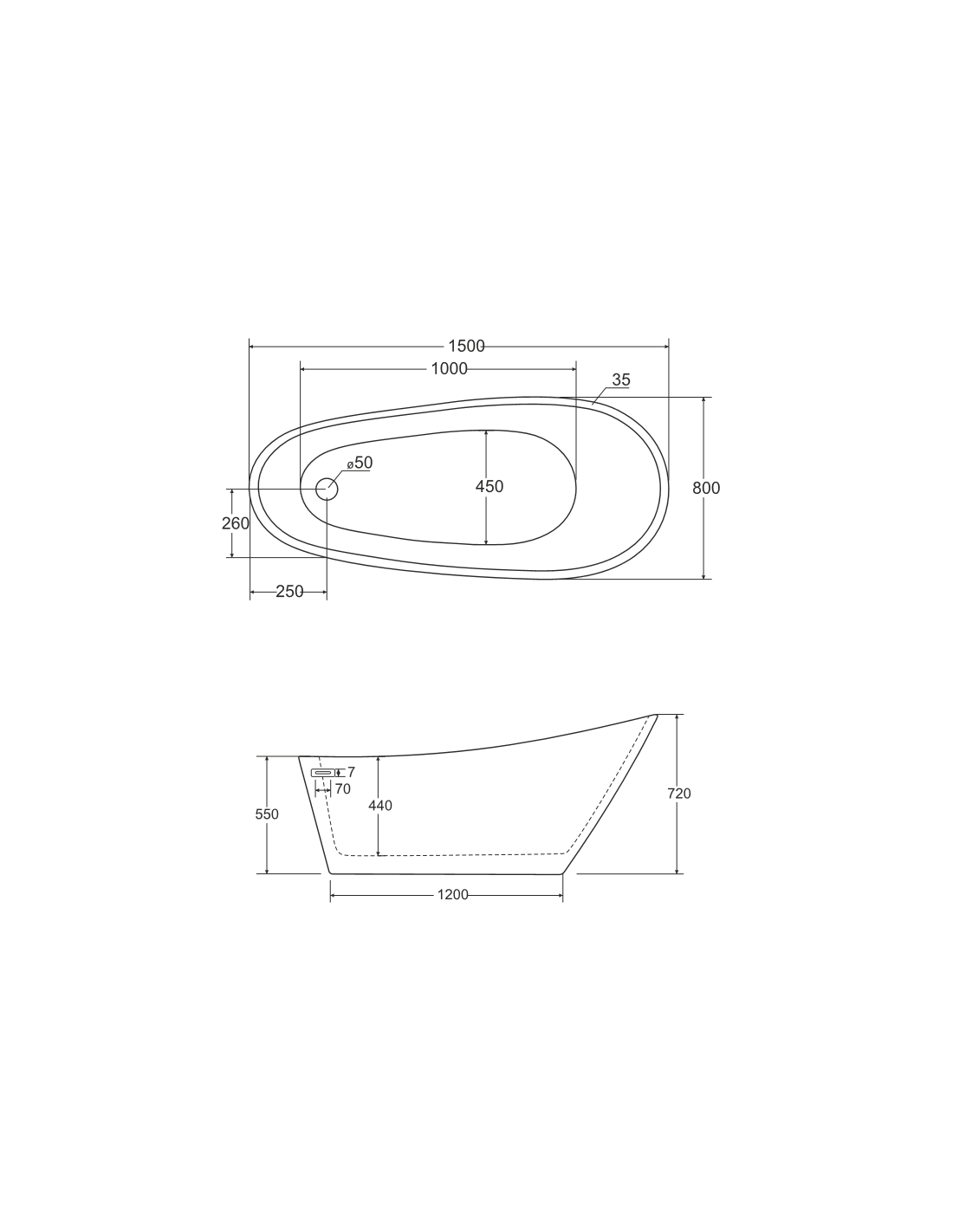 MELODY fritstående badekar i et moderne og stilrent design, fremstillet i blank hvid premium akryl. Badekaret måler 150 cm i længden og 80 cm i bredden (ydermål). Badekaret har overløb samt pop-up bundventil i kromlakeret stål/messing.
