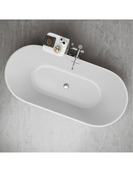 Fritstående badekar udført i et design fremstillet i et moderne design af akryl. Badekaret måler 150 x 75 cm i bredde og dybde og 58 cm i højden (ydermål). Leveres med pop-up bundventil.