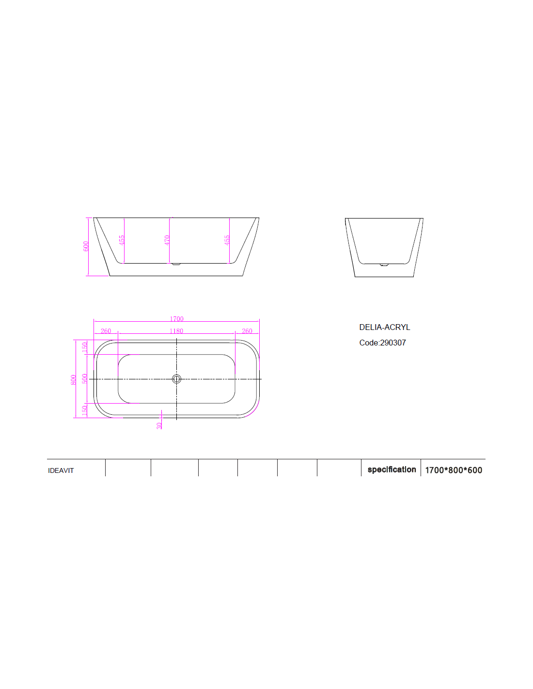 Badekar i et design fra Hollandske Ideavit. Badekaret er fremstillet i mat hvid sanitetsakryl og måler 170 cm i længden og 80 cm i bredden (ydermål). Leveres med pop-up bundventil med mat hvid cover og afløb.