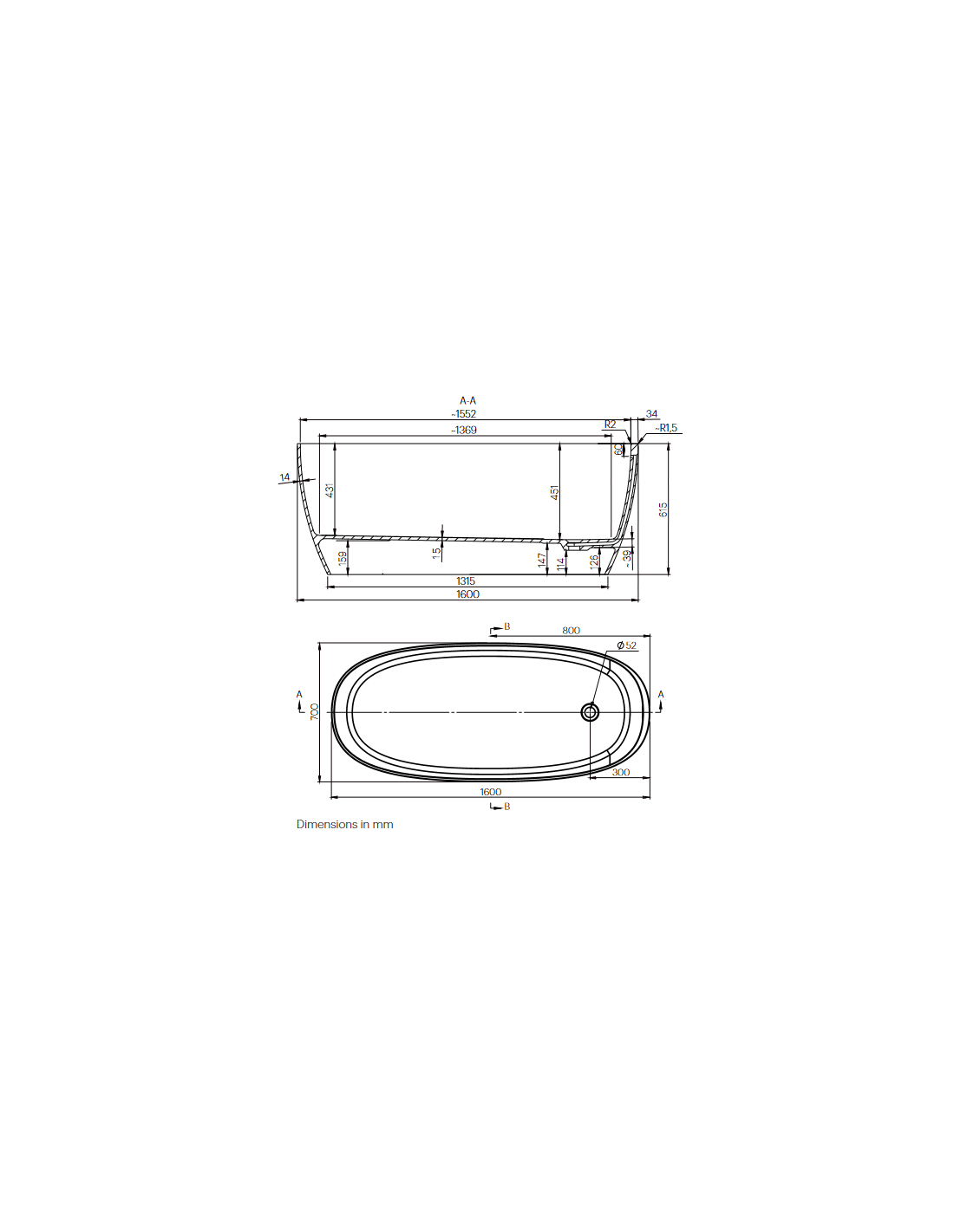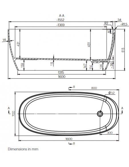 B16 fritstående badekar 160 x 70 cm mineral komposit - Mat hvid