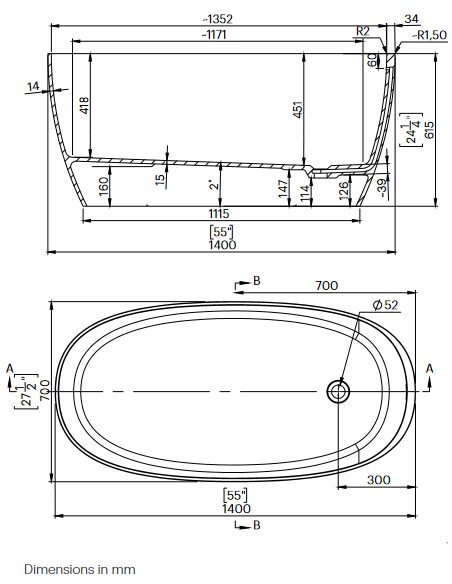 B17 fritstående badekar 140 x 70 cm mineral komposit - Mat hvid