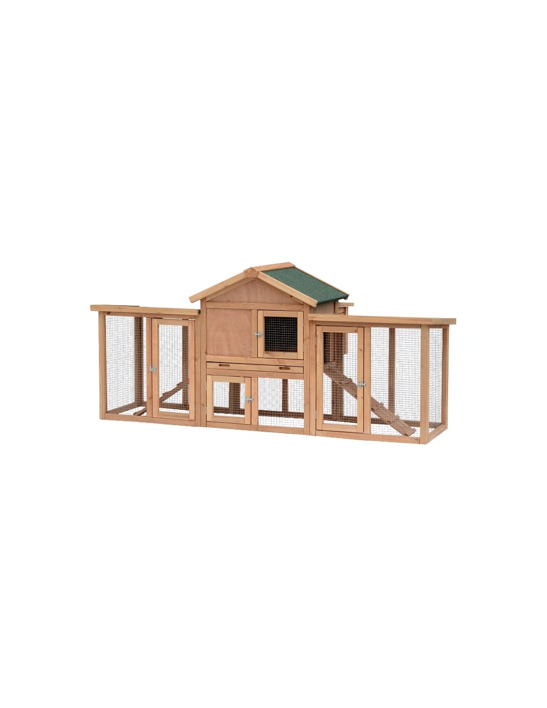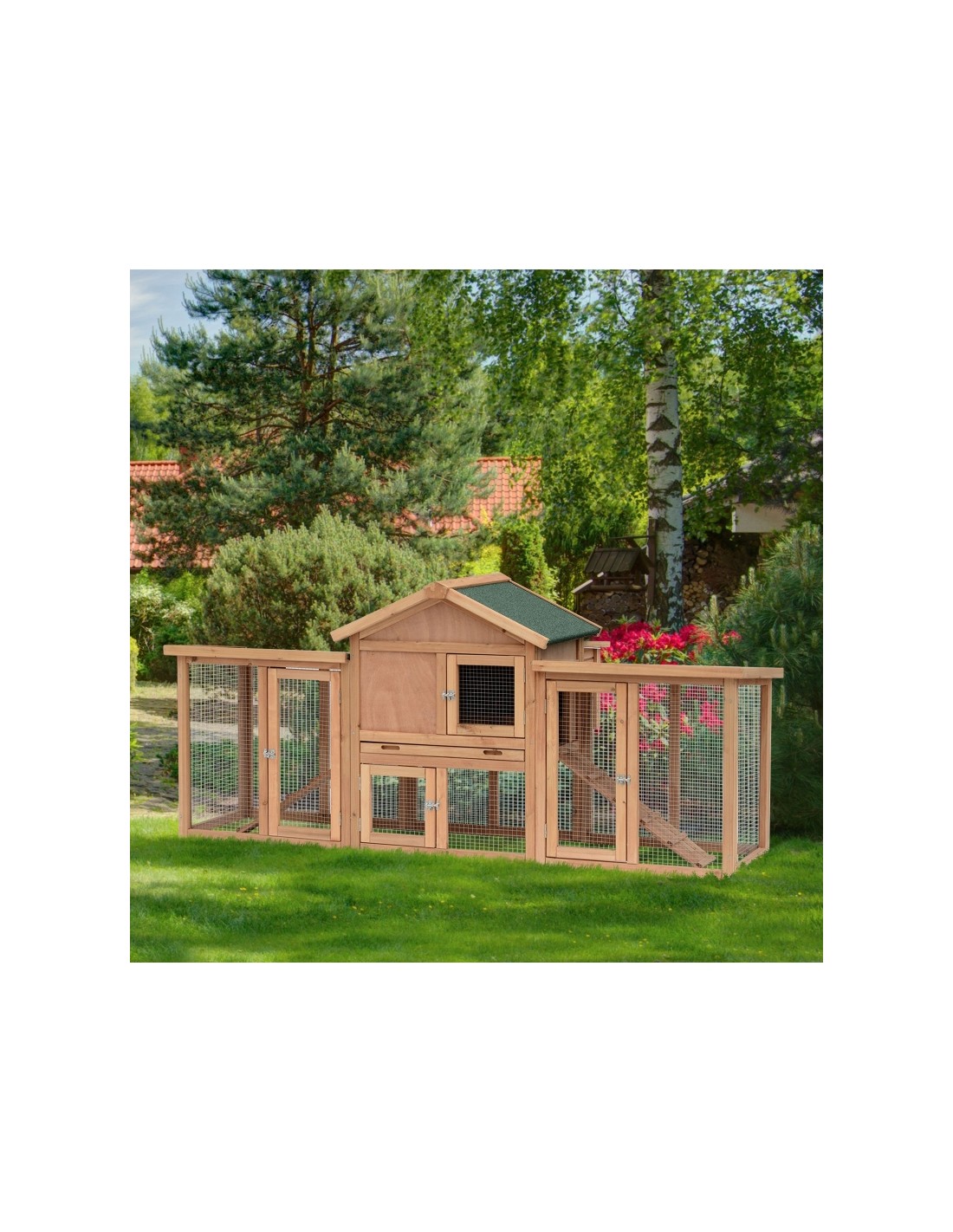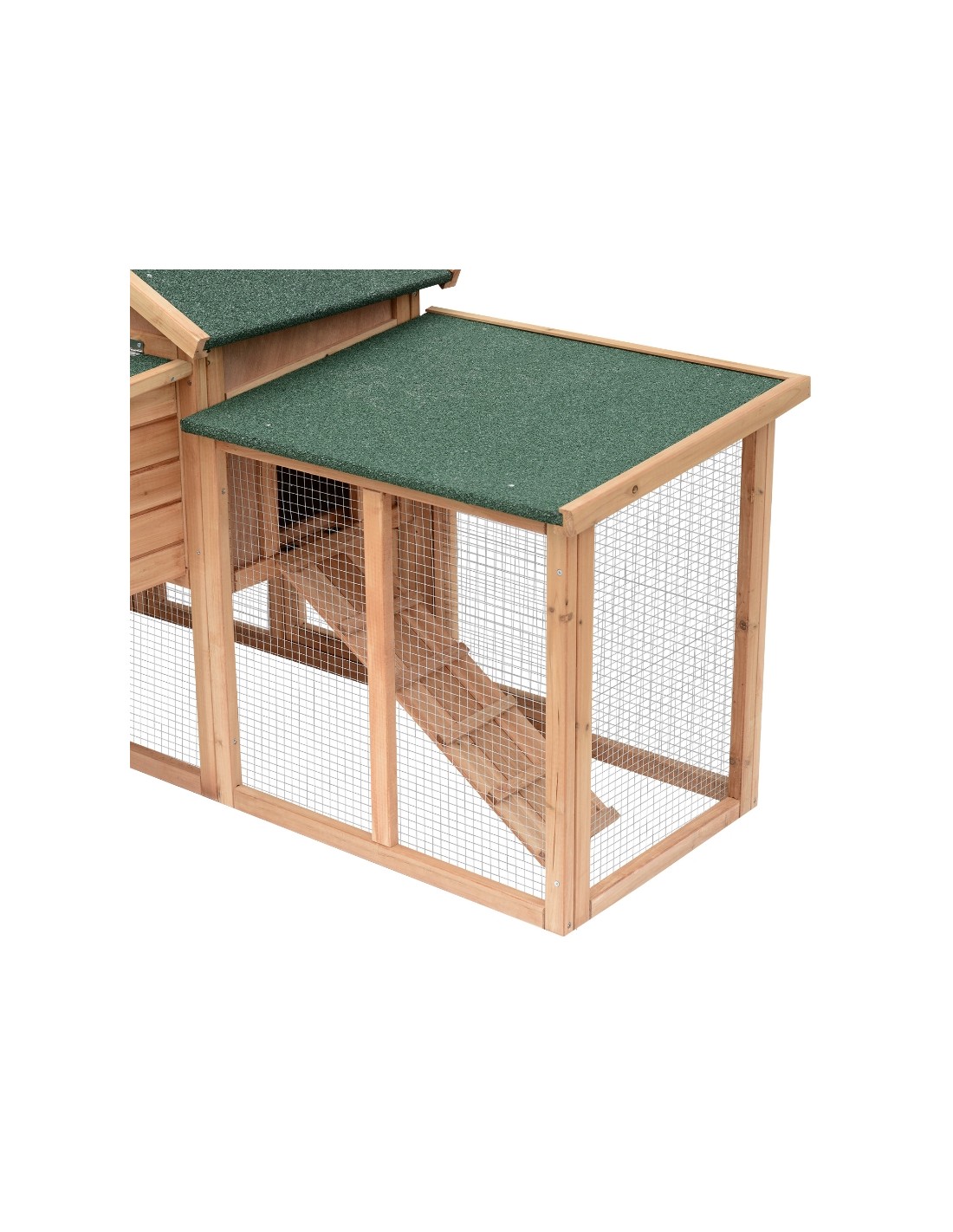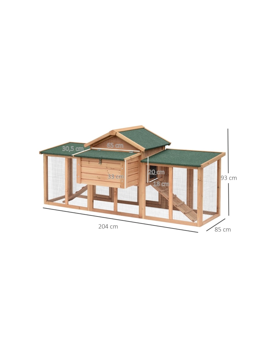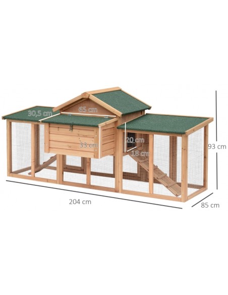 Hønsehus udført i et design af lakeret fyrretræ og tagpap. Hønsehuset måler 93 cm i højden og 204 x 85 cm i bredde og dybde. Hønsehuset er anvendeligt til 2 høns.