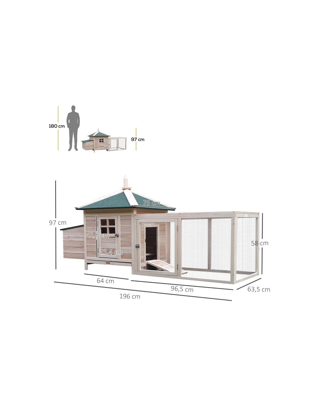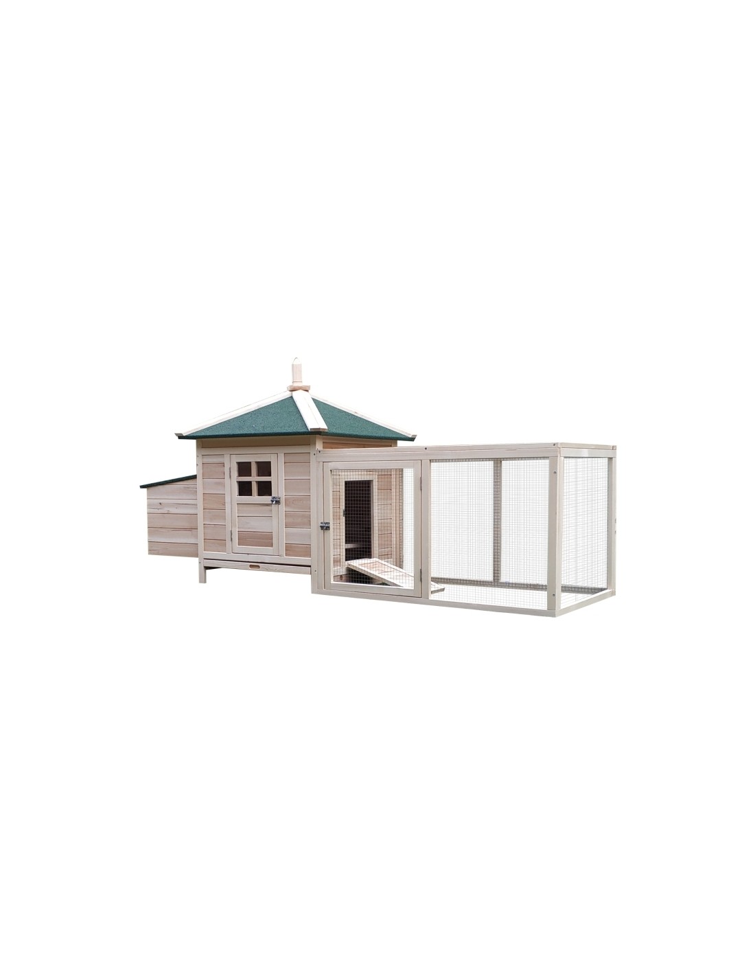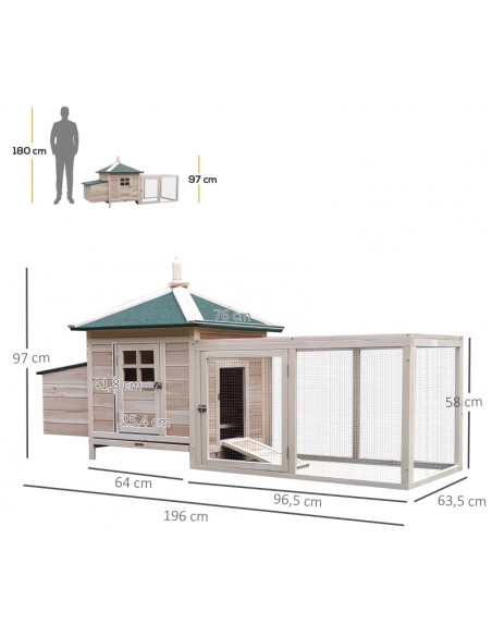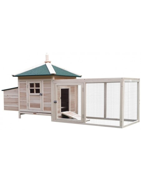 Hønsehus udført i et design af fyrretræ. Hønsehuset måler 97 cm i højden og 196 x 76 cm i bredde og dybde. Hønsehuset er anvendeligt til 2 høns.
