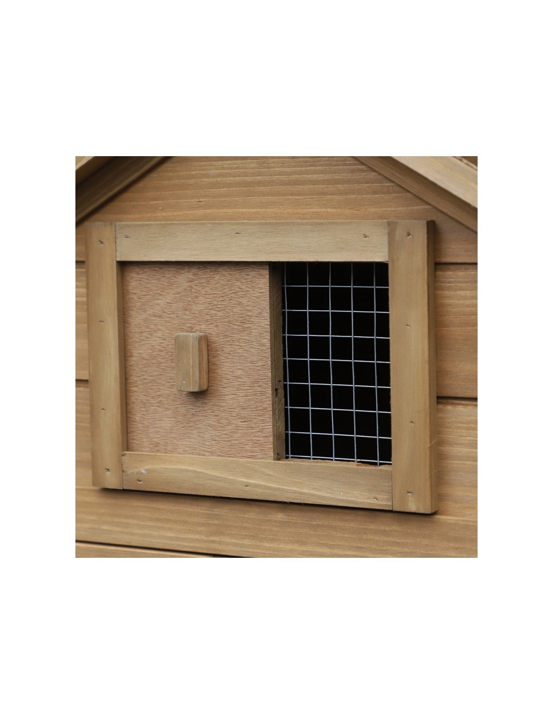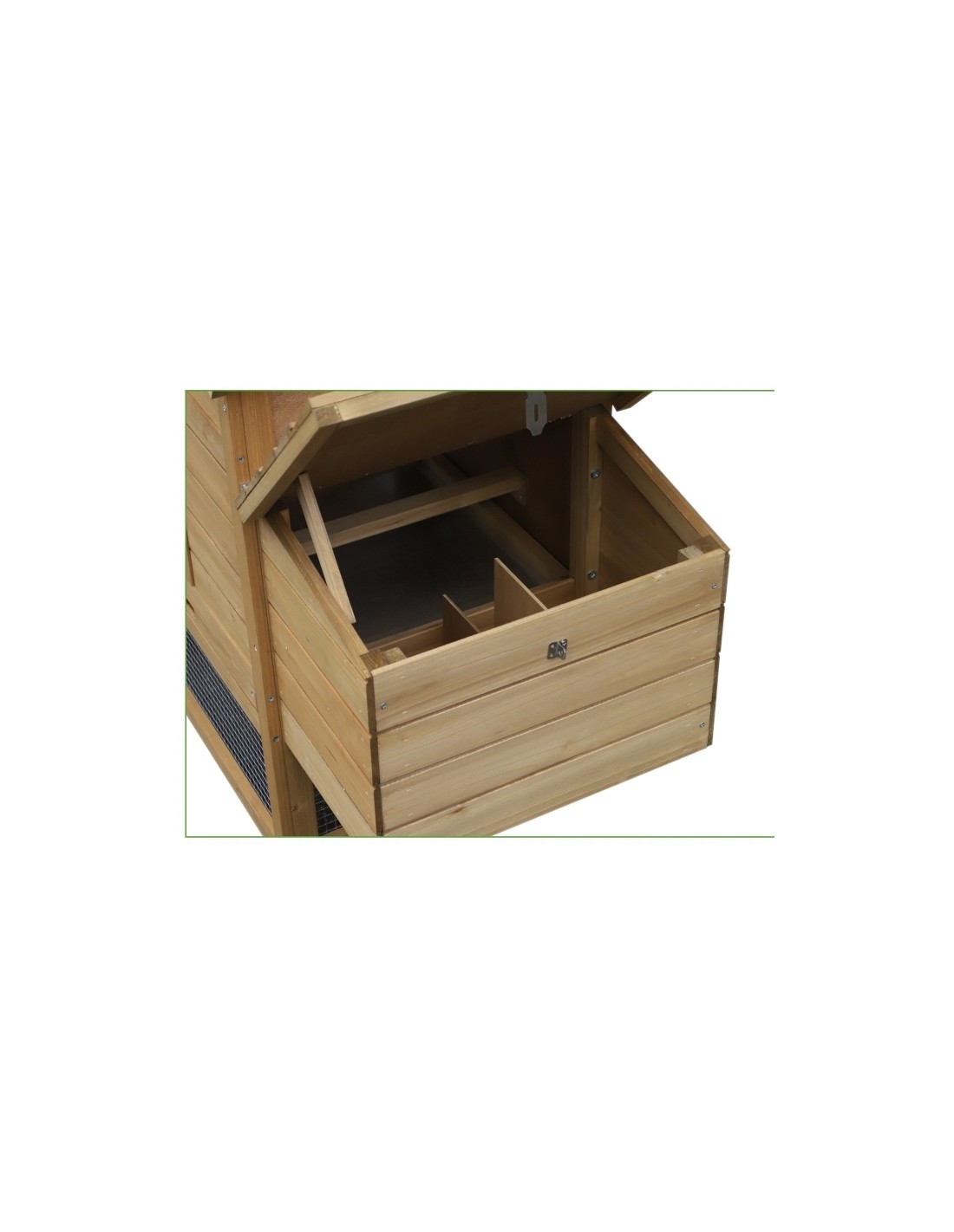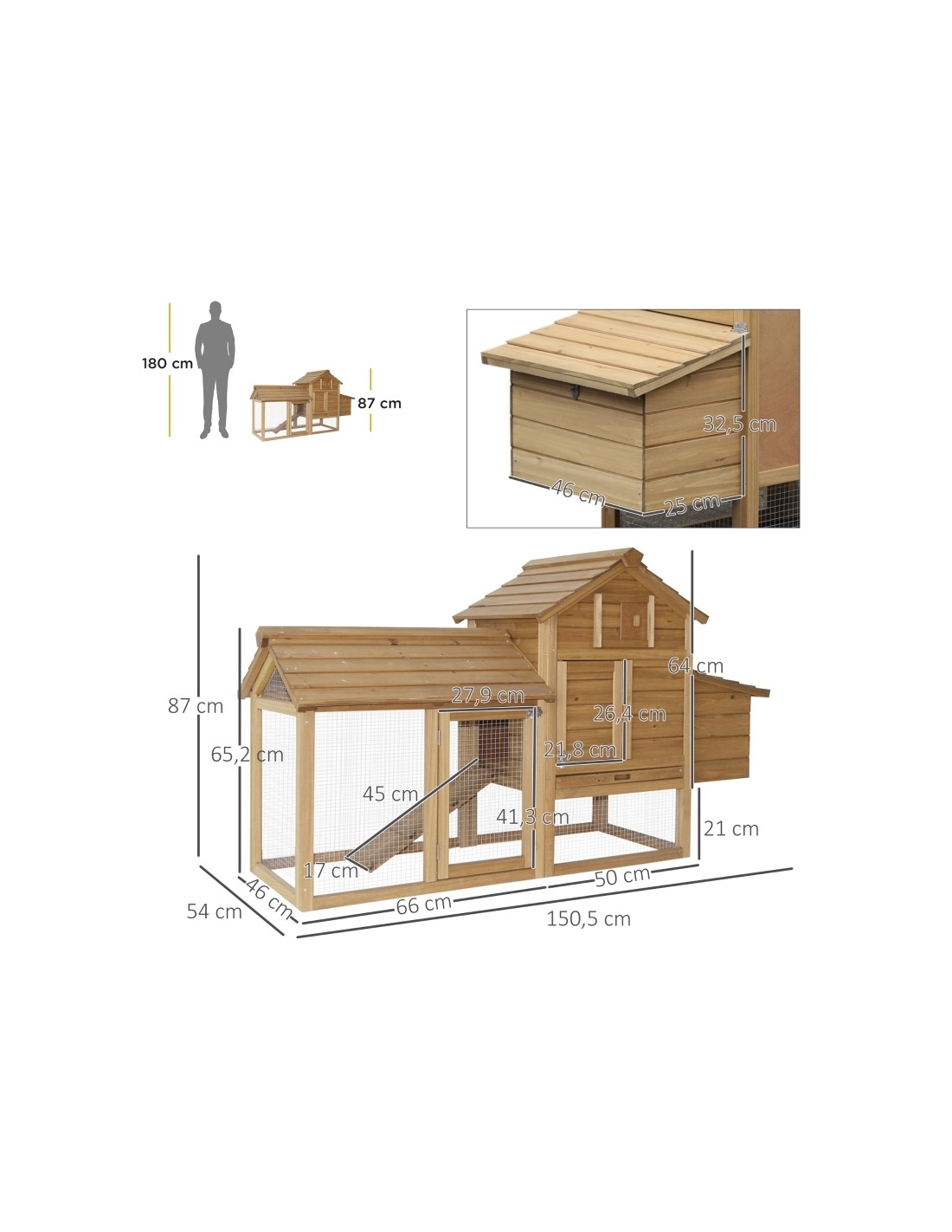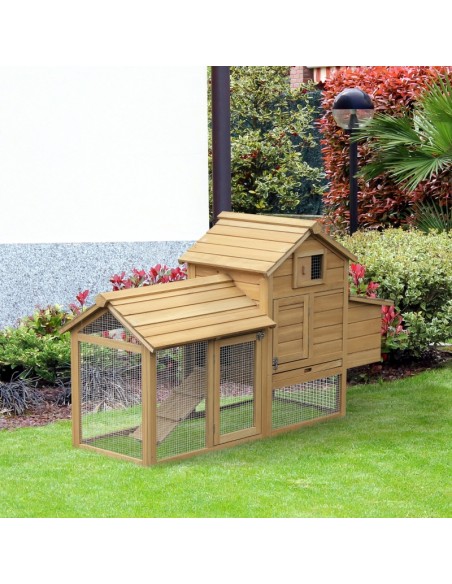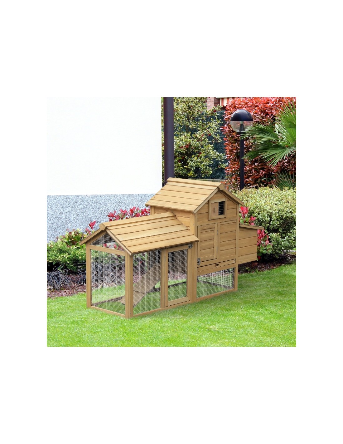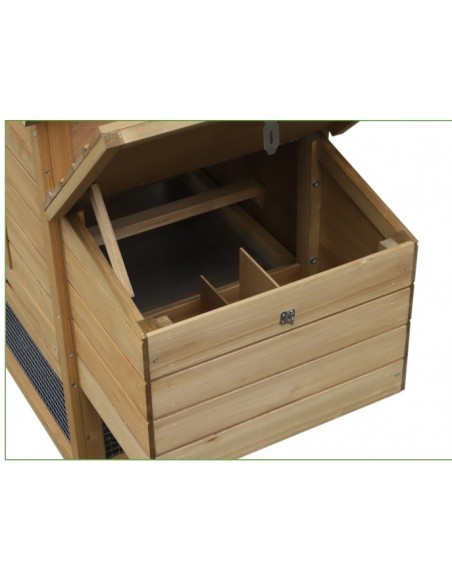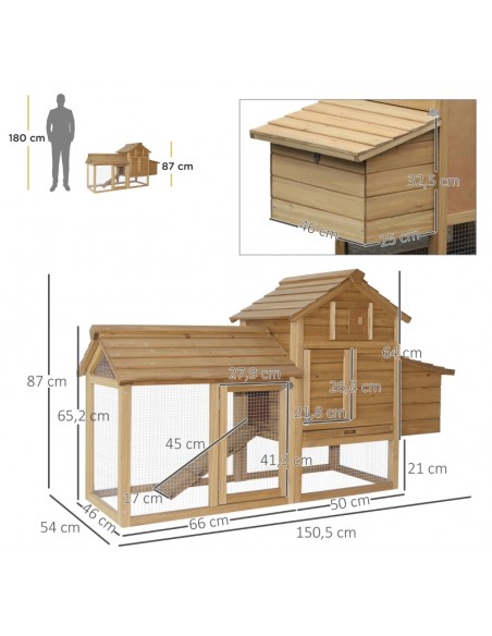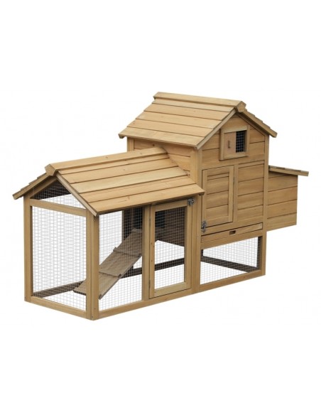 Hønsehus udført i et design af lakeret fyrretræ. Hønsehuset måler 87 cm i højden og 150,5 x 54 cm i bredde og dybde. Hønsehuset er anvendeligt til 2 høns.