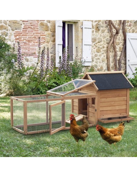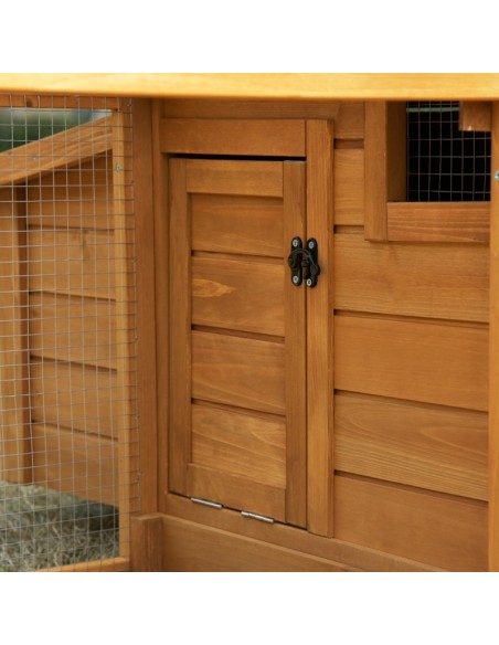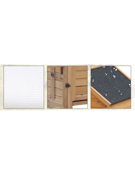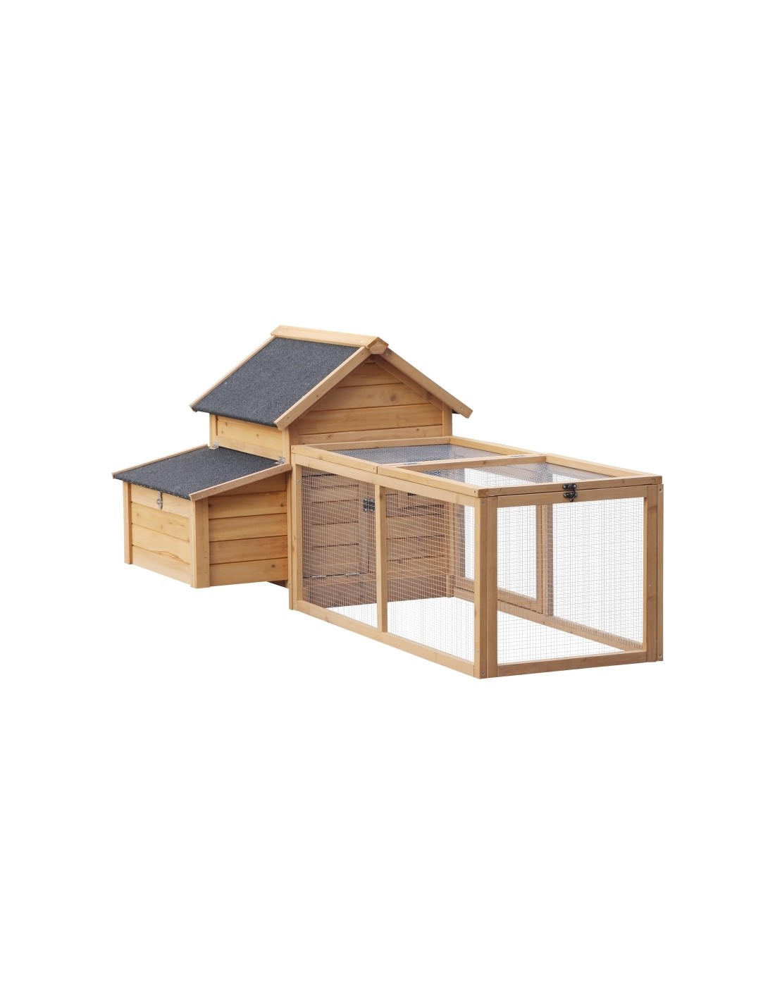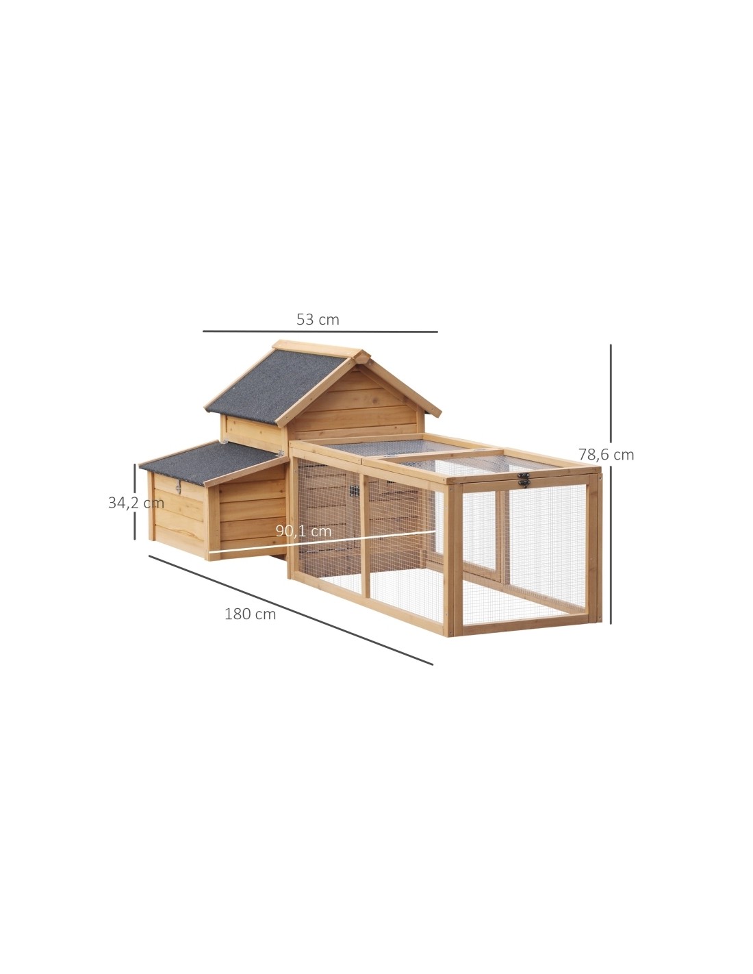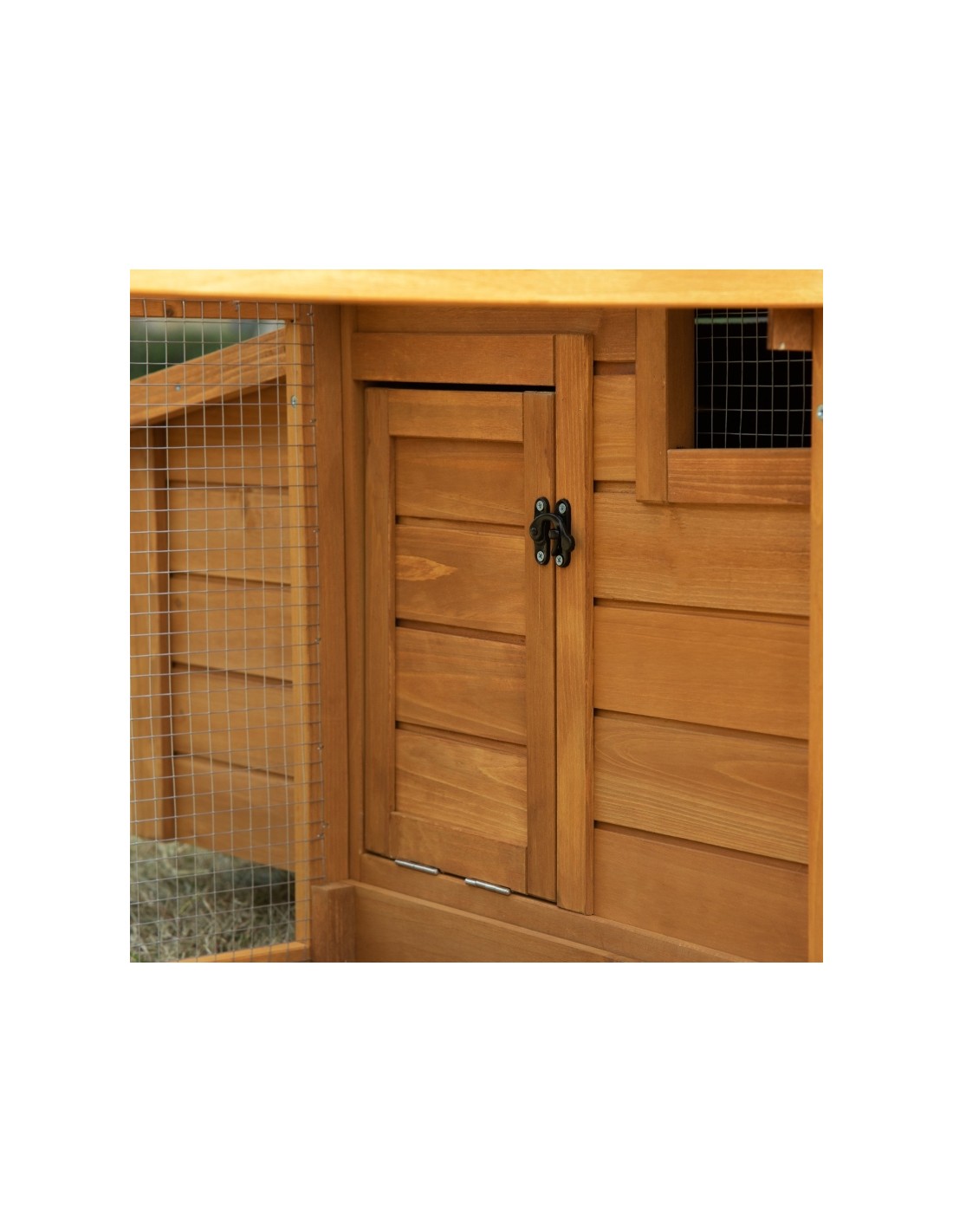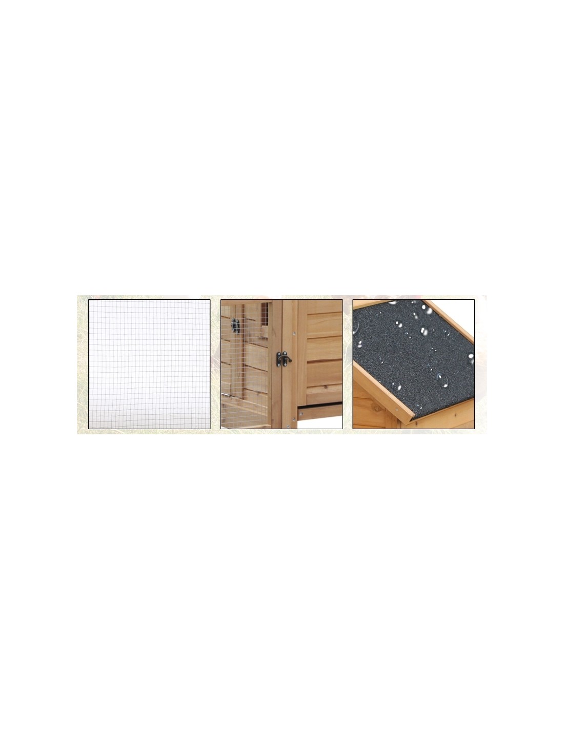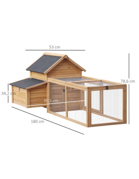 Hønsehus udført i et design af fyrretræ. Hønsehuset måler 78,6 cm i højden og 180 x 92 cm i bredde og dybde. Hønsehuset er anvendeligt til 2 høns.