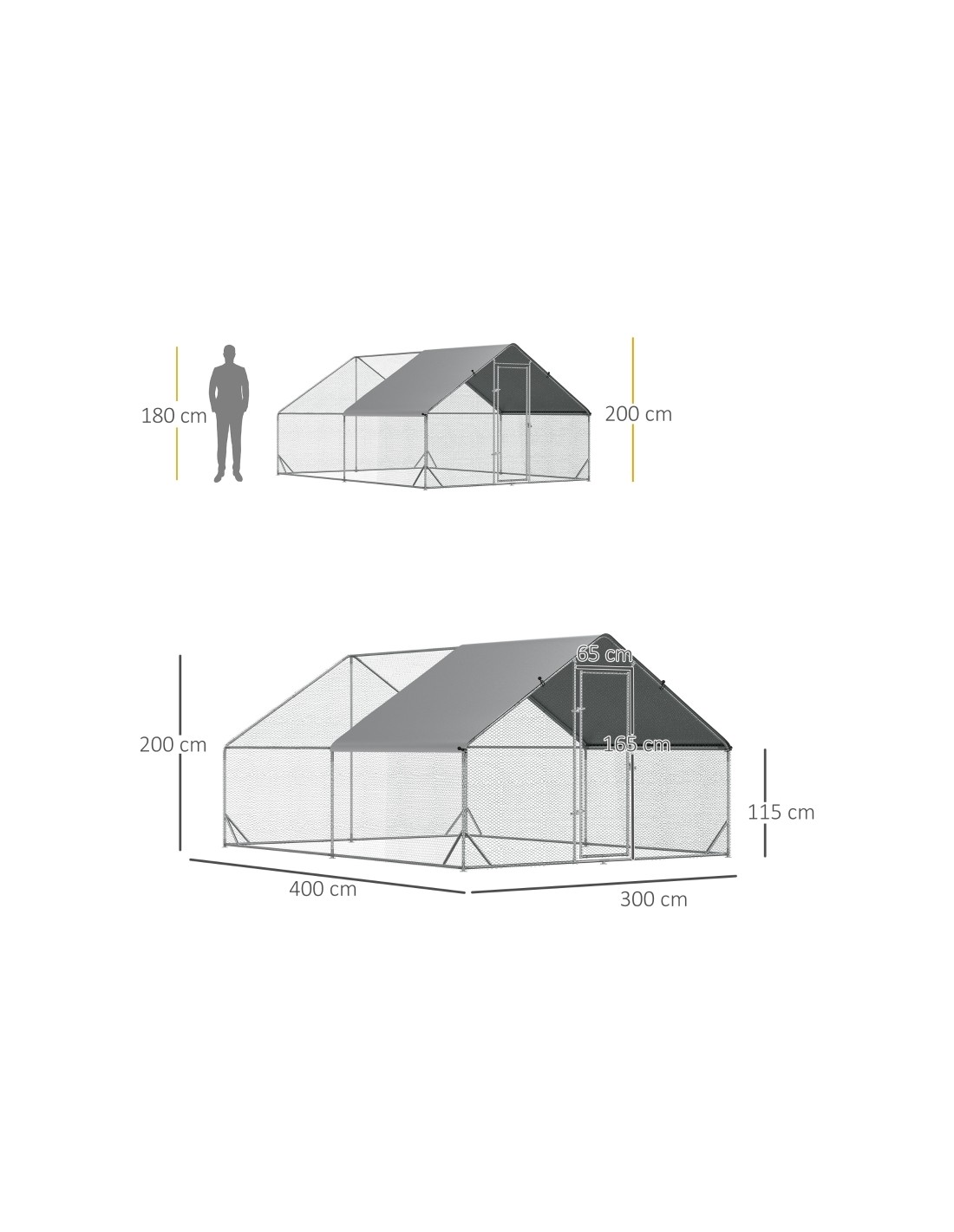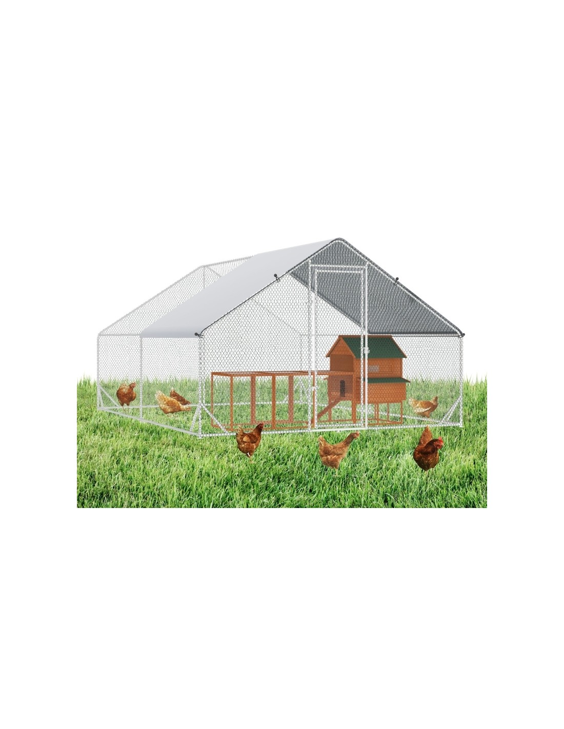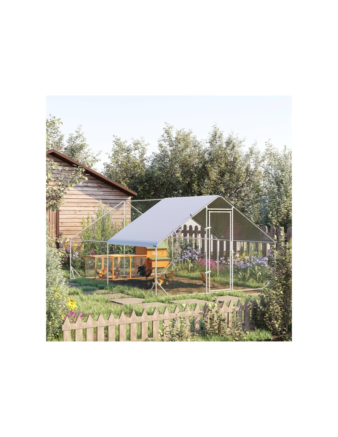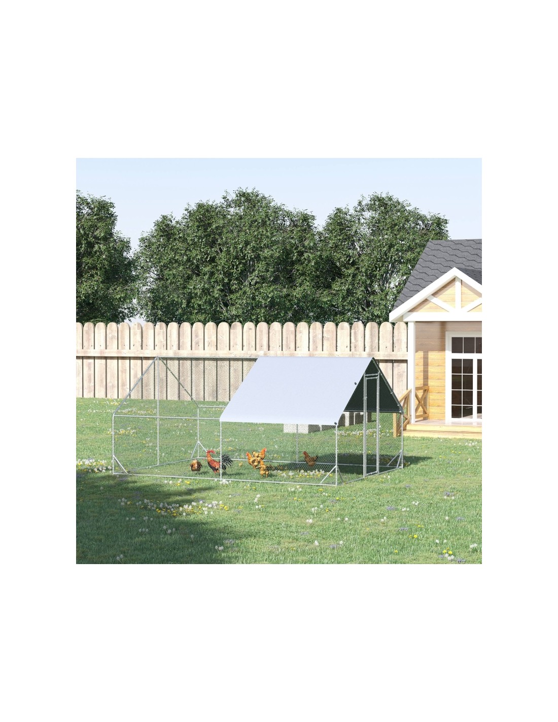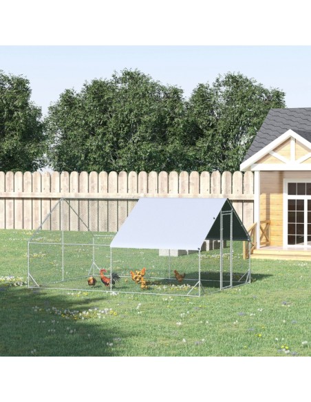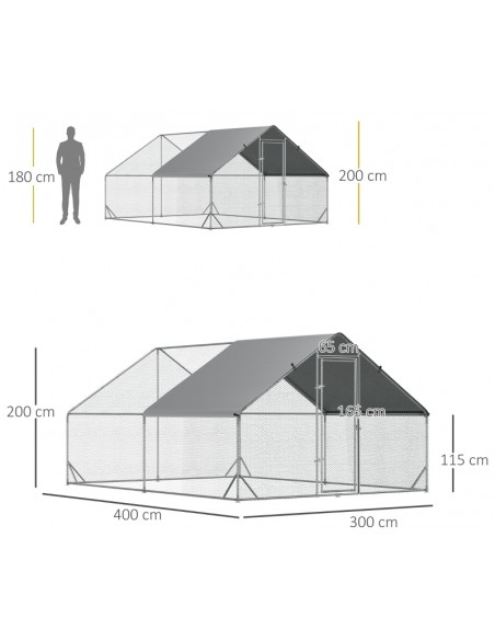Hønse indhegning udført i et design af forzinket stål. Hønse indhegningen måler 200 cm i højden og 400 x 300 cm i bredde og dybde. Indhegningen er anvendelig til 8 - 12 høns. Med dække i polypropylene.