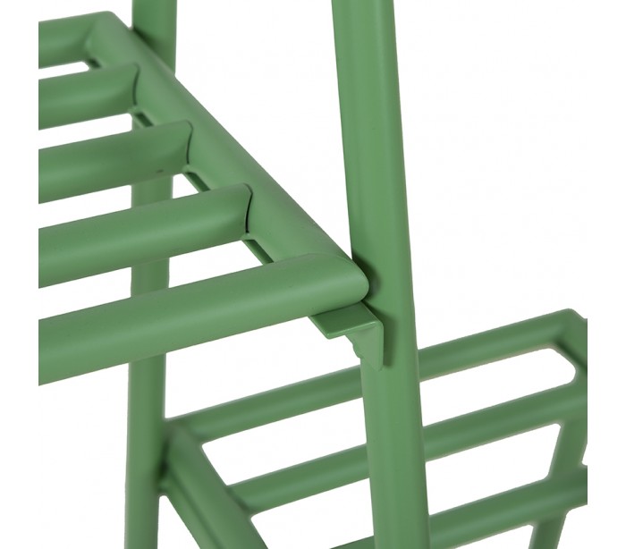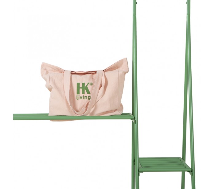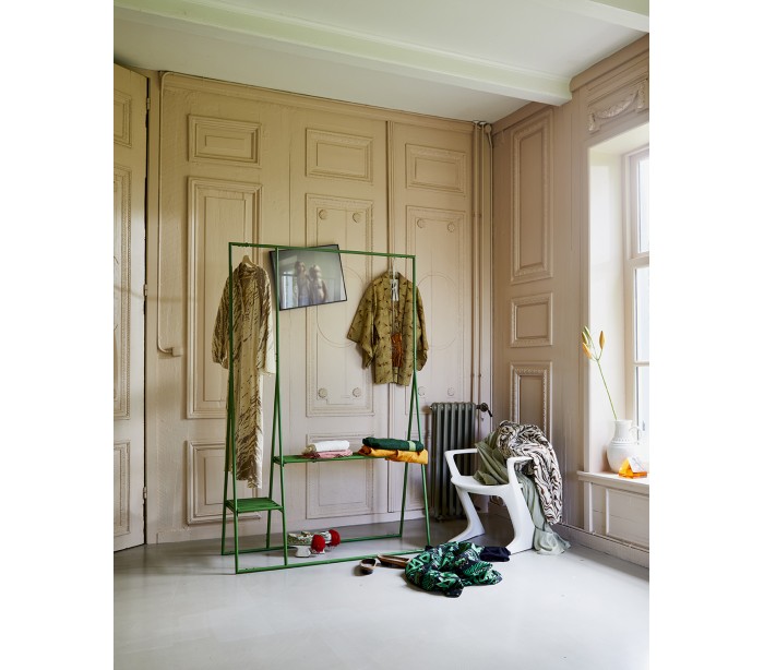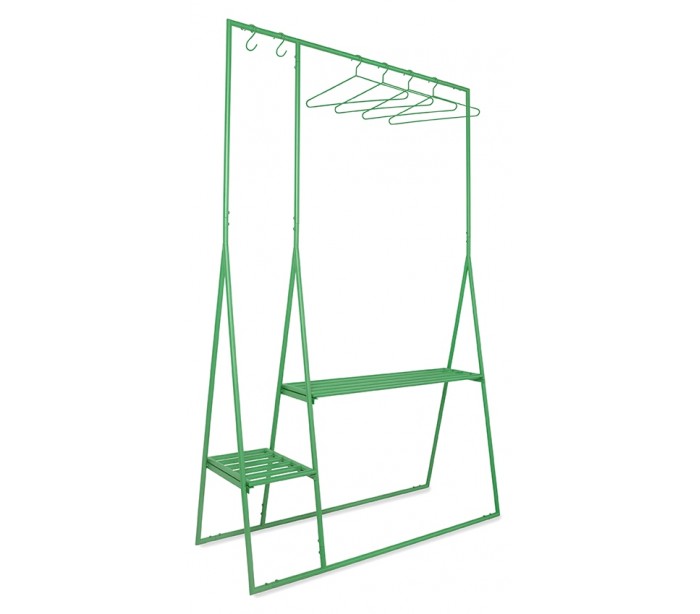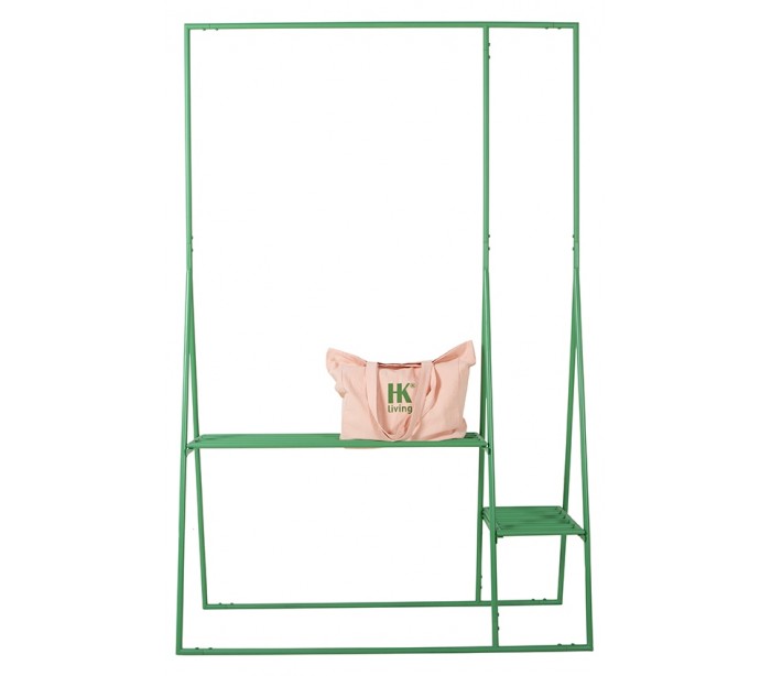 Garderobe stativ udført i et design af grønlakeret metal. Stativet måler 194 cm i højden og 124 cm i bredden. Der medfølger 4 bøjler og 2 kroge. Tilkøb ikke muligt.