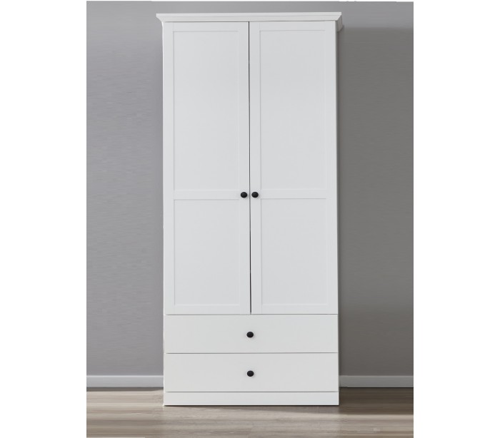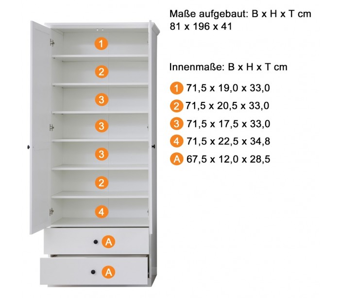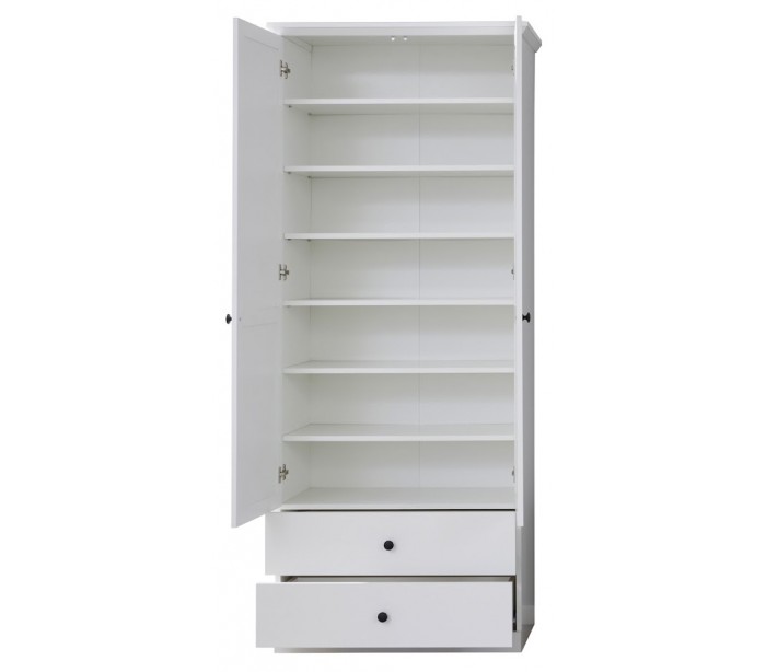 Baxter skoskab udført i et design af hvid møbelplade. Skoskabet måler 196 cm i højden og 81 x 41 cm i bredde og dybde.