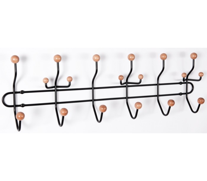 Sir James knagerække fra Lastein Interiør. Knagerækken er udført i sortlakeret metal og med knopper i massiv eg med nøddetræslook. Knagerækken måler 79 cm i bredden og 24,5 cm i højden.