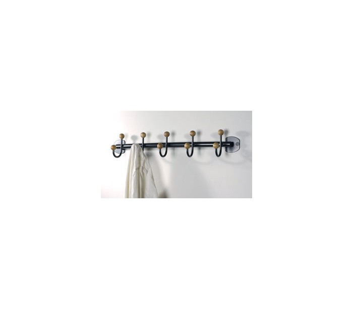 Sir James knagerække fra Lastein Interiør. Knagerækken er udført i sortlakeret metal og med knopper i massiv eg med nøddetræslook. Knagerækken måler 62 cm i bredden og 12 cm i højden.