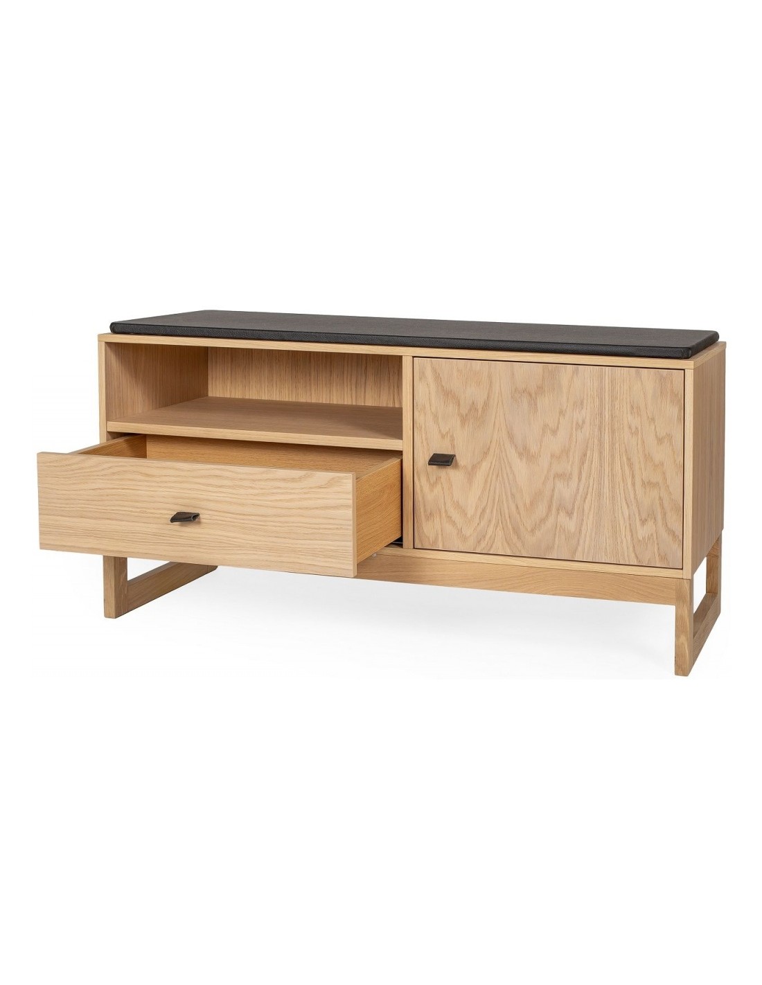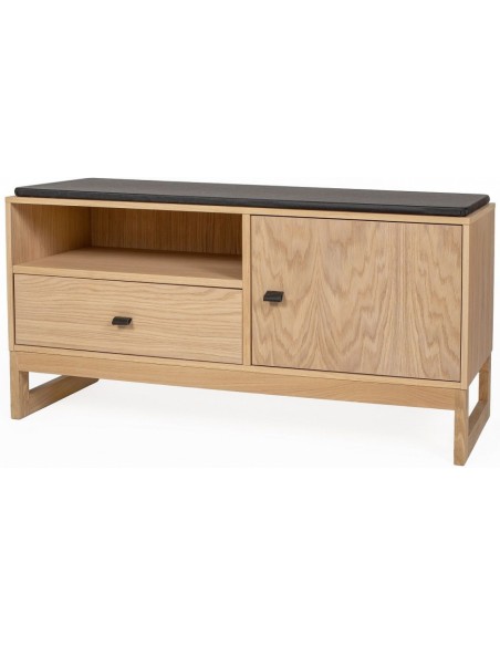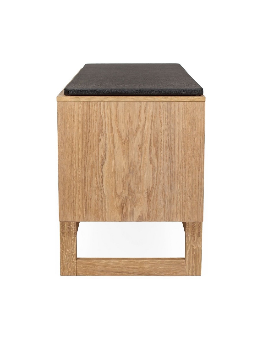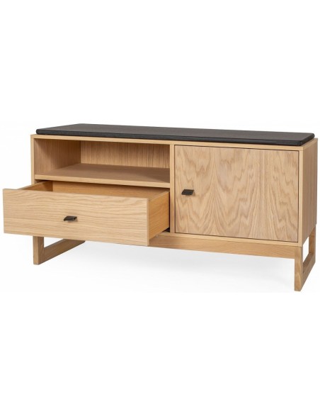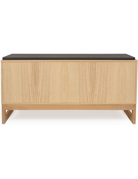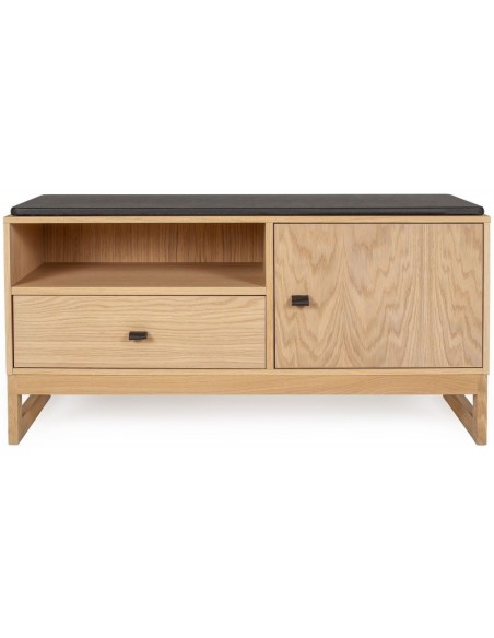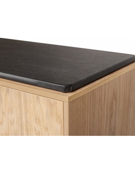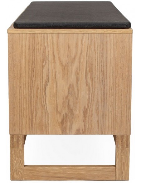 Entrebænk udført i et moderne design, fremstillet i massiv egetræ, egetræsfinér og faux læder. Bænken måler 100 cm i bredden og 48 cm i højden.