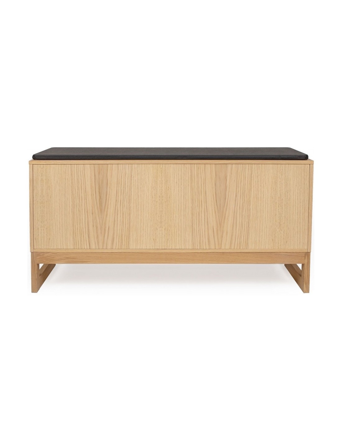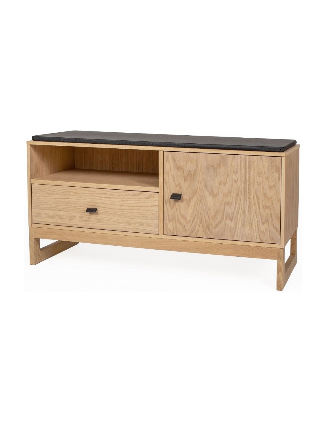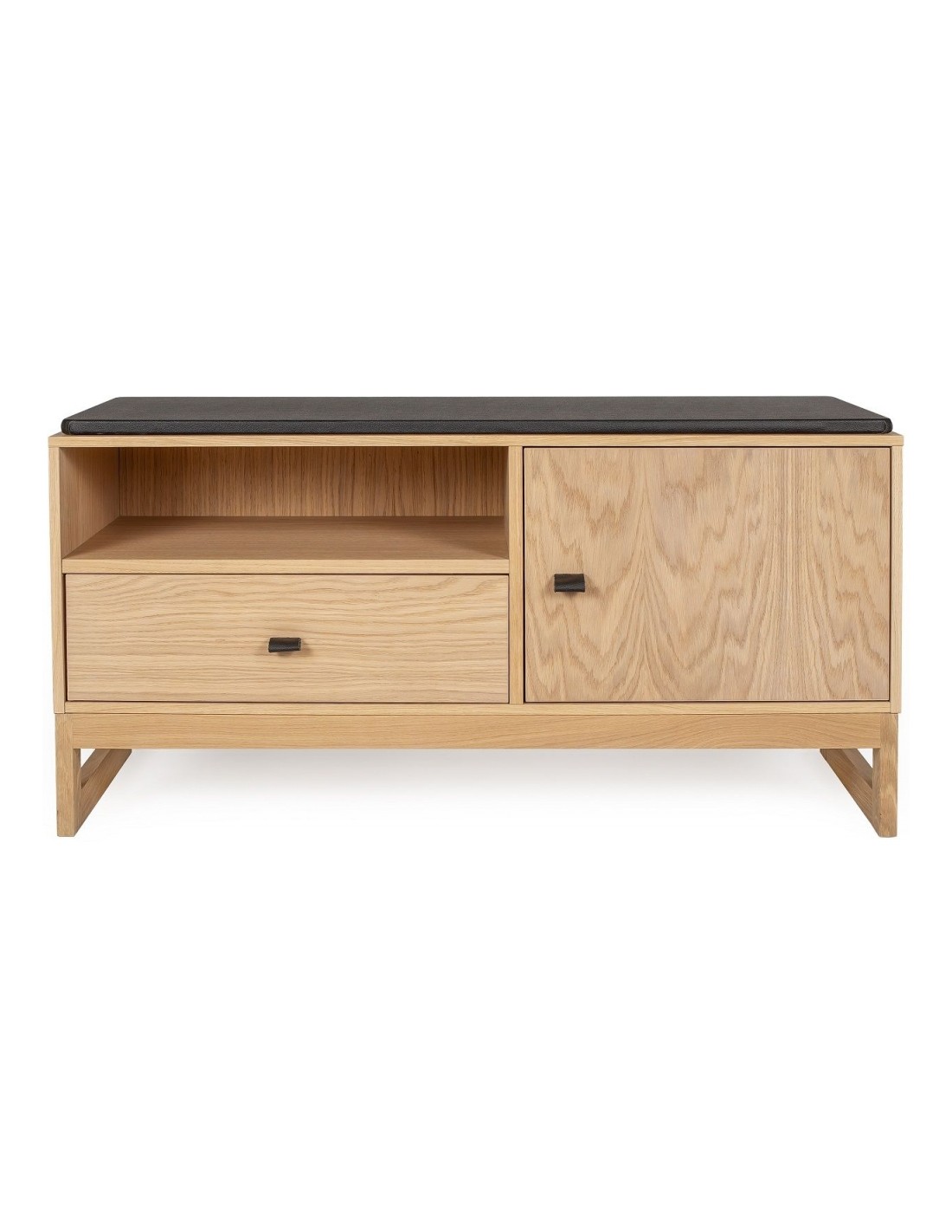 Entrebænk udført i et moderne design, fremstillet i massiv egetræ, egetræsfinér og faux læder. Bænken måler 100 cm i bredden og 48 cm i højden.