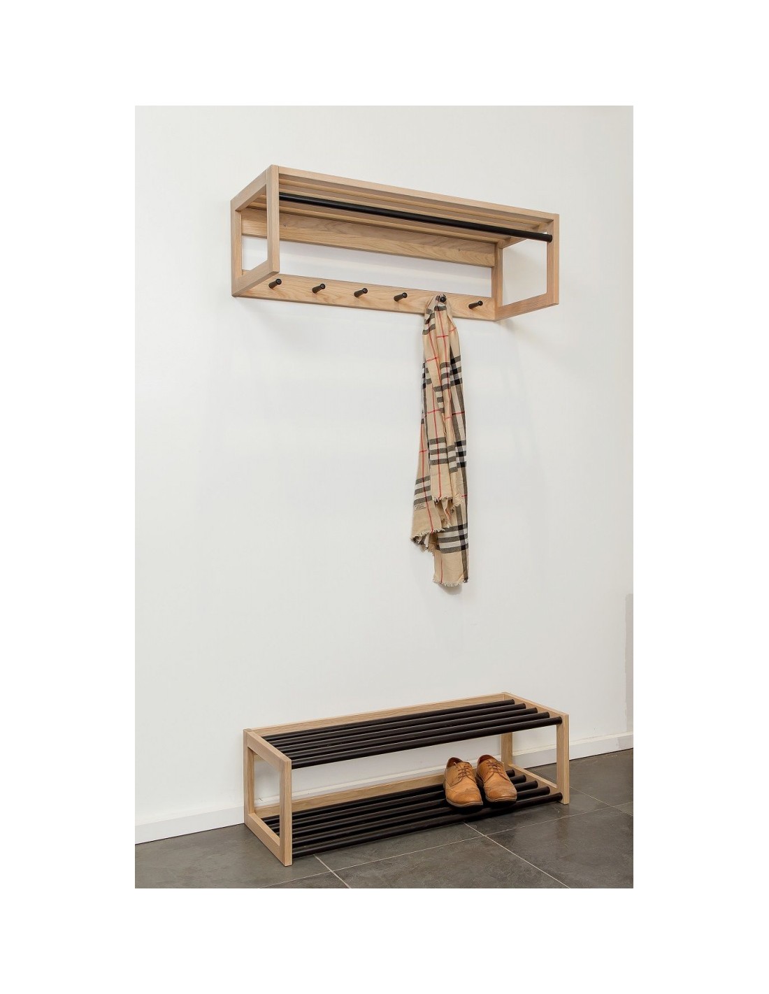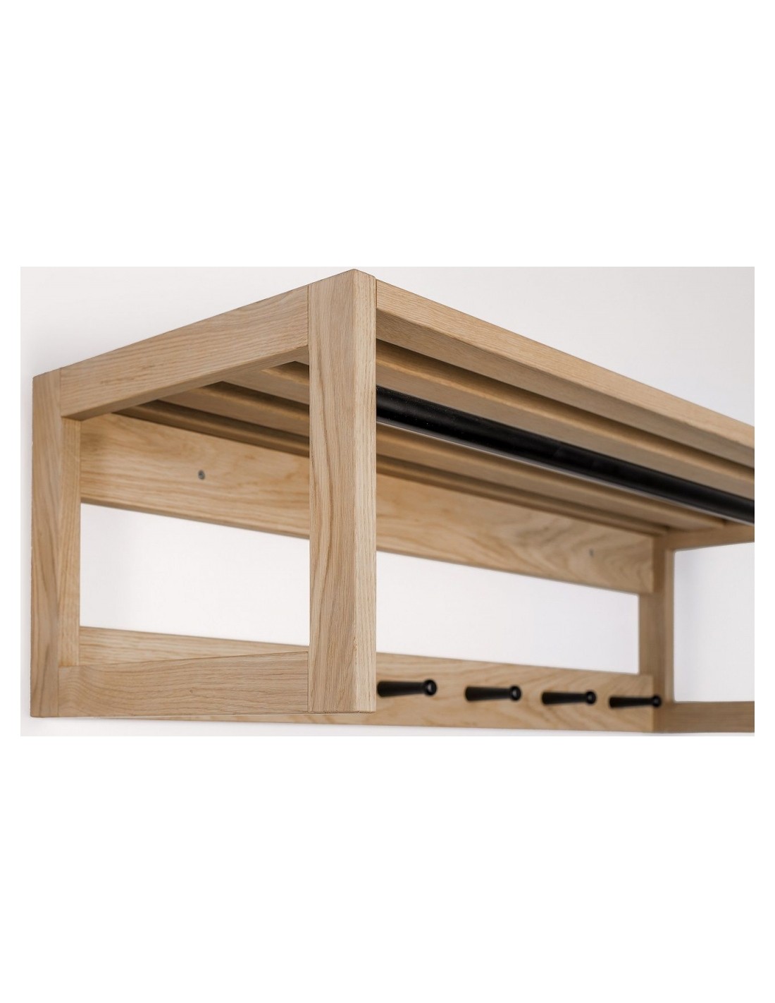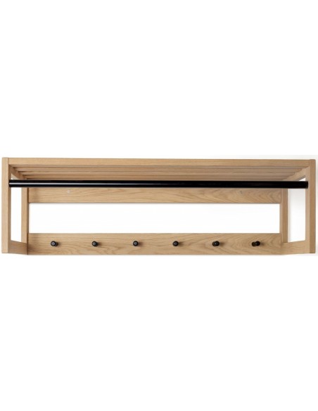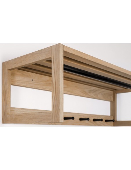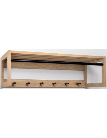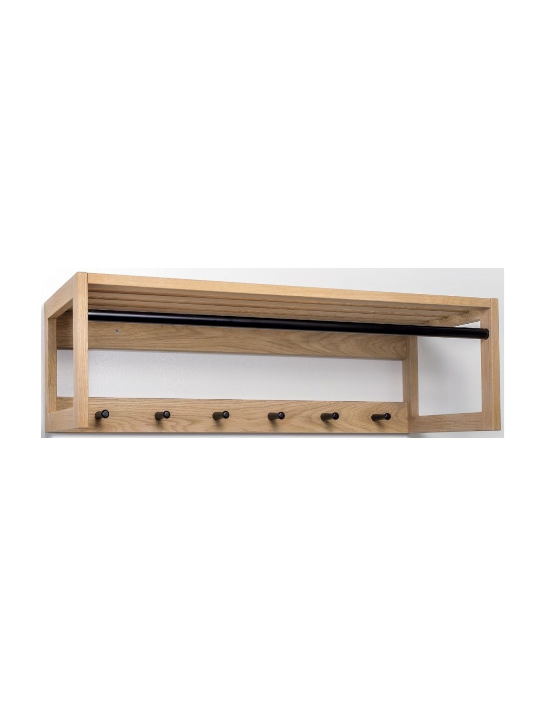 Knagerække udført i et moderne design, fremstillet i massiv egetræ og sortlakeret stål. Knagerækken måler 100 cm i bredden og 38 x 30 cm i dybde og højde.