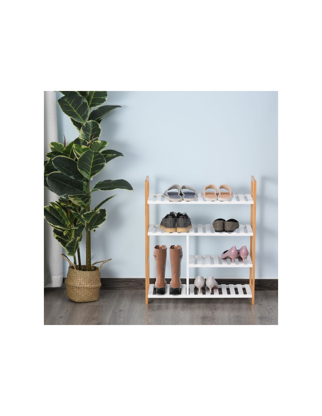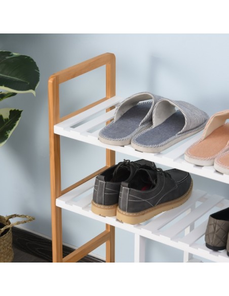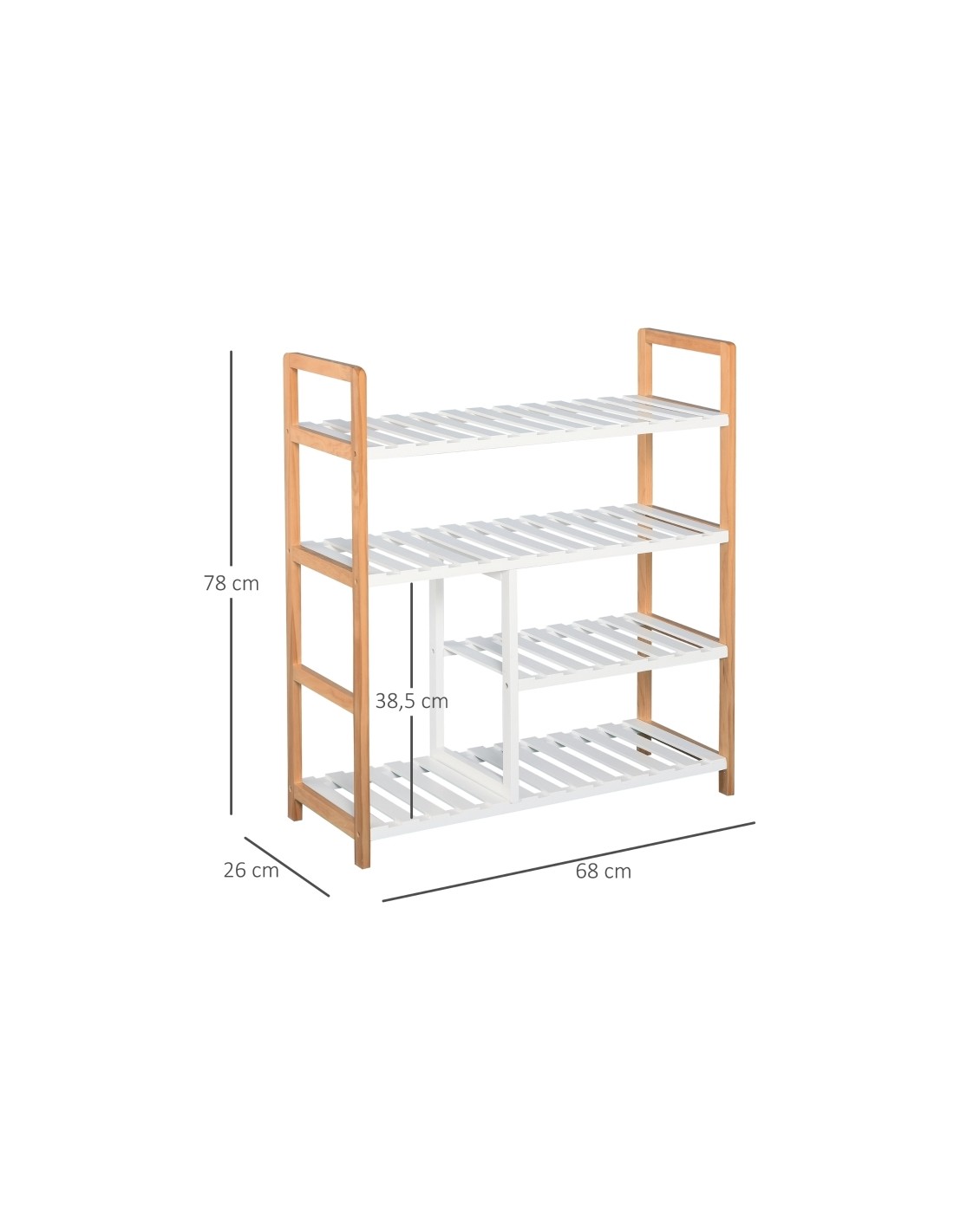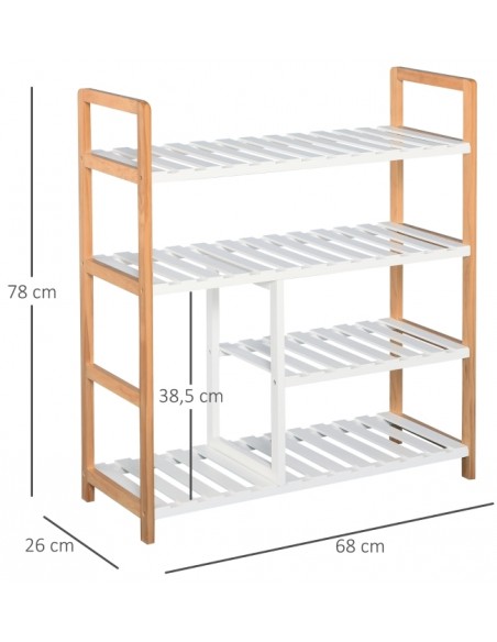 Skoreol udført i et design af fyrretræ og mdf. Reolen måler 68 x 26 cm i bredde og dybde og 78 cm i højden.