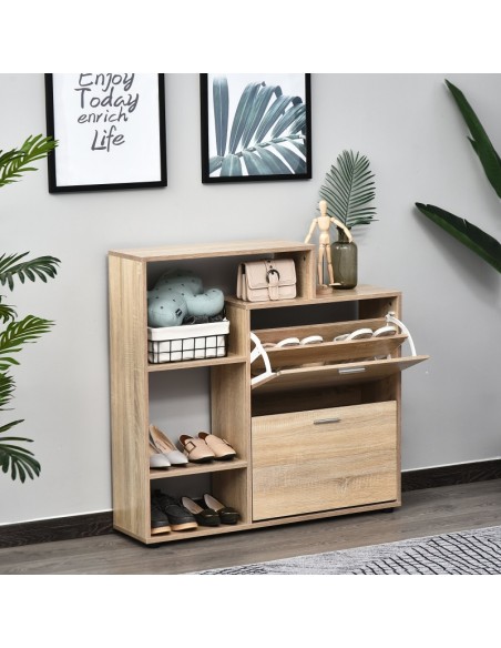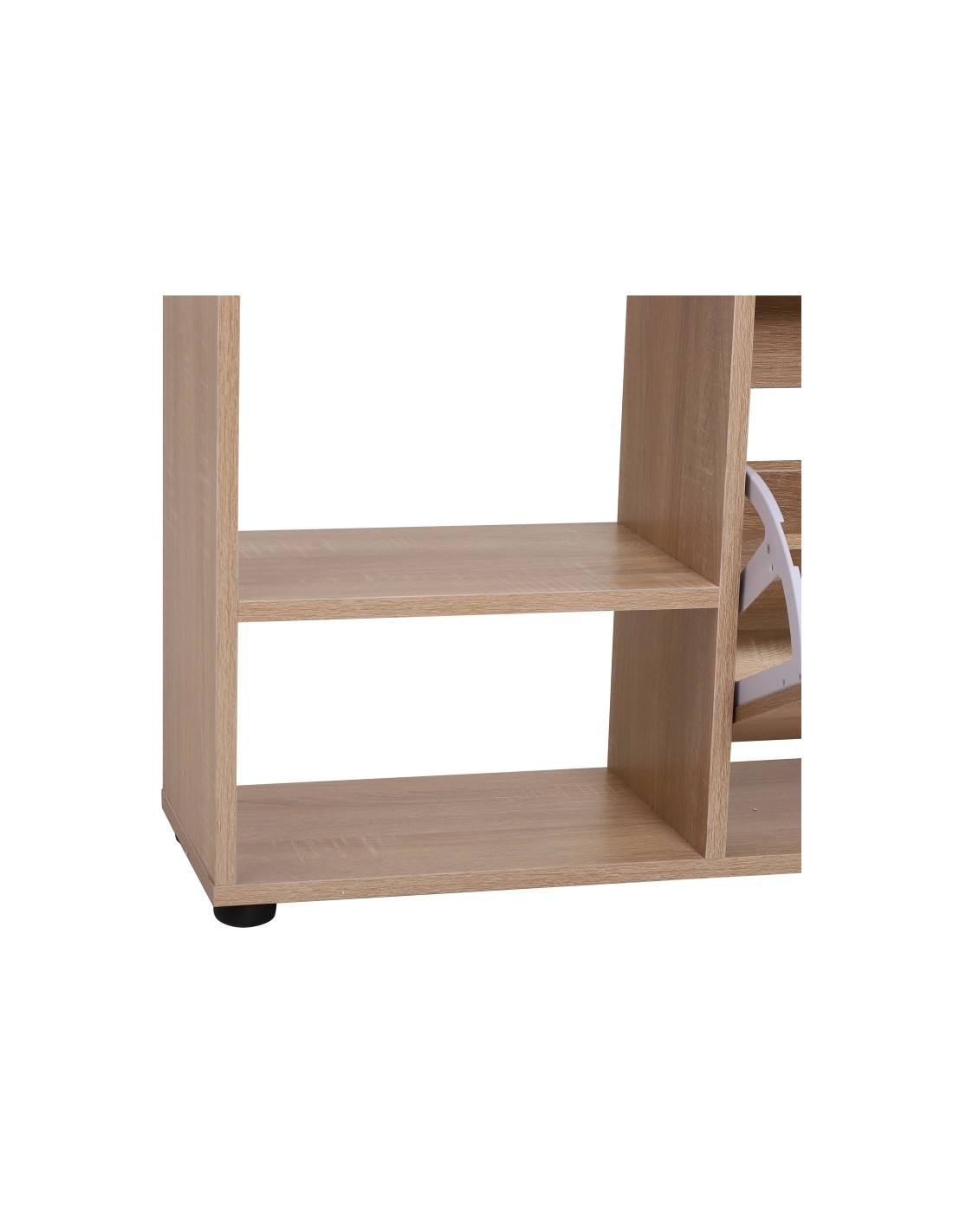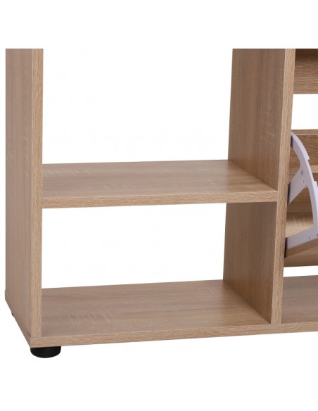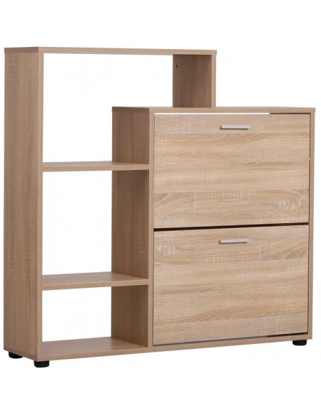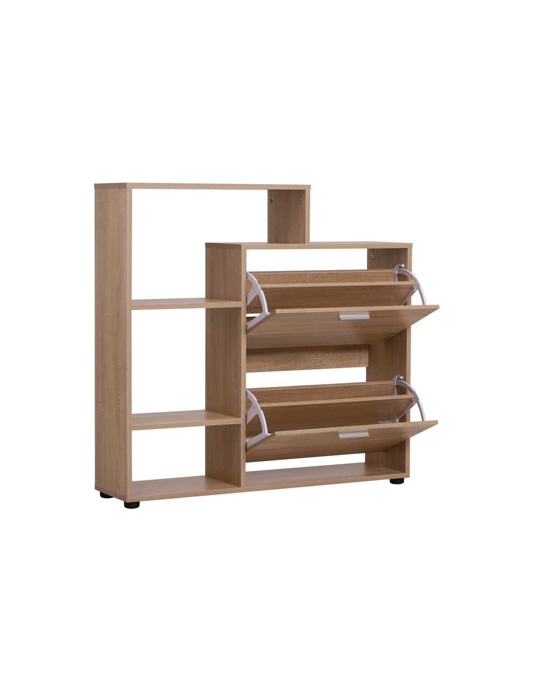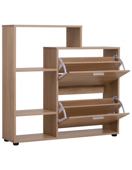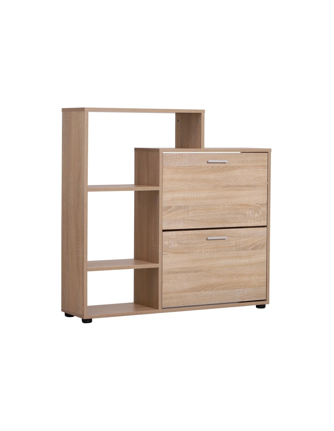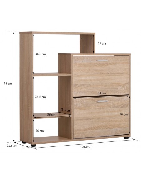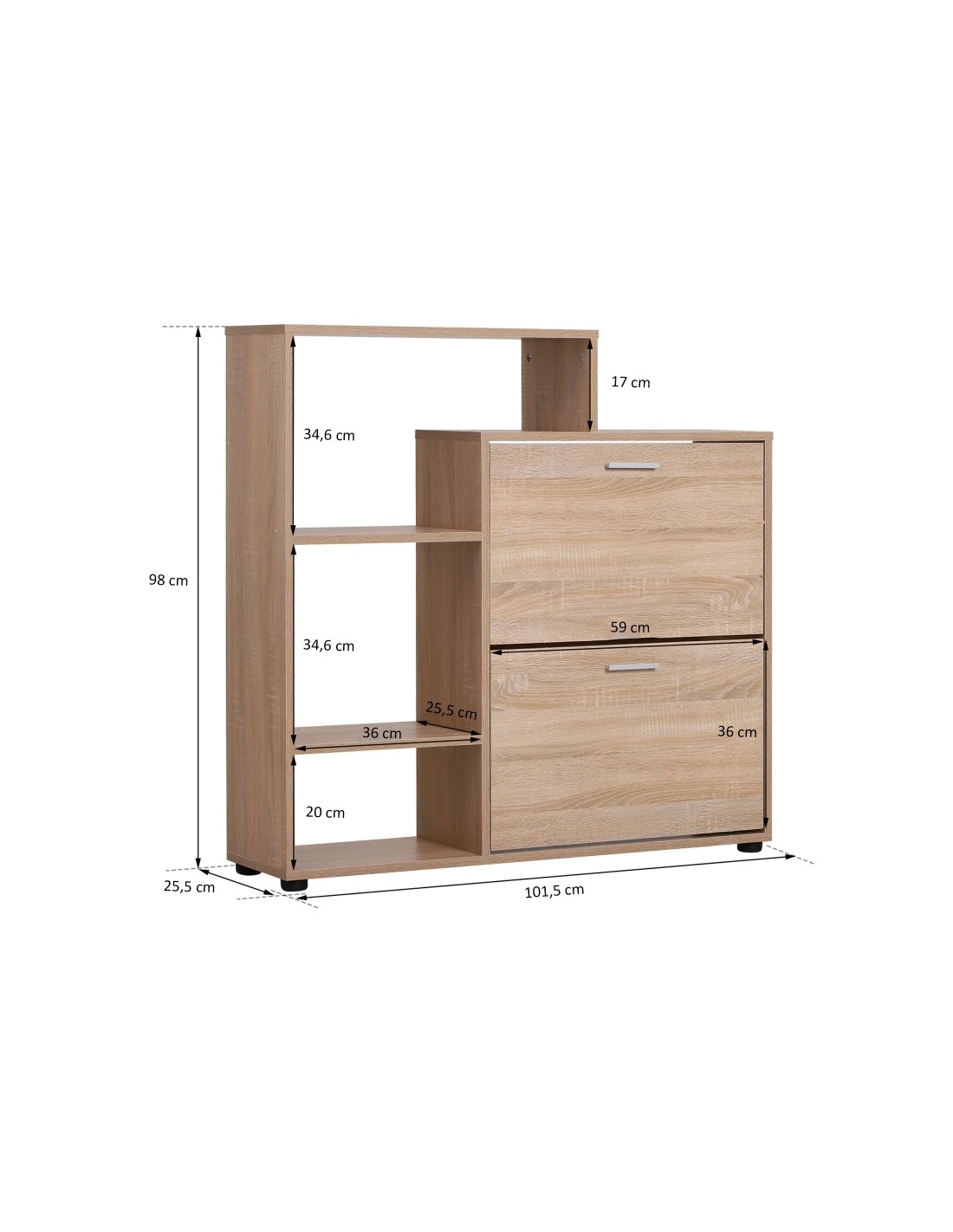 Skoskab udført i et design af møbelplade. Skoskabet måler 101,5 x 25,5 cm i bredde og dybde og 98 cm i højden. Skoskabet indeholder 3 åbne hylderum samt 2 skohylder bag skabslågerne. Skohylderne i skabene er justerbare således de kan tilpasses skoene.