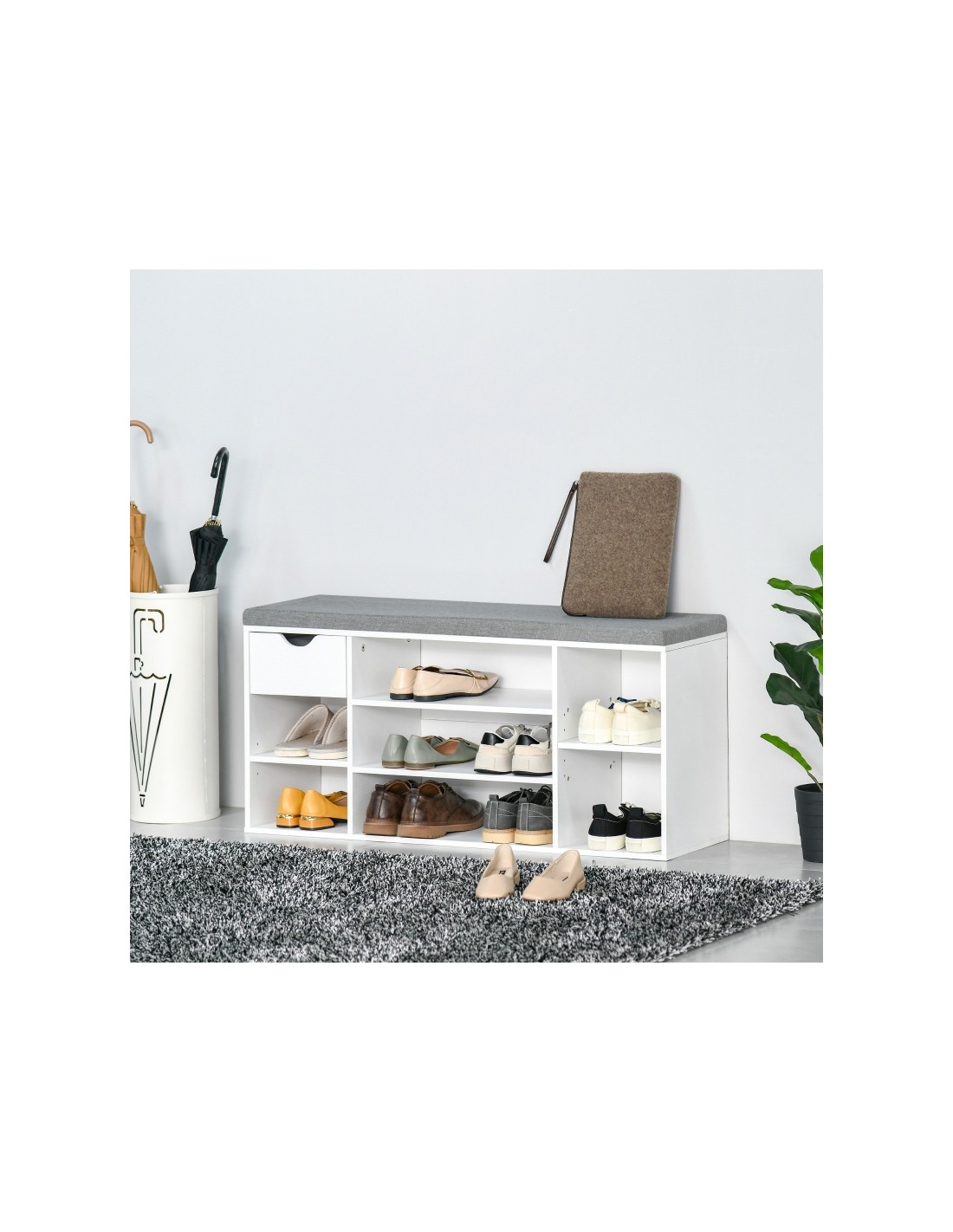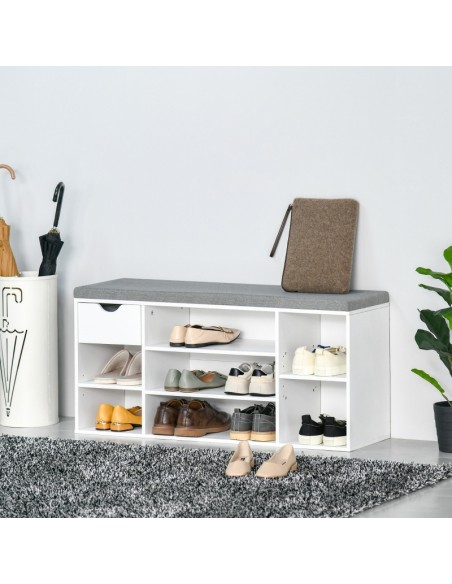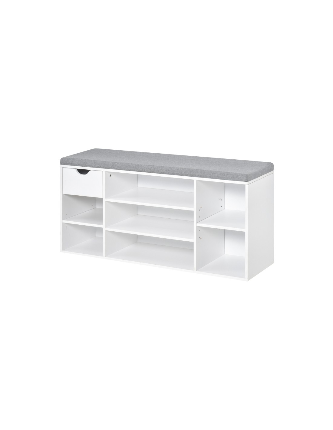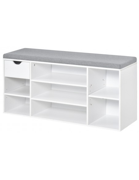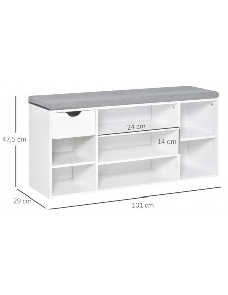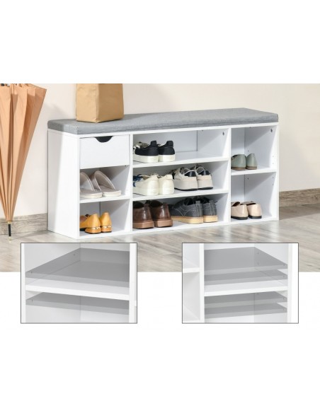 Skoreol udført i et design af møbelplade og polyester med skumfyld. Skoreolen måler 101 x 29 cm i bredde og dybde og 47,5 cm i højden. Skoreolen indeholder 1 skuffe samt 7 åbne hylderum, hvor hylderne kan justeres i højden, således de kan tilpasses skoene.