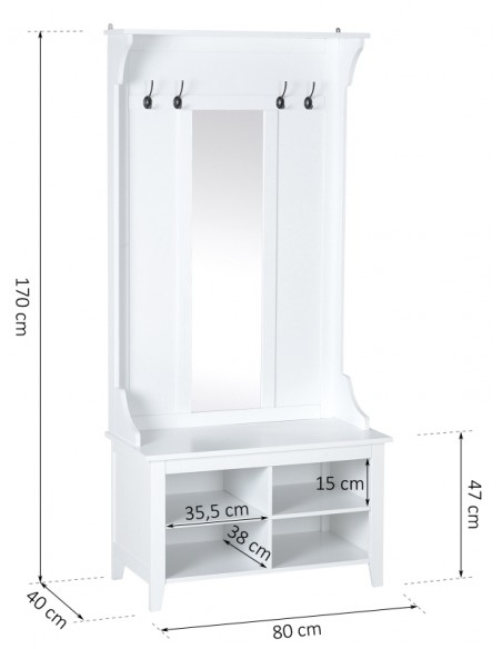 Garderobe med bænk, knager og 4 åbne hylderum til opbevaring, eksempelvis af sko. Garderoben er udført i møbelplade og MDF og måler 80 x 40 cm i bredde og dybde og 170 cm i højden.
