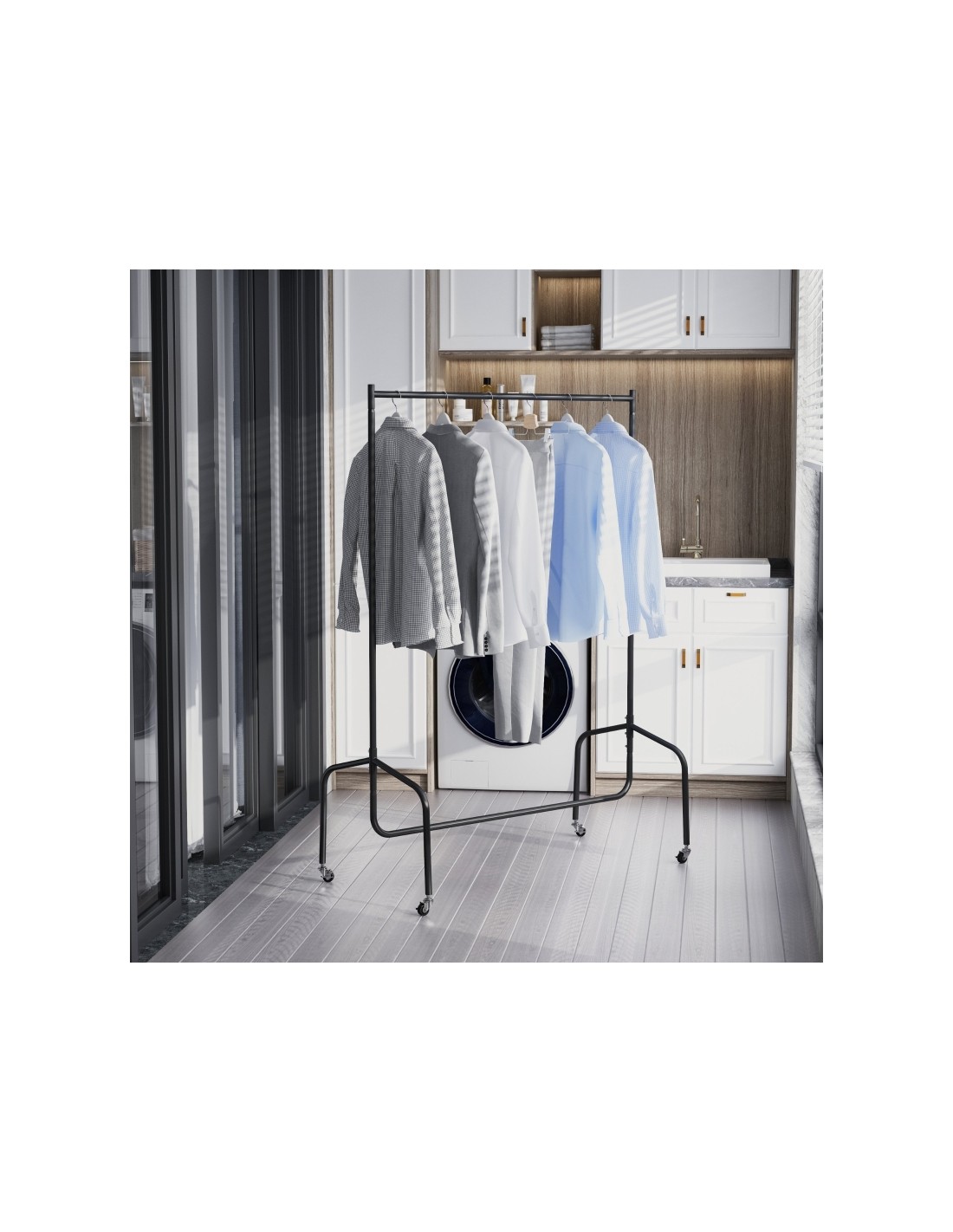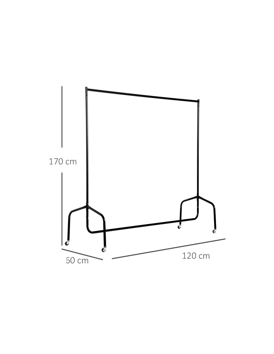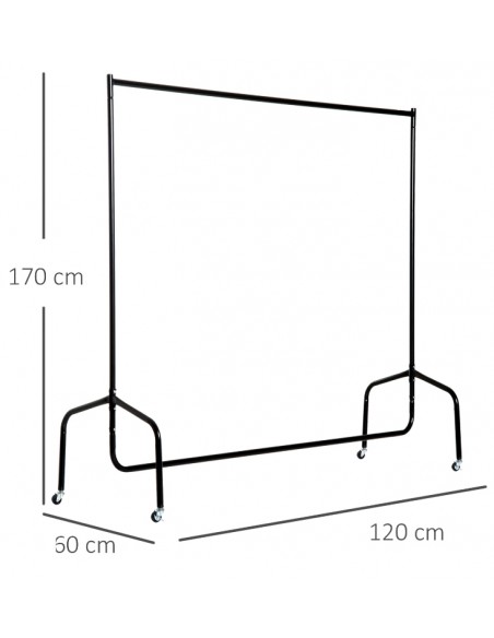 Tøjstativ udført i et design af metal. Tøjstativet er på hjul og måler 170 cm i højden og 120 x 60 cm i bredde og dybde.